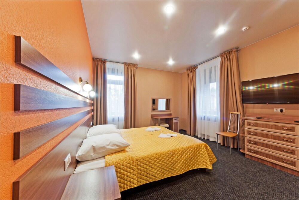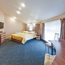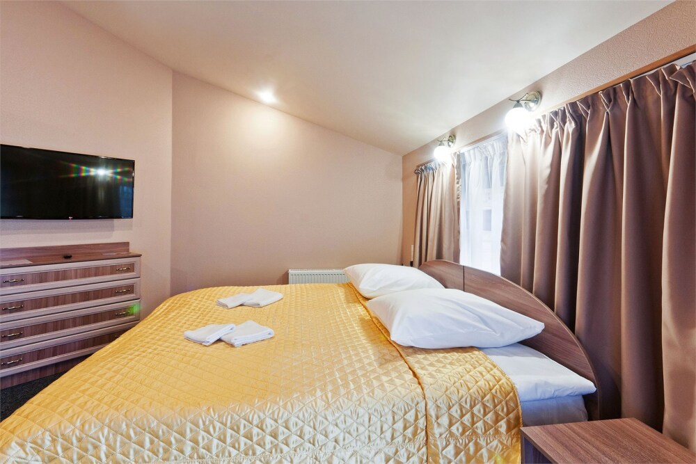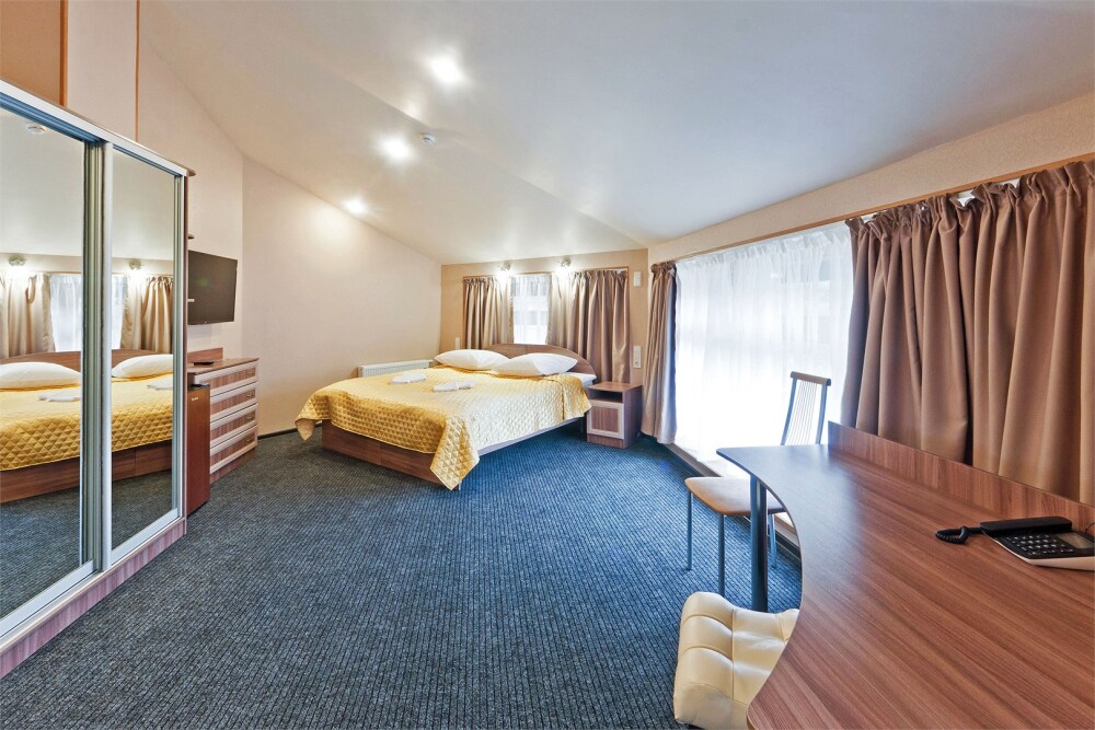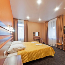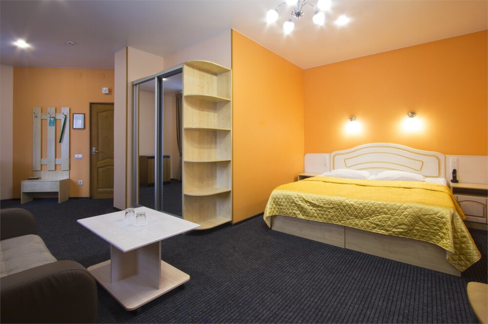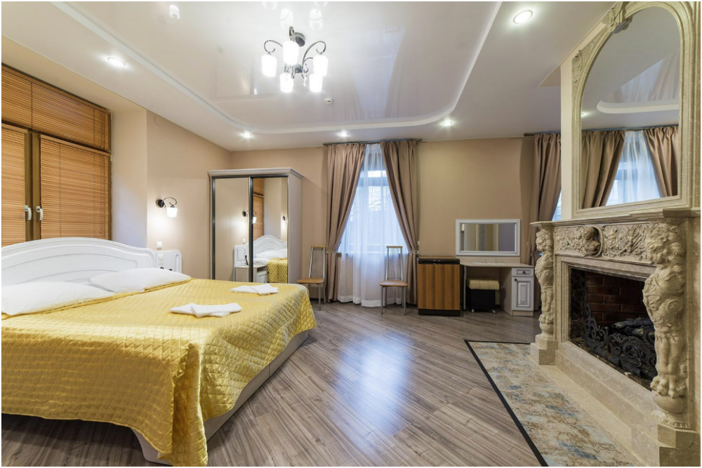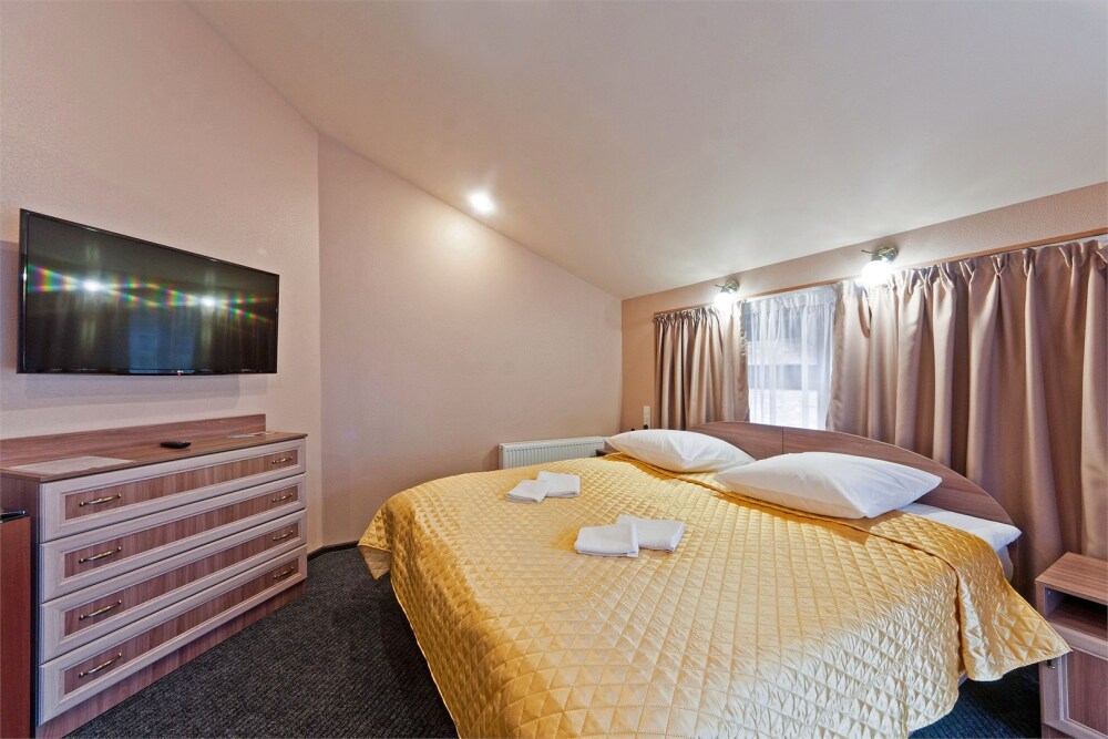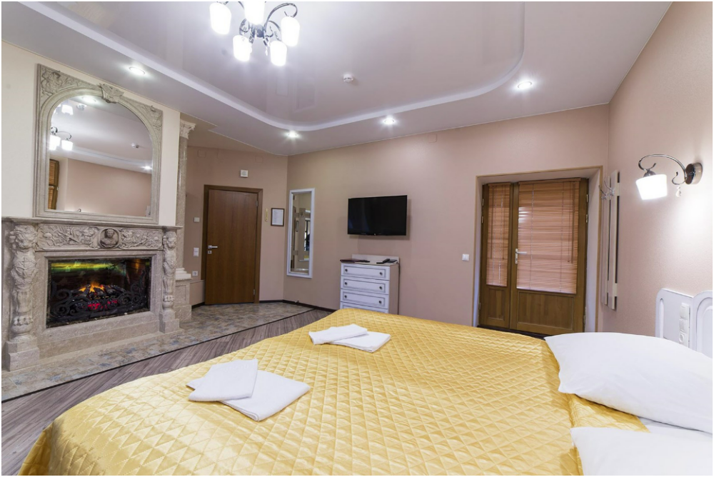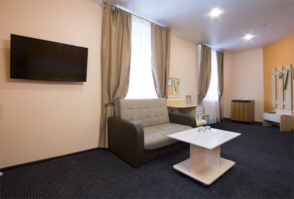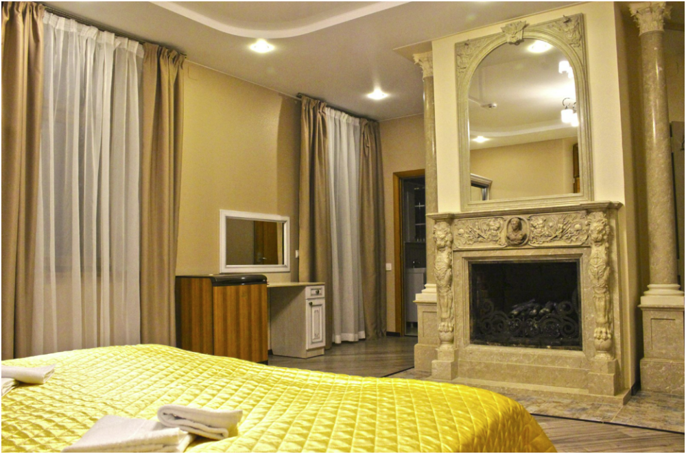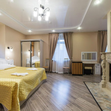 Просторный однокомнатный номер с отдельным входом, выполнен в тёплых тонах, оснащен всей необходимой мебелью, жк-телевизором и декоративным камином. В комнате установлены две 1,5-спальные кровати, которые по запросу могут быть составлены вместе (с единым 2-спальным наматрасником) либо раздельно. Также имеется диван. Просторный санузел с окном оснащён ванной.