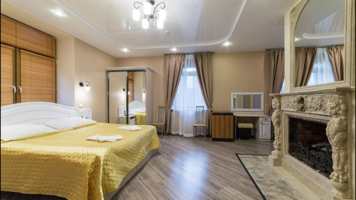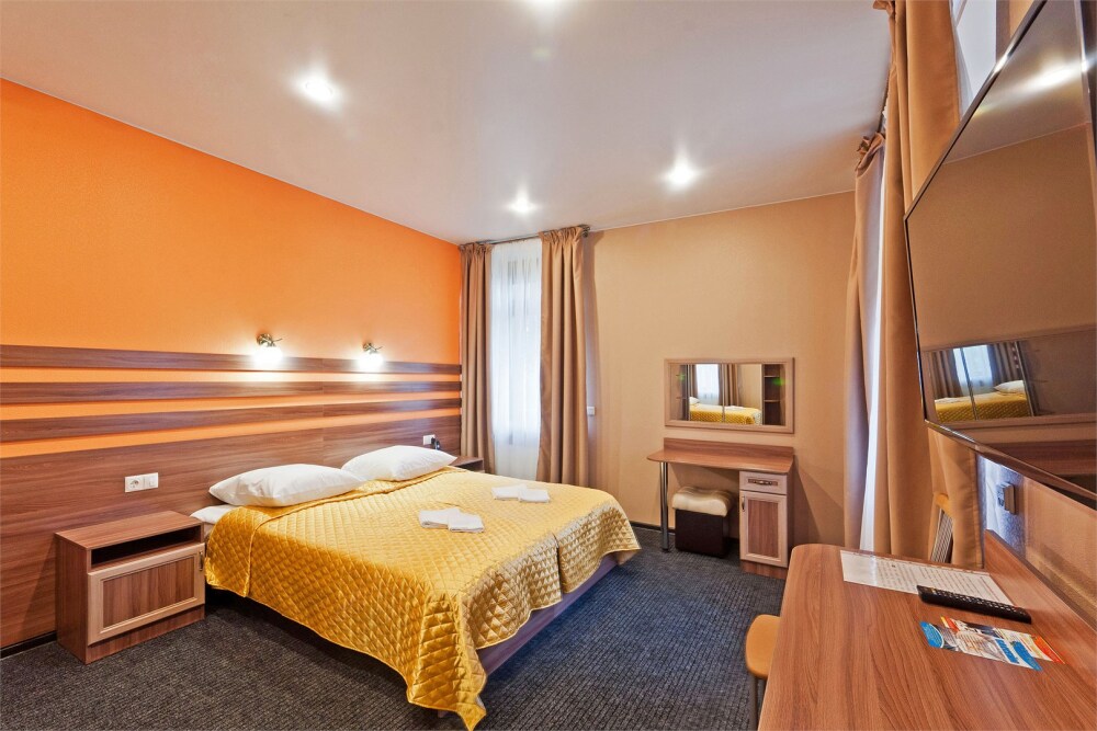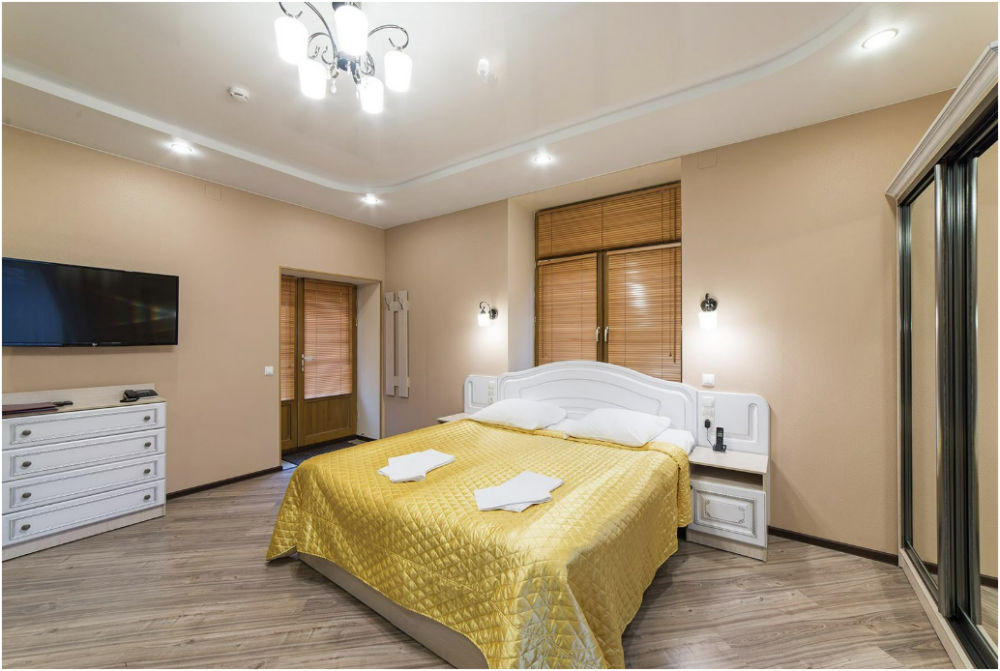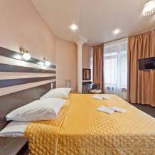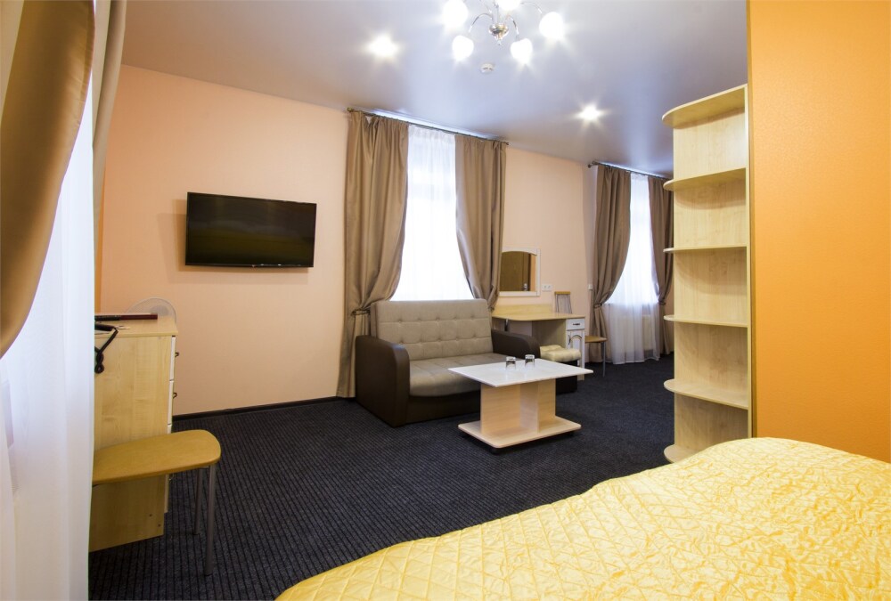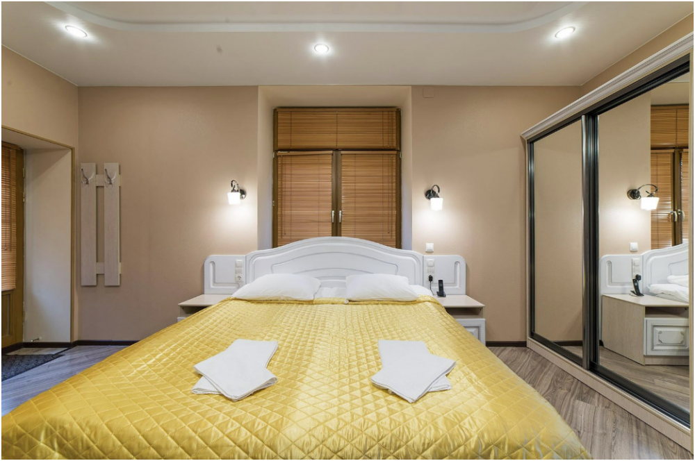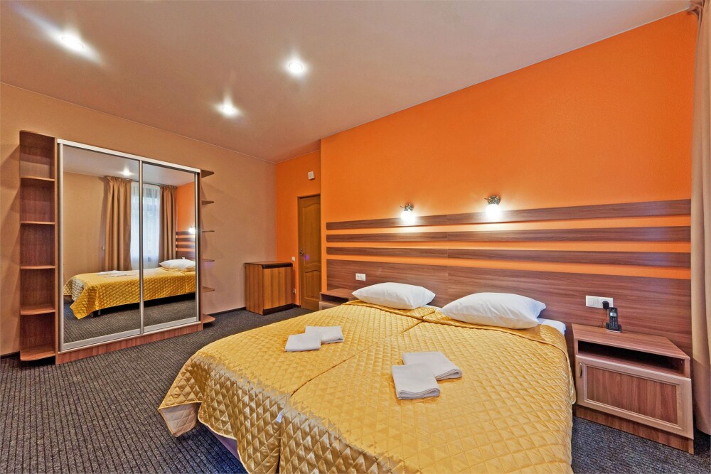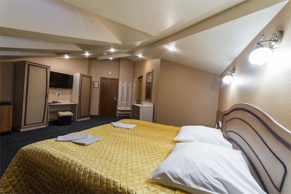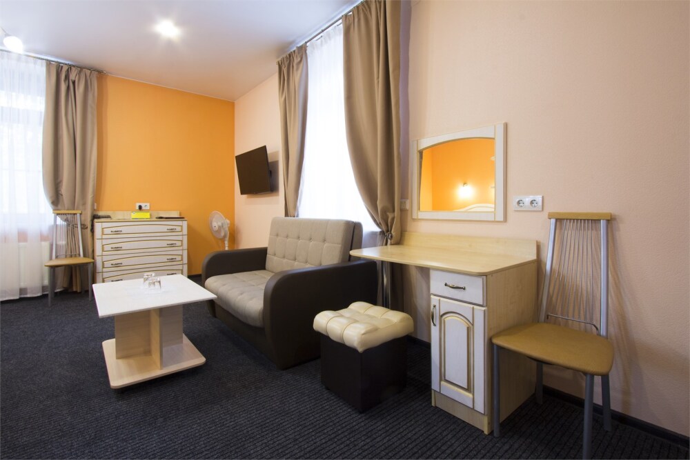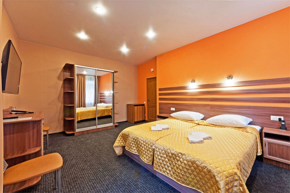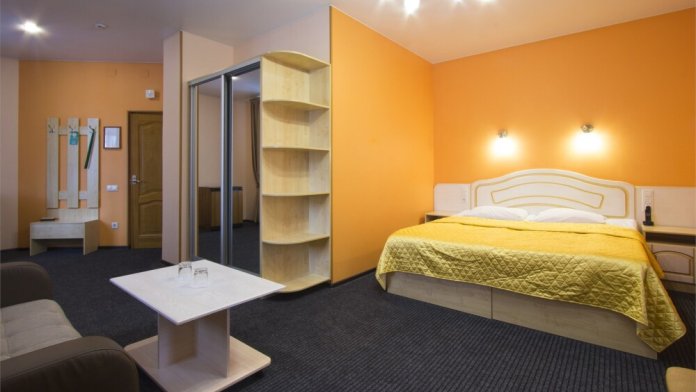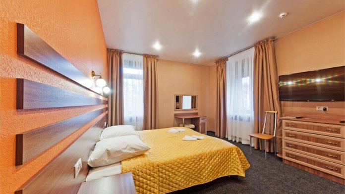 Просторный однокомнатный номер с отдельным входом, выполнен в тёплых тонах, оснащен всей необходимой мебелью, жк-телевизором и декоративным камином. В комнате установлены две 1,5-спальные кровати, которые по запросу могут быть составлены вместе (с единым 2-спальным наматрасником) либо раздельно. Также имеется диван. Просторный санузел с окном оснащён ванной.