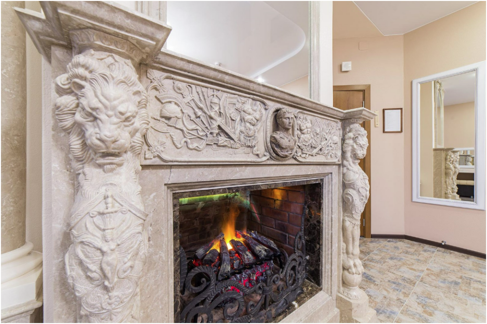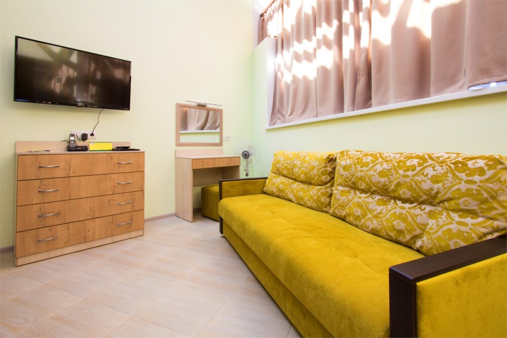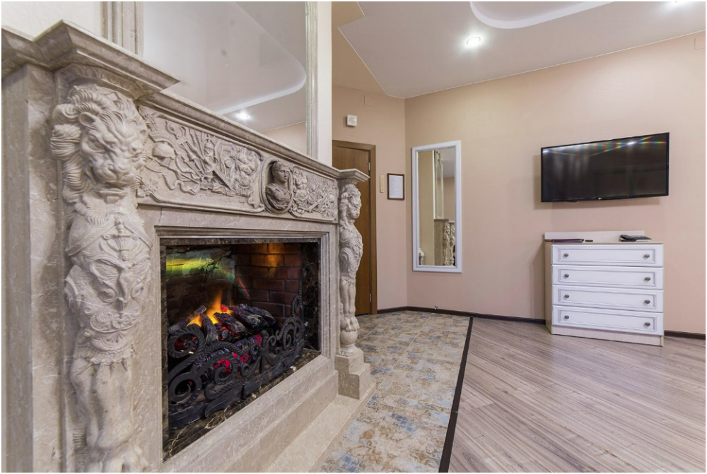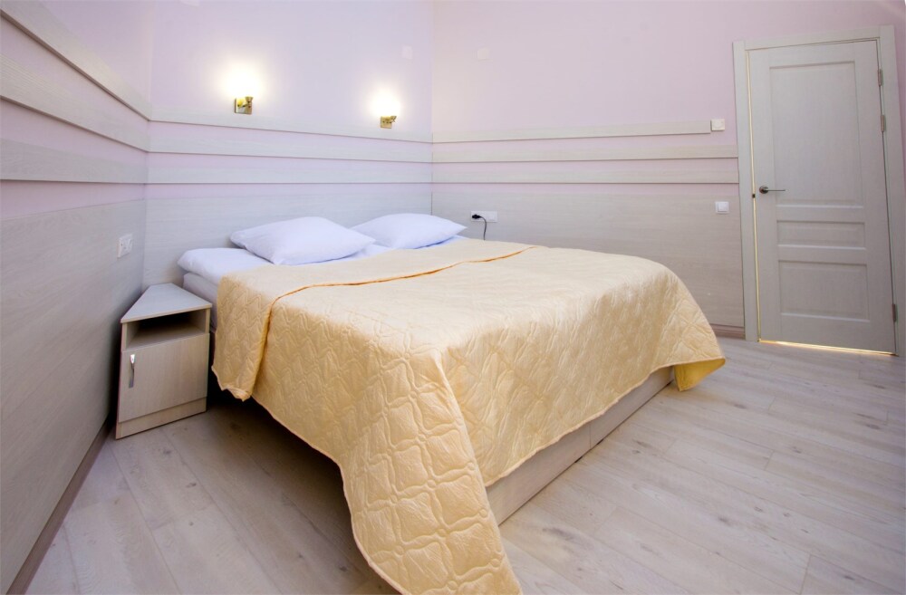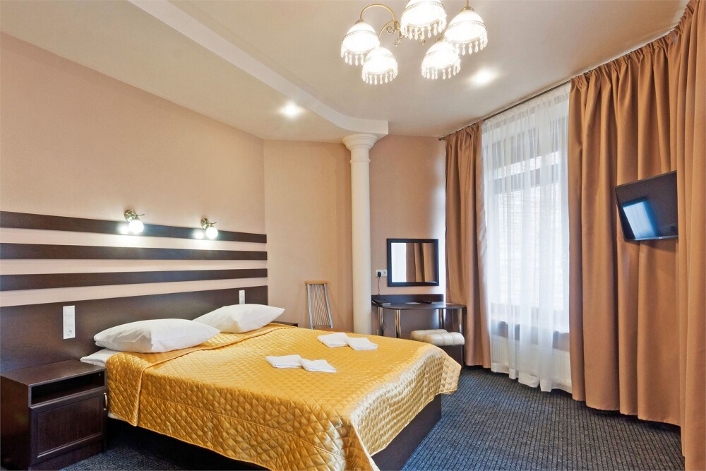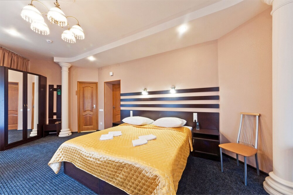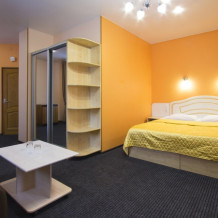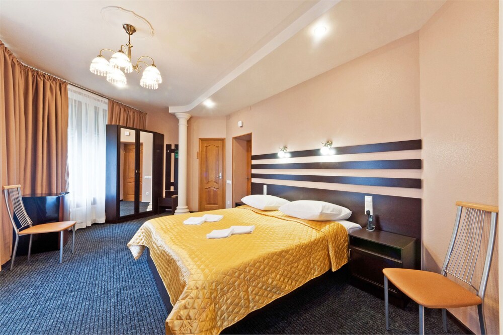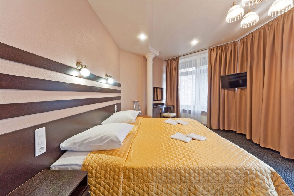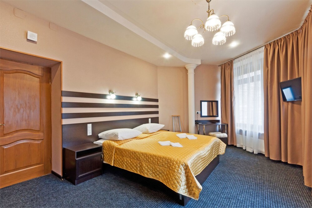 Просторный однокомнатный номер с отдельным входом, выполнен в тёплых тонах, оснащен всей необходимой мебелью, жк-телевизором и декоративным камином. В комнате установлены две 1,5-спальные кровати, которые по запросу могут быть составлены вместе (с единым 2-спальным наматрасником) либо раздельно. Также имеется диван. Просторный санузел с окном оснащён ванной.