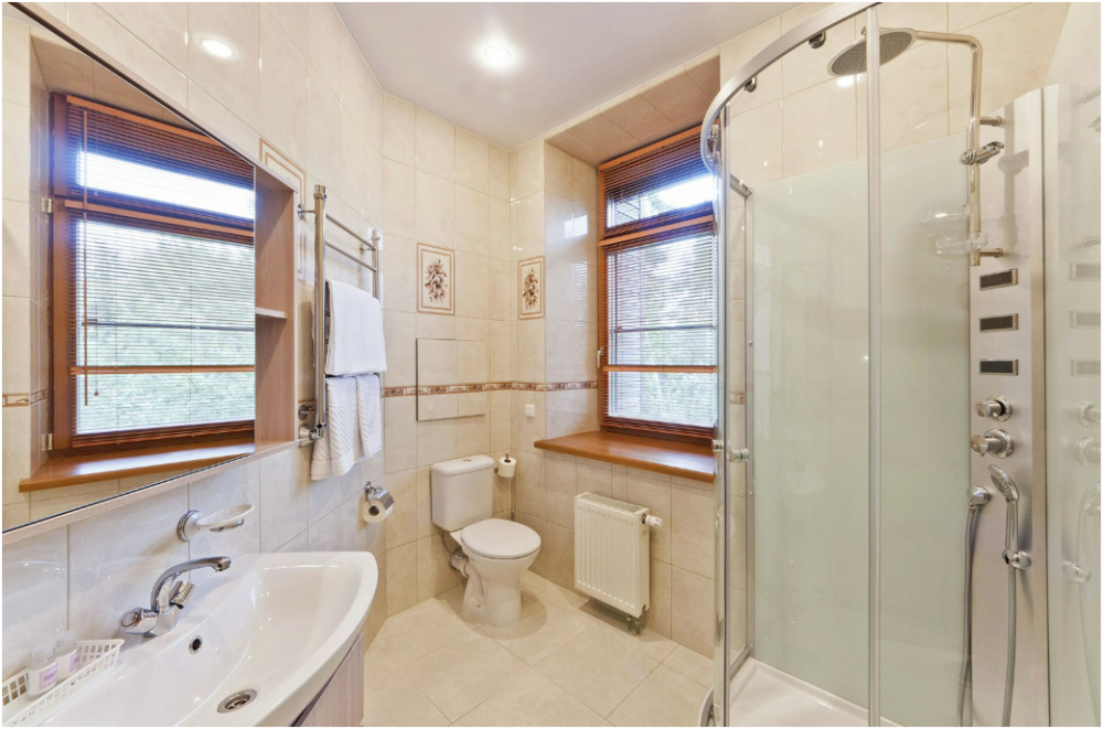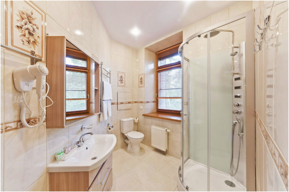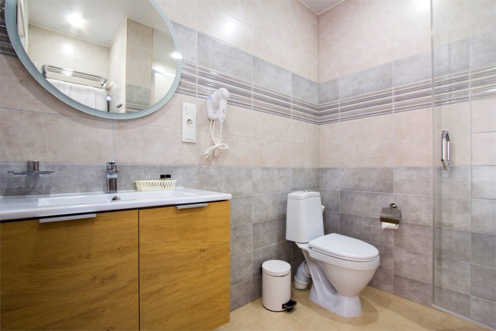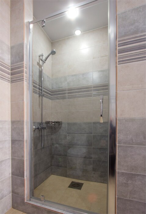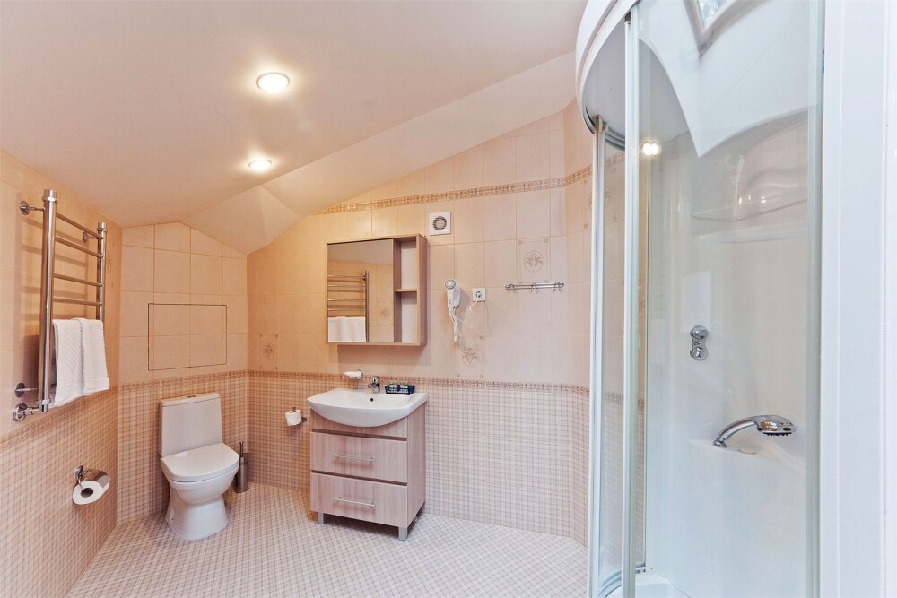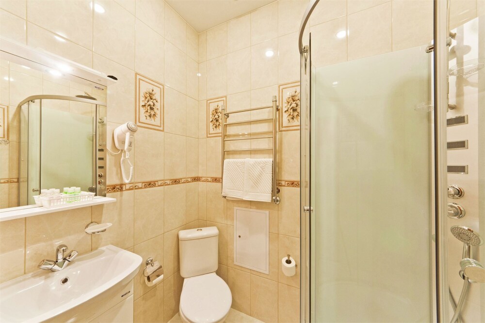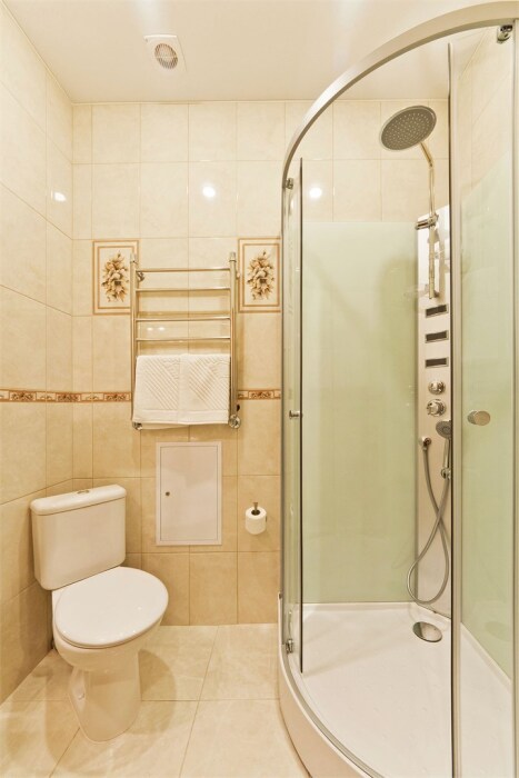 Санузел оснащён современной душевой кабиной с функцией подачи пара.