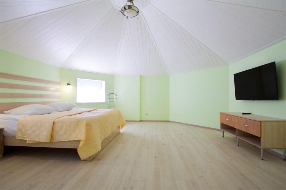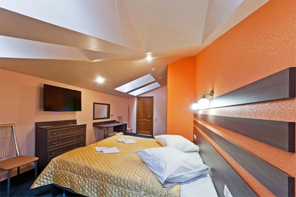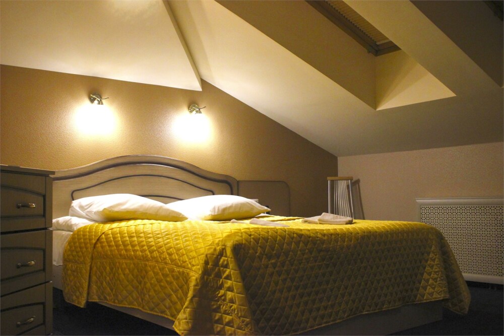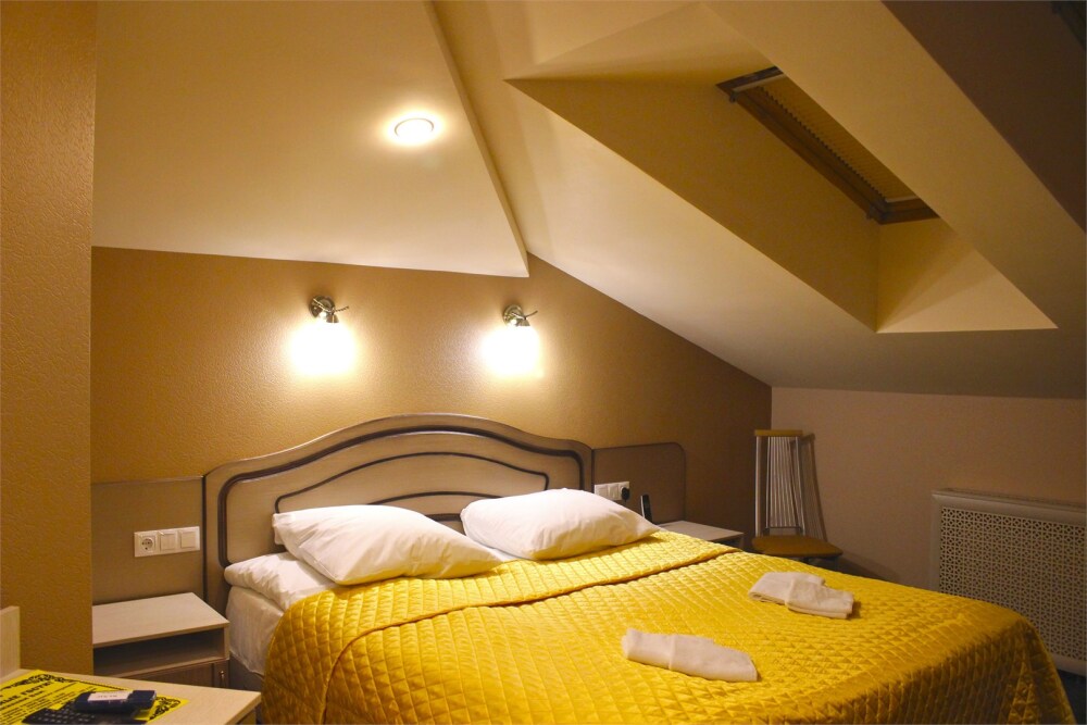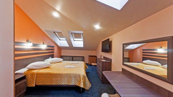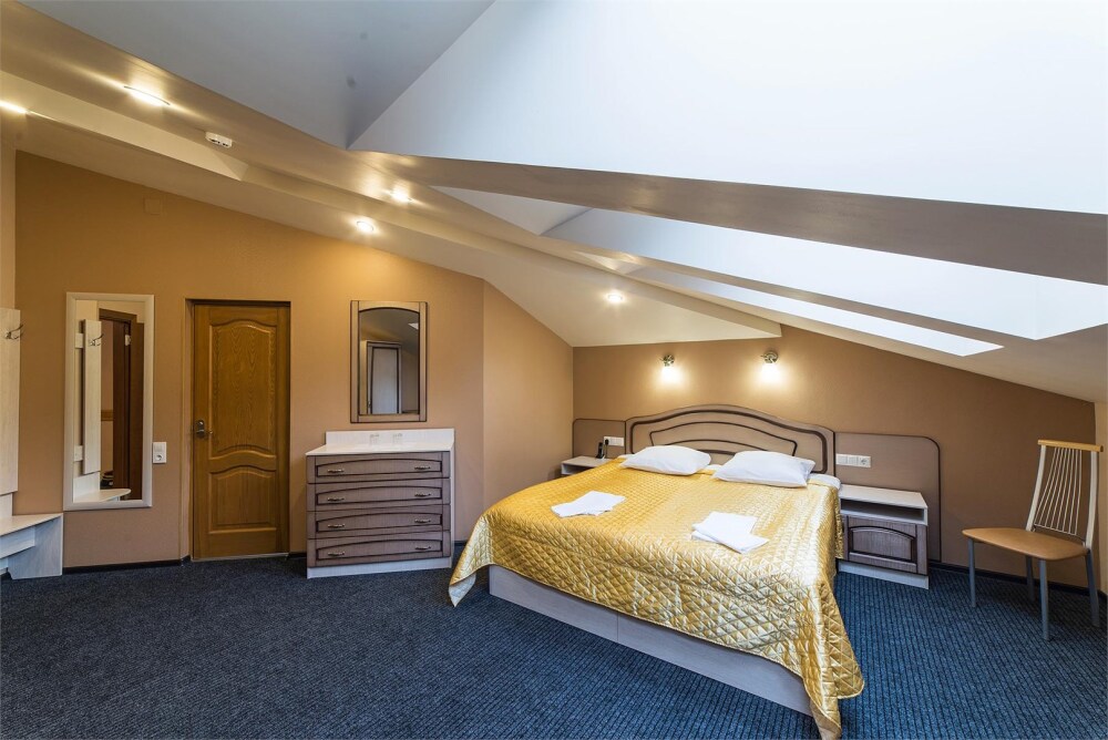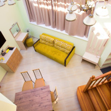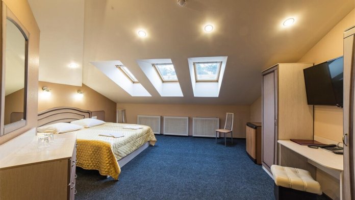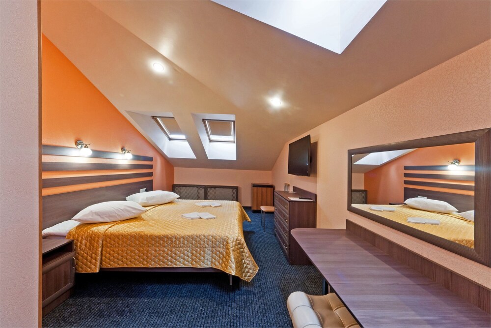 Уютный однокомнатный номер с мансардными окнами. Выполнен в тёплых тонах и оснащен всей необходимой мебелью и жк-телевизором. Номер оборудован кондиционером.