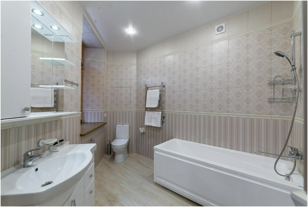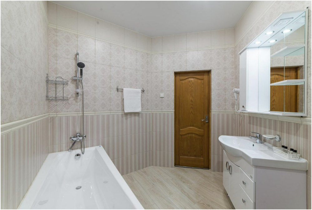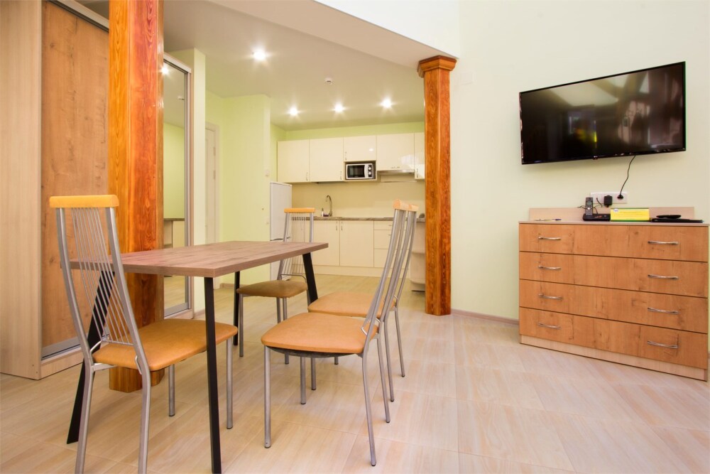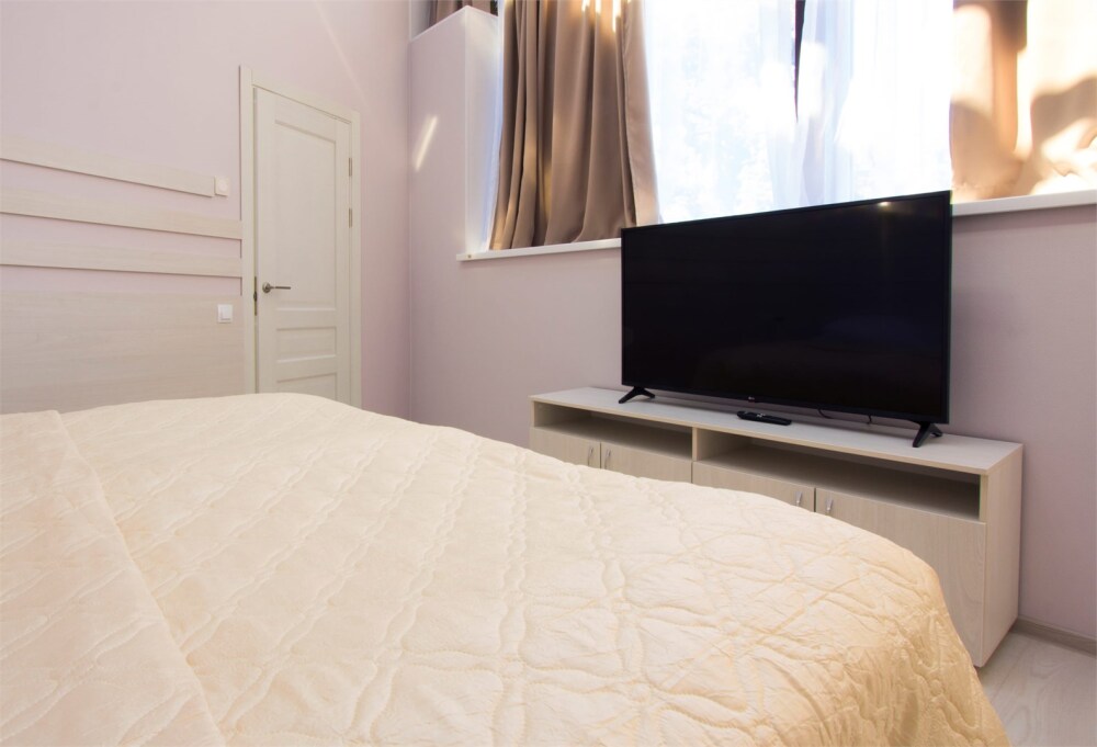 Выполнен в пудровых тонах и оснащен всей необходимой мебелью и жк-телевизором.