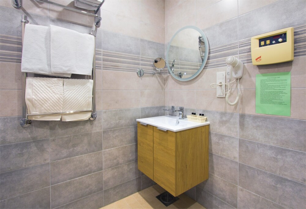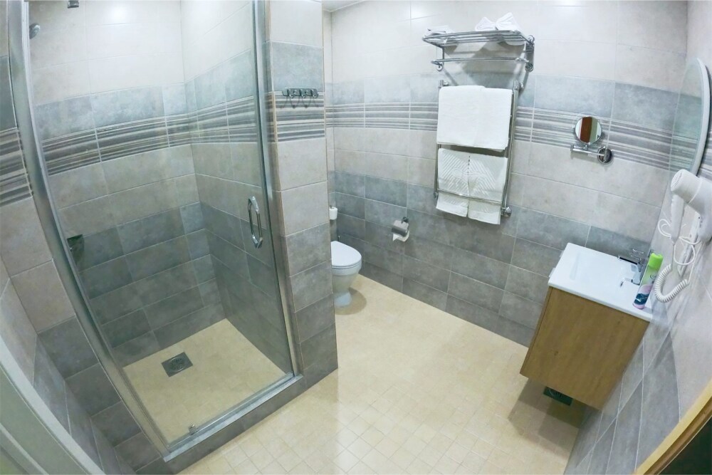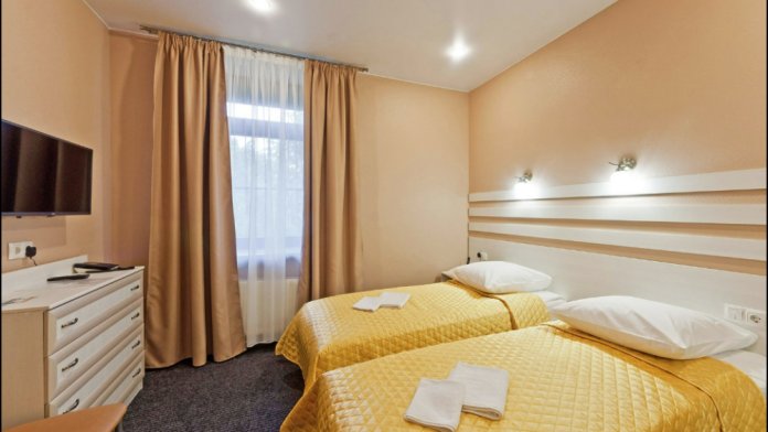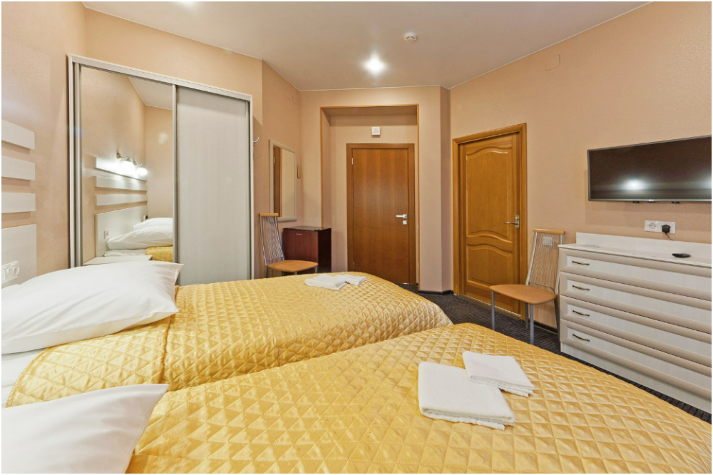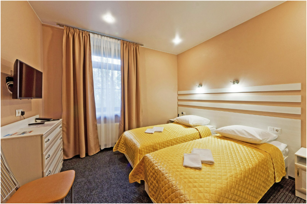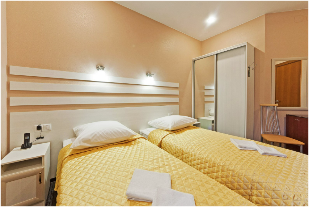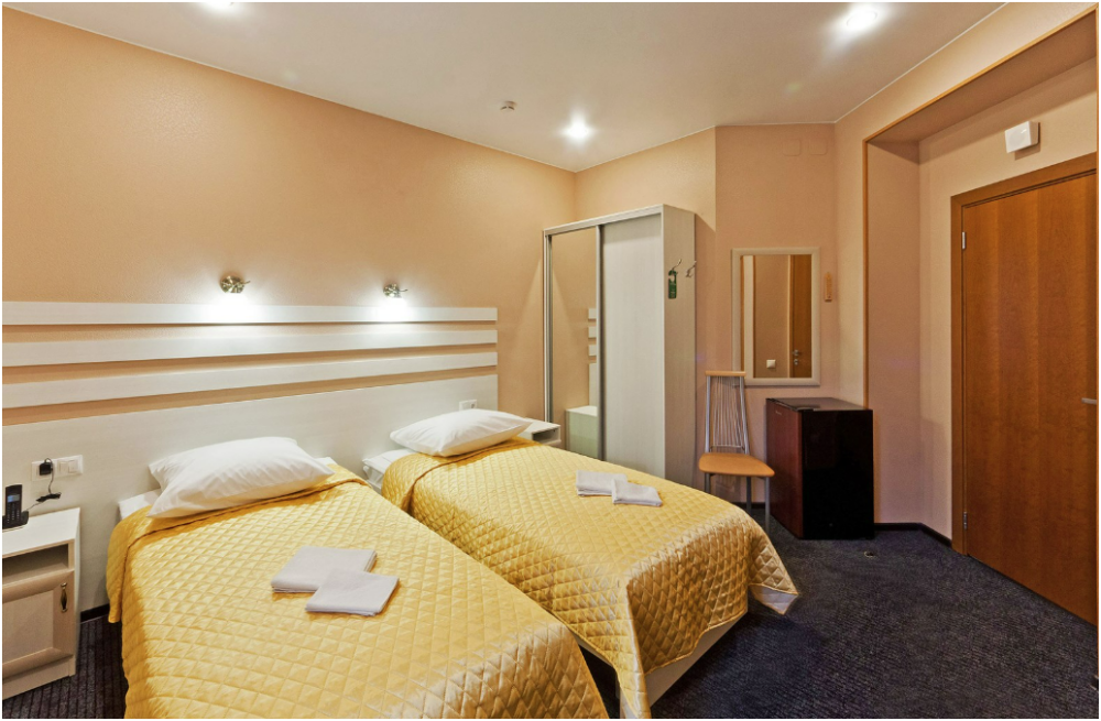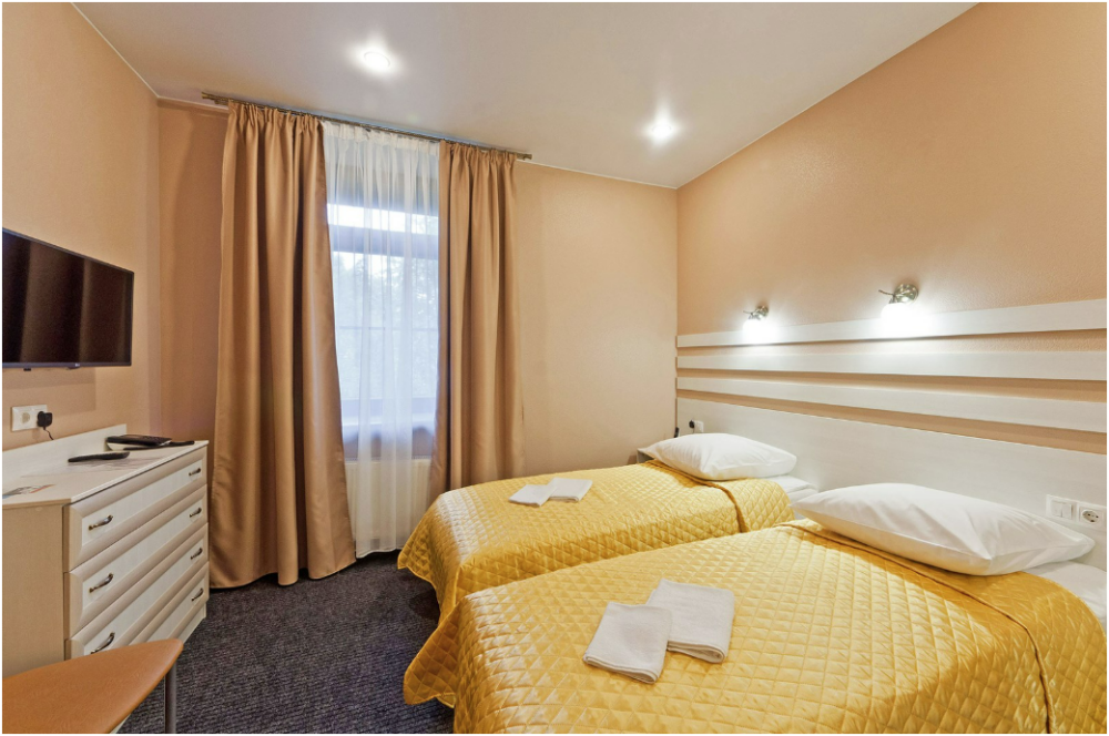 В комнате установлены две 1,5-спальные кровати, которые по запросу могут быть составлены вместе (с единым 2-спальным наматрасником) либо раздельно. Просторный санузел оснащён современной душевой кабиной.