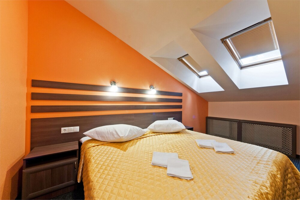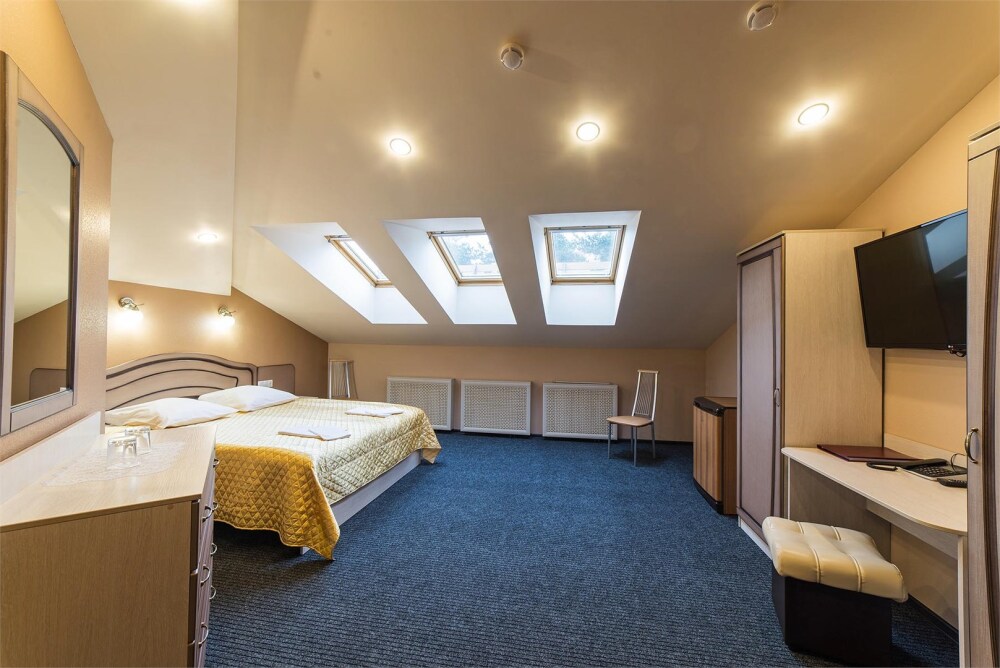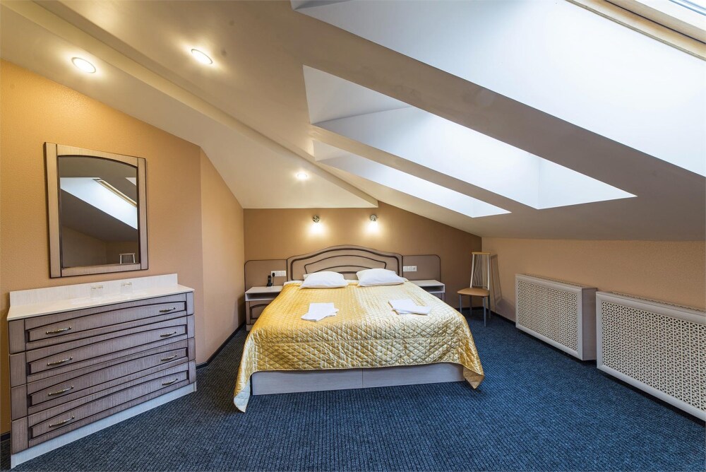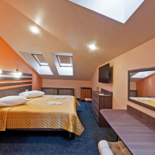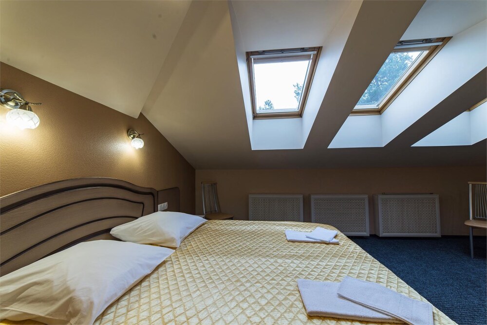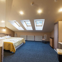 Оригинальный номер с мансардными окнами. Выполнен в спокойных тонах, оснащен всей необходимой мебелью и жк-телевизором. В комнате установлены две 1,5-спальные кровати, которые по запросу могут быть составлены вместе (с единым 2-спальным наматрасником) либо раздельно, а также имеется кресло-кровать. Просторный санузел с мансардными окнами, оснащен круглой ванной с функцией «Джакузи» и душевой кабиной. Номер оборудован кондиционером.