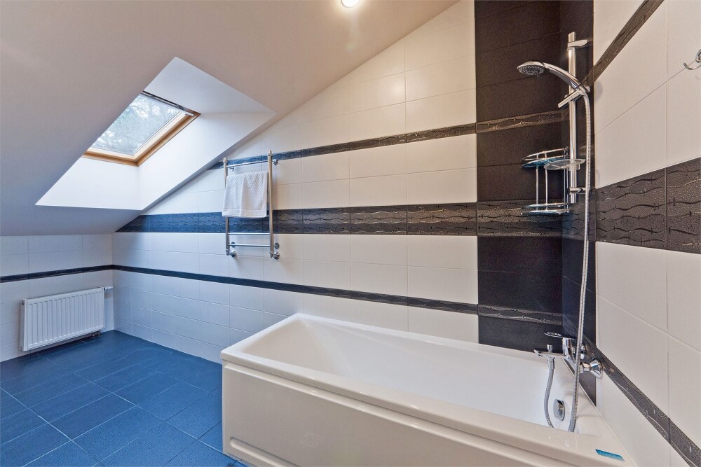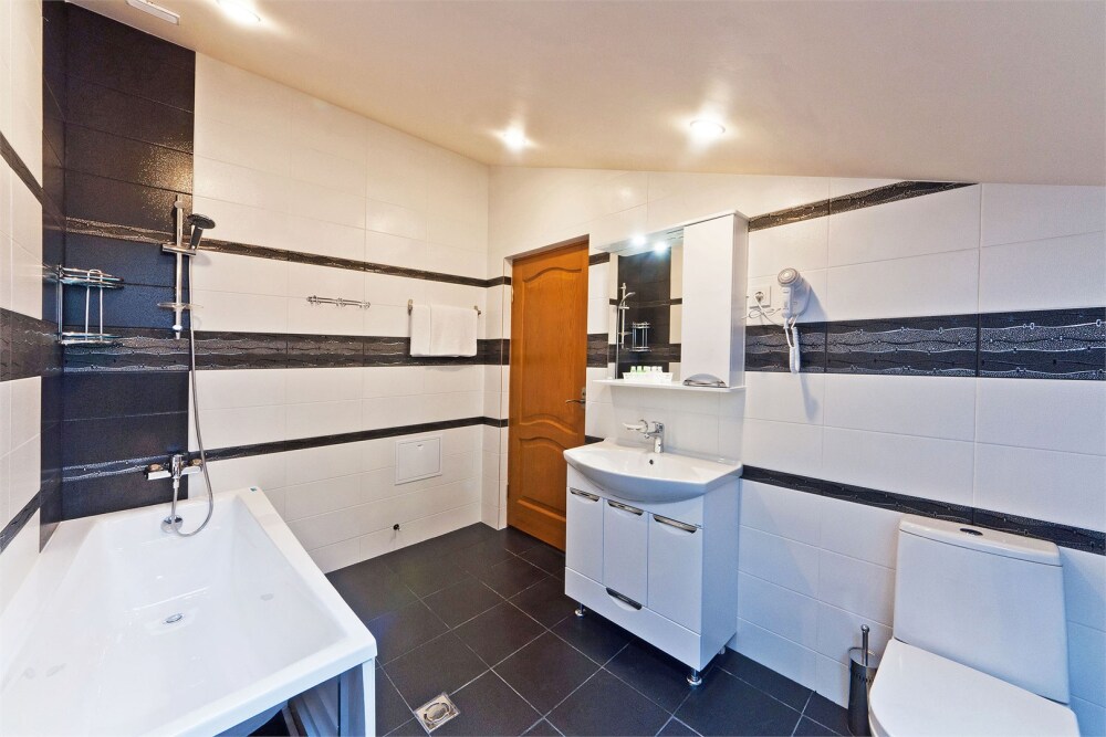 В комнате установлены две 1,5-спальные кровати, которые по запросу могут быть составлены вместе (с единым 2-спальным наматрасником) либо раздельно. В просторном санузле с мансардным окном установлена ванна.