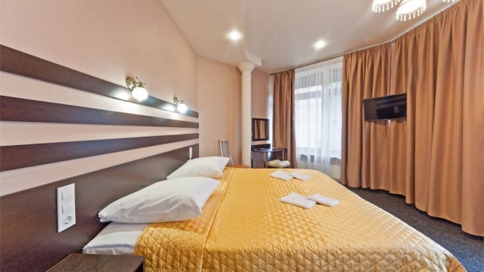 Просторный однокомнатный номер выполнен в тёплых тонах,