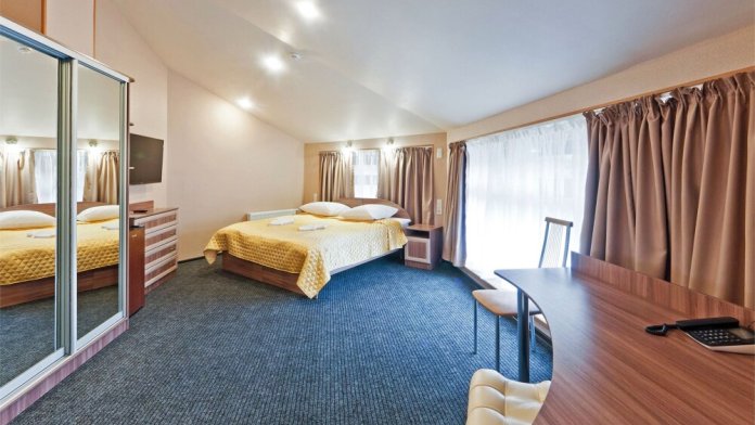 В комнате установлены две 1,5-спальные кровати, которые по запросу могут быть составлены вместе (с единым 2-спальным наматрасником) либо раздельно. Также имеется диван. Просторный санузел с окном оснащён угловой ванной.