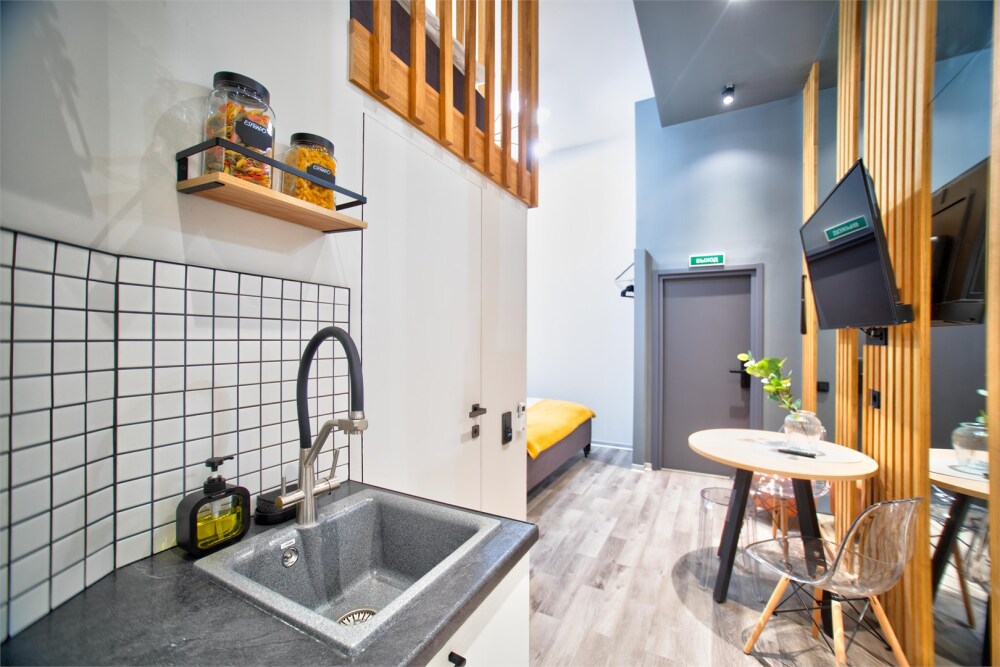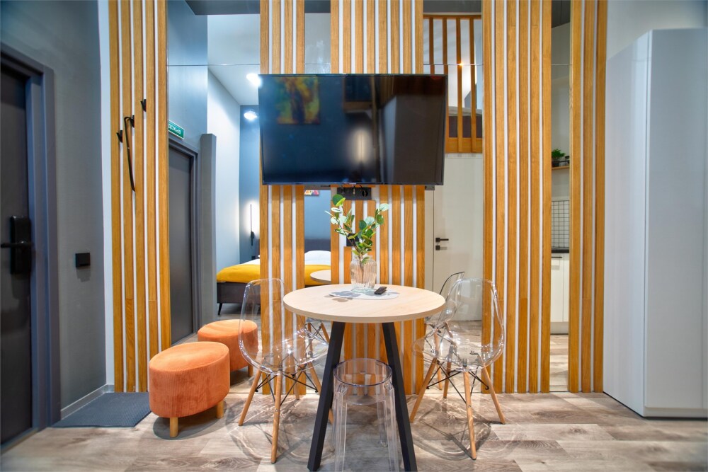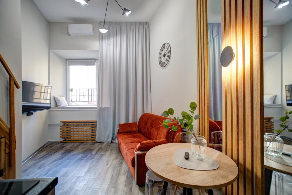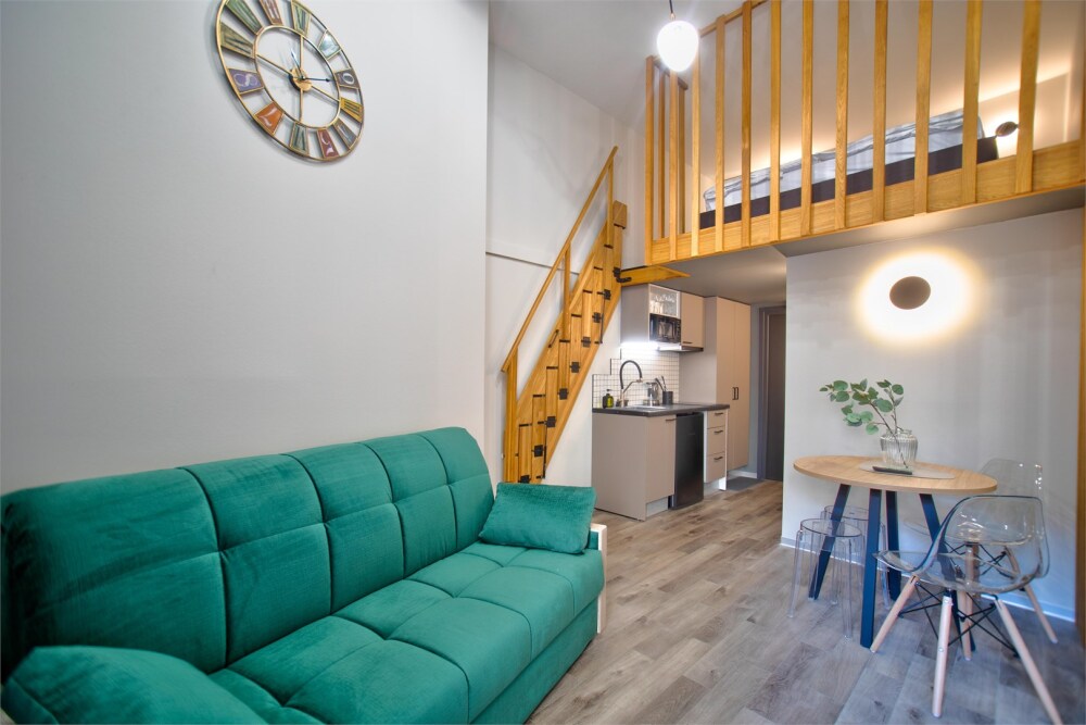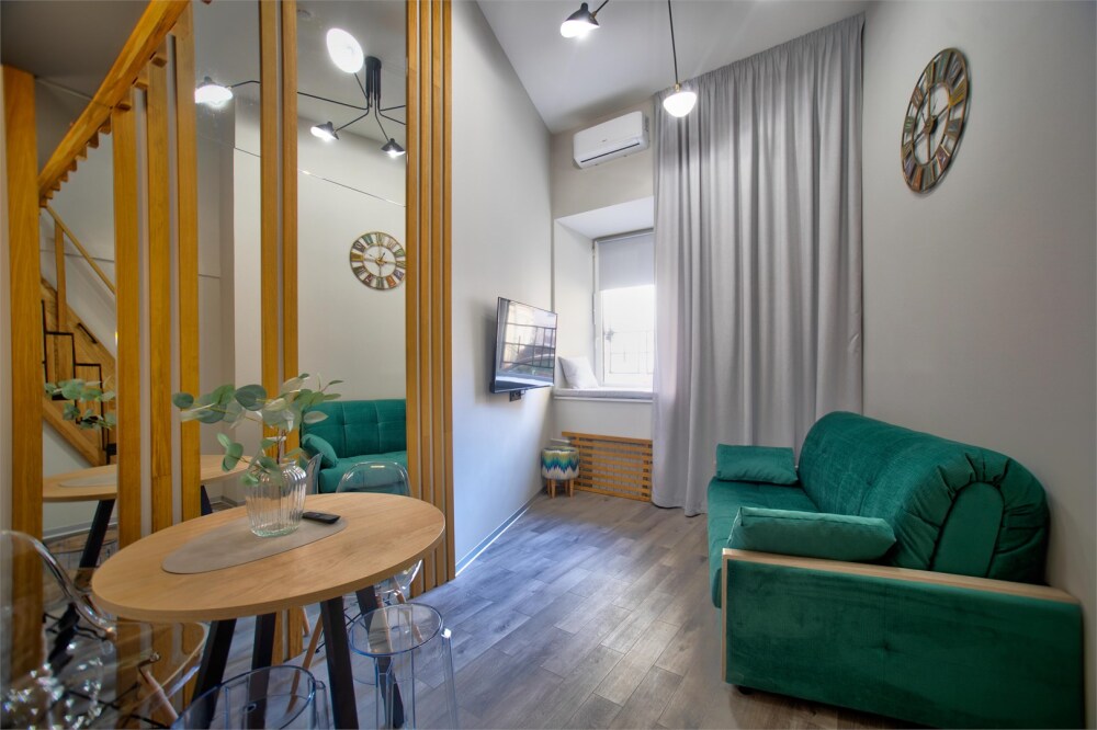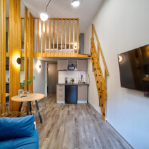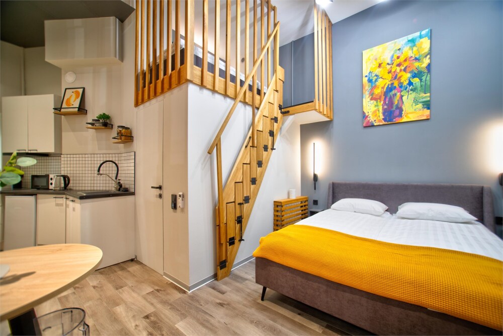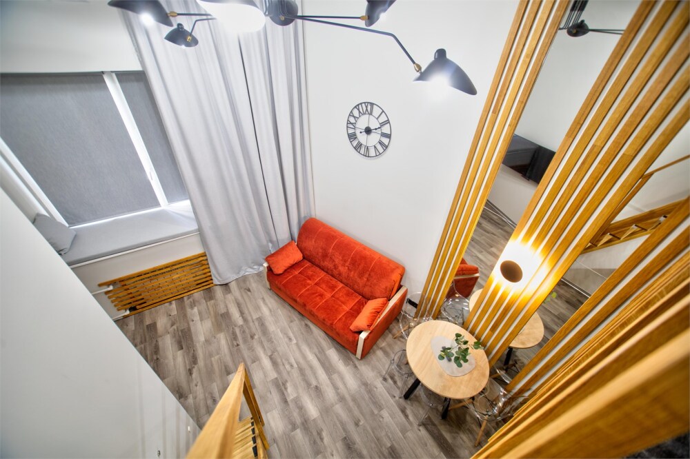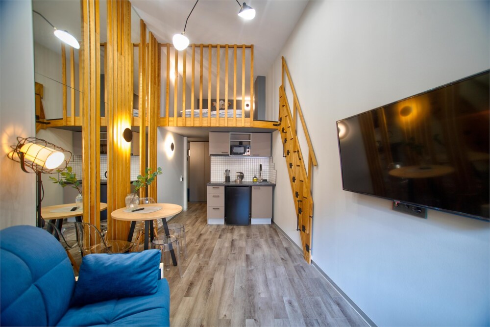 Двухуровневые апартаменты с большой двуспальной кроватью на втором уровне и диваном кроватью на первом уровне. Собственная кухня и санузел.