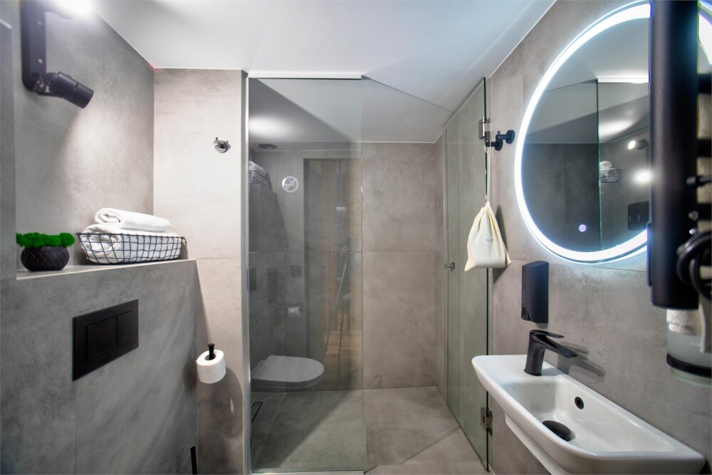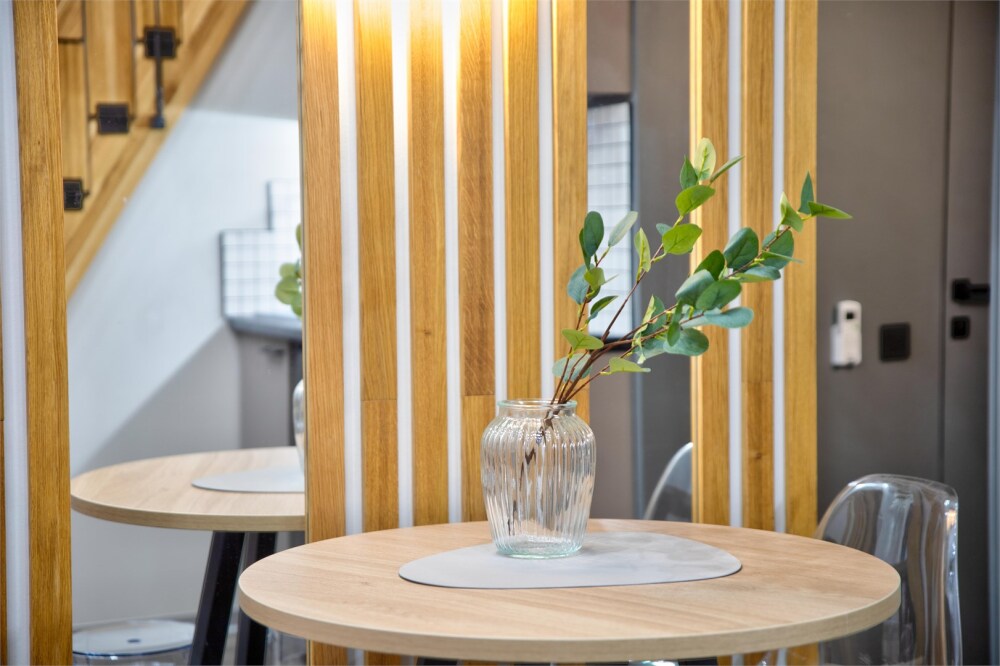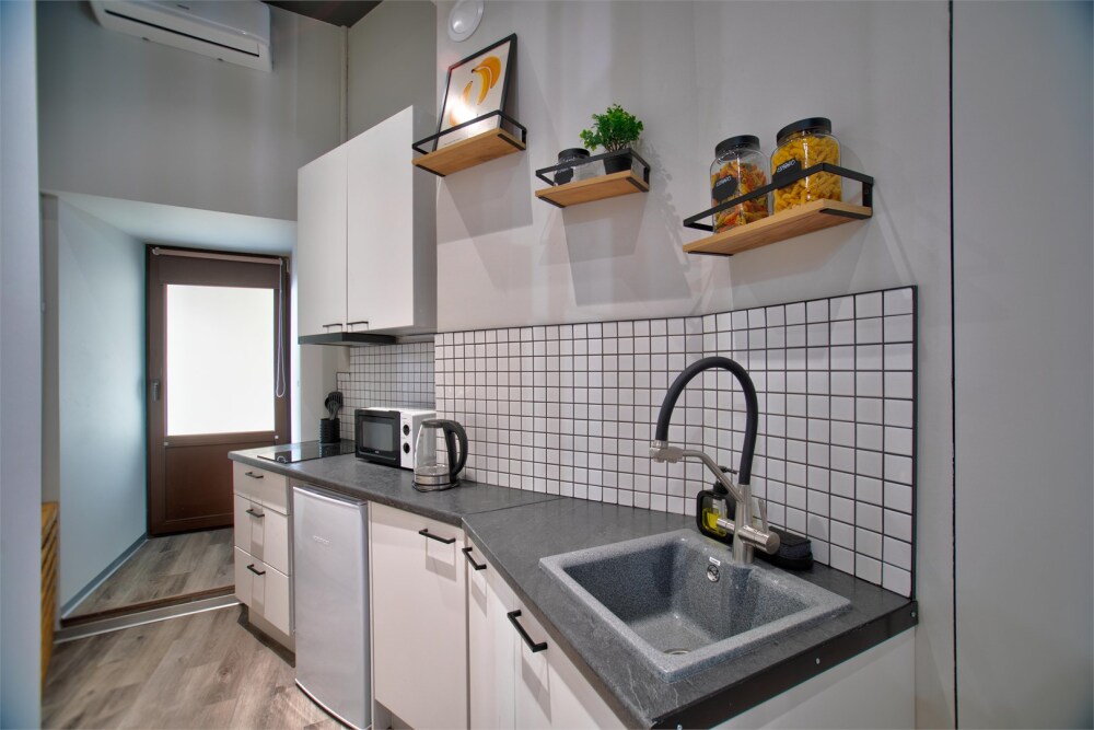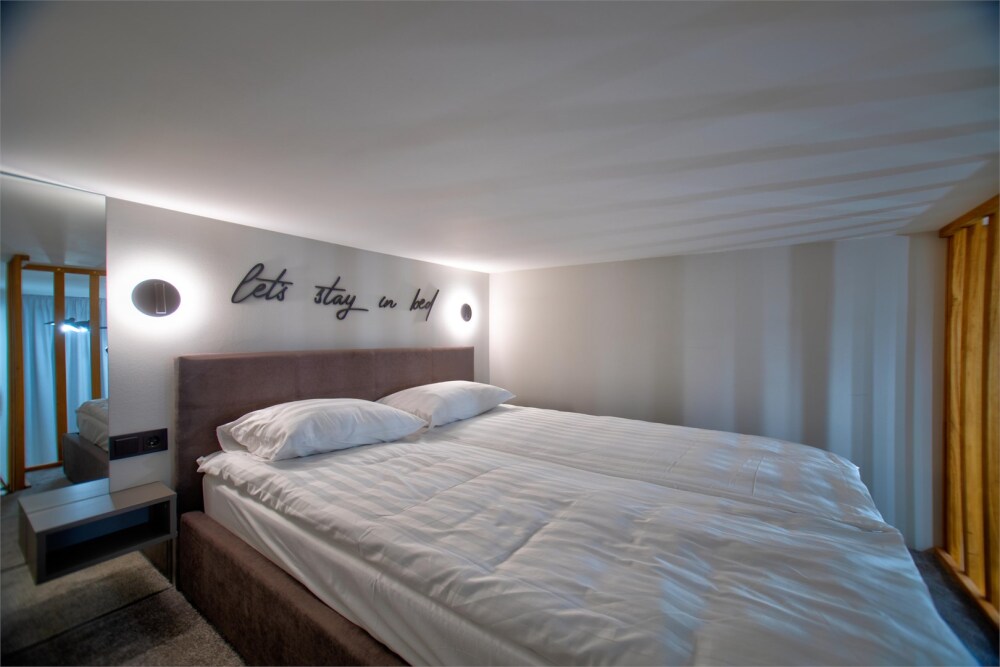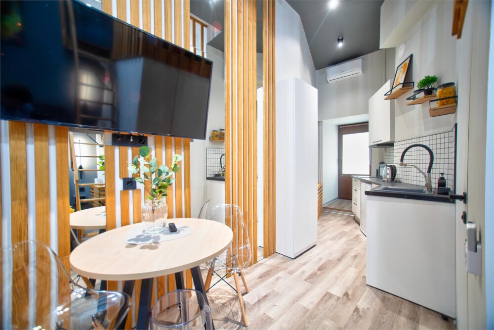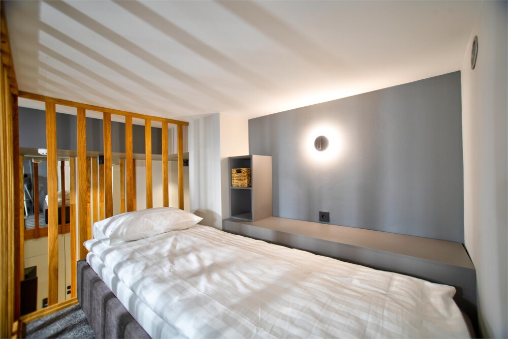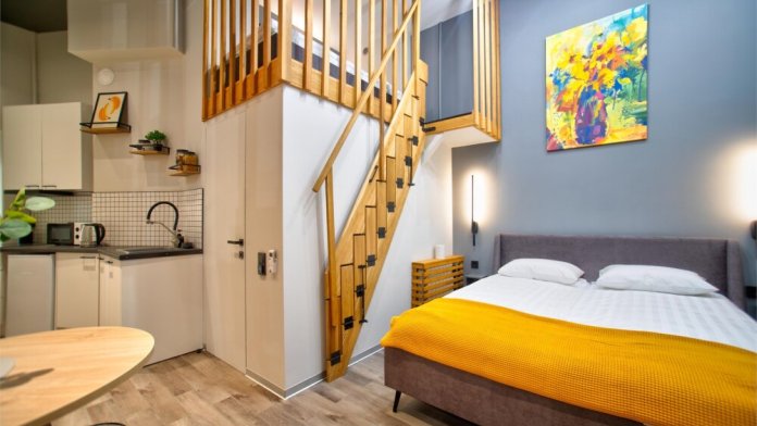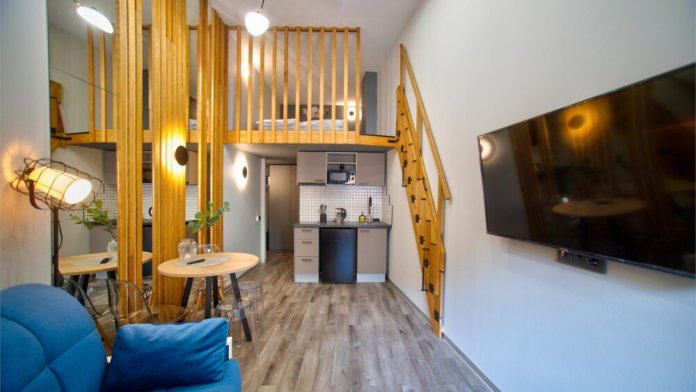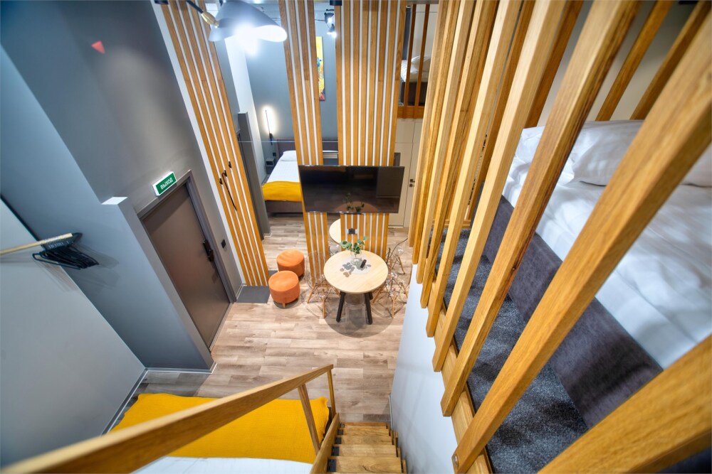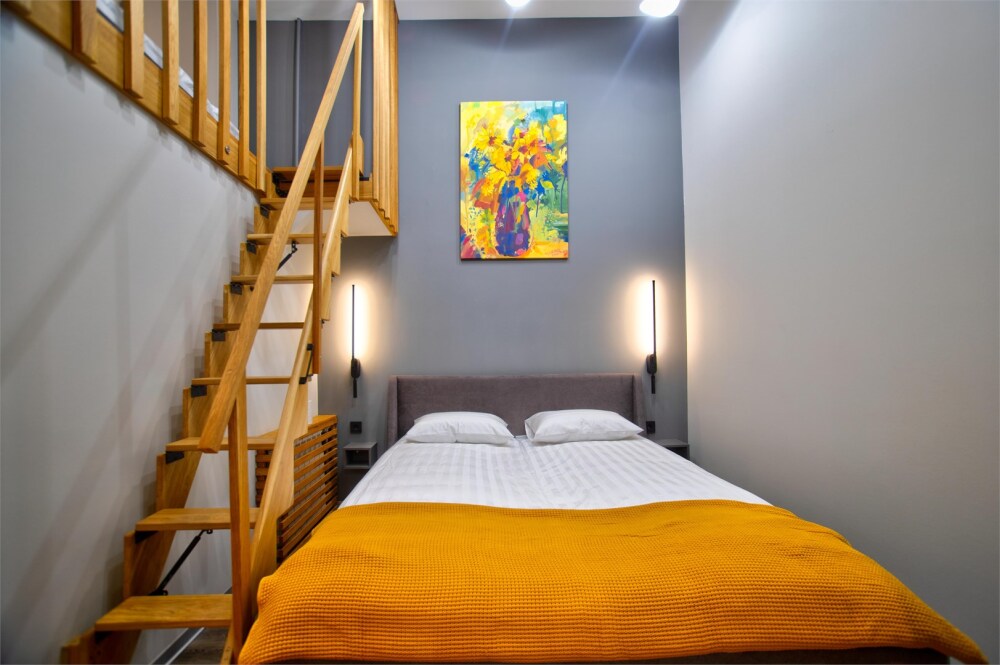 Двухуровневые апартаменты с односпальной кроватью на втором уровне и большой кроватью на первом уровне. Есть собственная кухня и ванная комната с душевой кабиной.