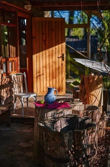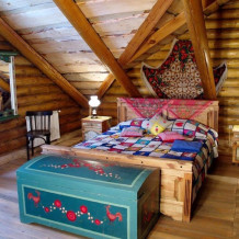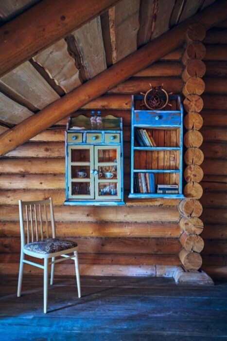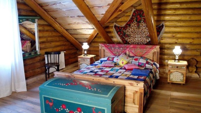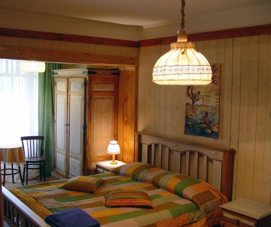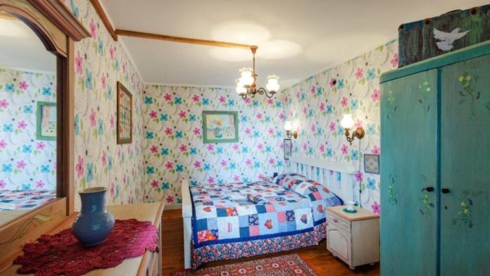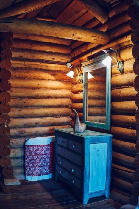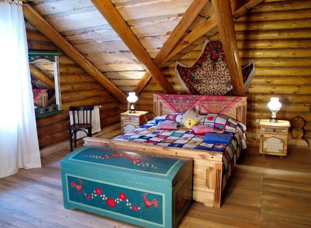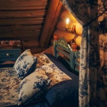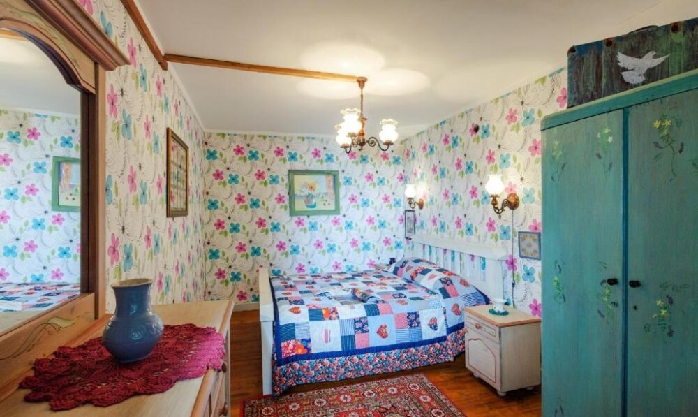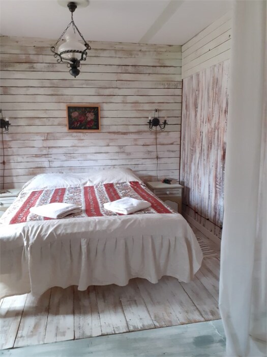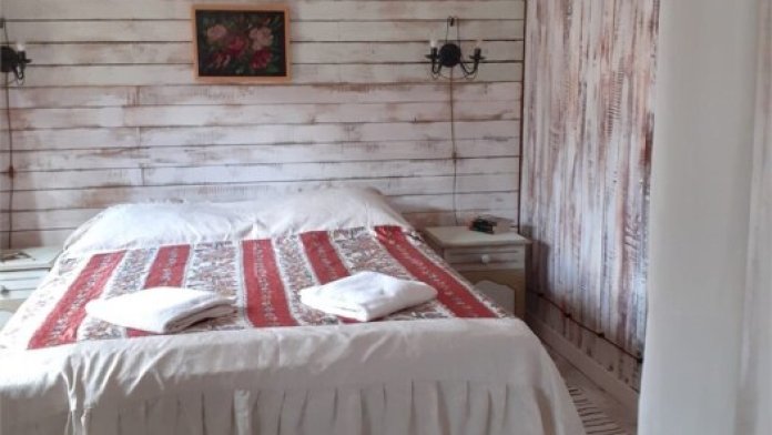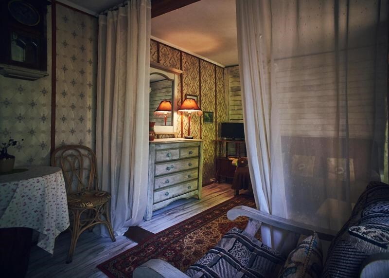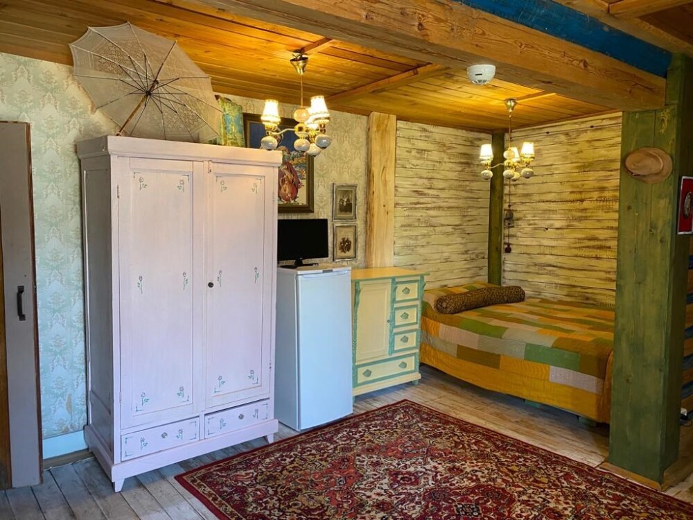 Однокомнатный номер с индивидуальным дизайном и мебелью ручной работы в деревянном доме в стиле времен А.П.Чехова. В номере - двуспальная кровать, две тумбочки, два стула, стол, комод, холодильник, телевизор, электрочайник, фен, тапочки. Ванная комната с душем и туалетом.