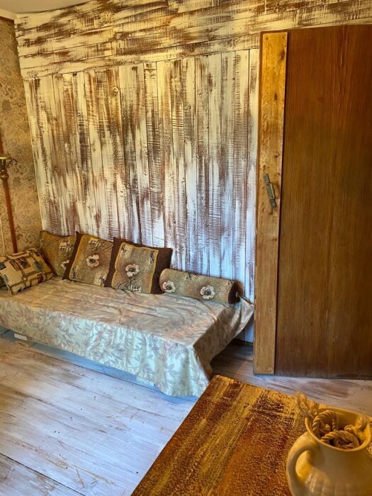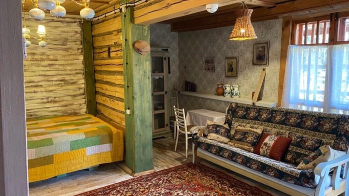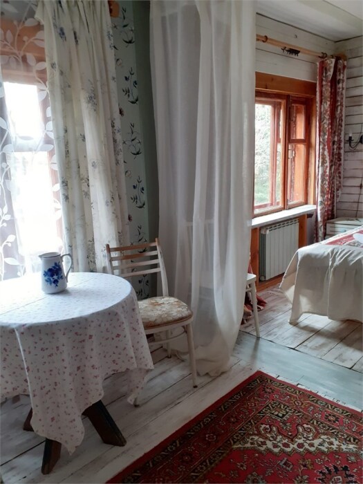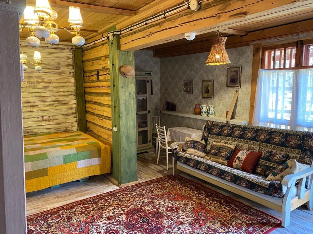 Однокомнатный номер с индивидуальным дизайном и мебелью ручной работы в деревянном доме в стиле времен А.П.Чехова. В номере - две раздельные кровати, две тумбочки, два стула, диван, холодильник, телевизор, электрочайник, фен, тапочки. Ванная комната с душем и туалетом.
