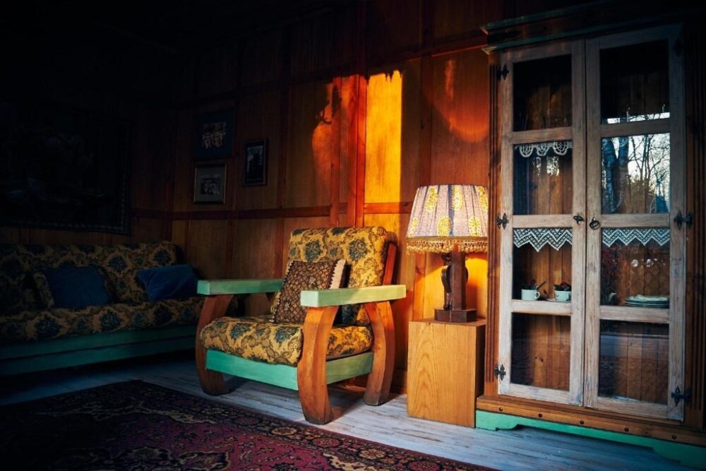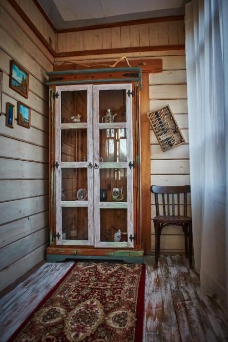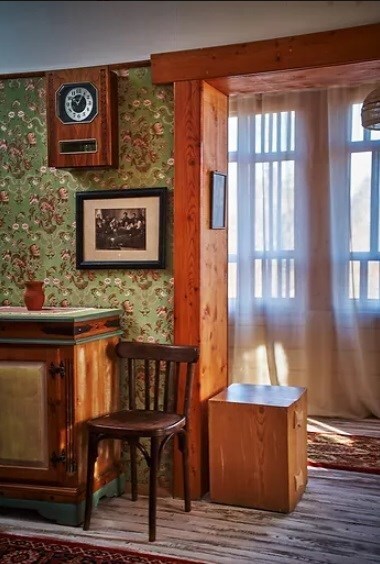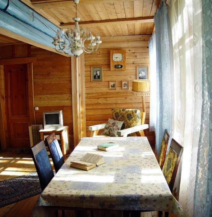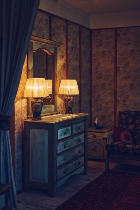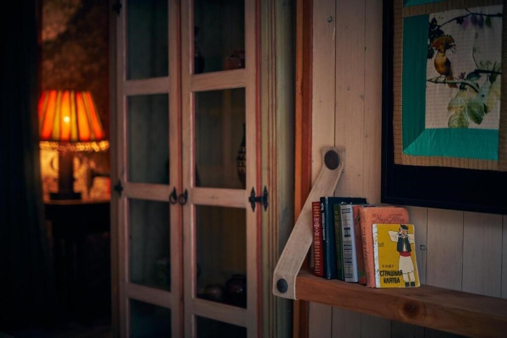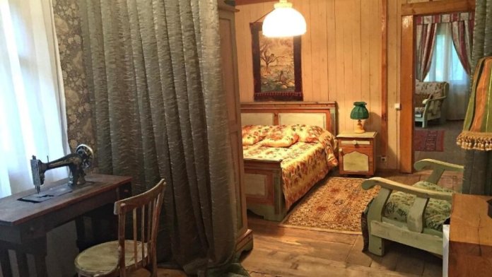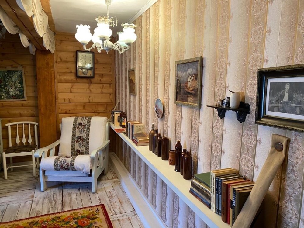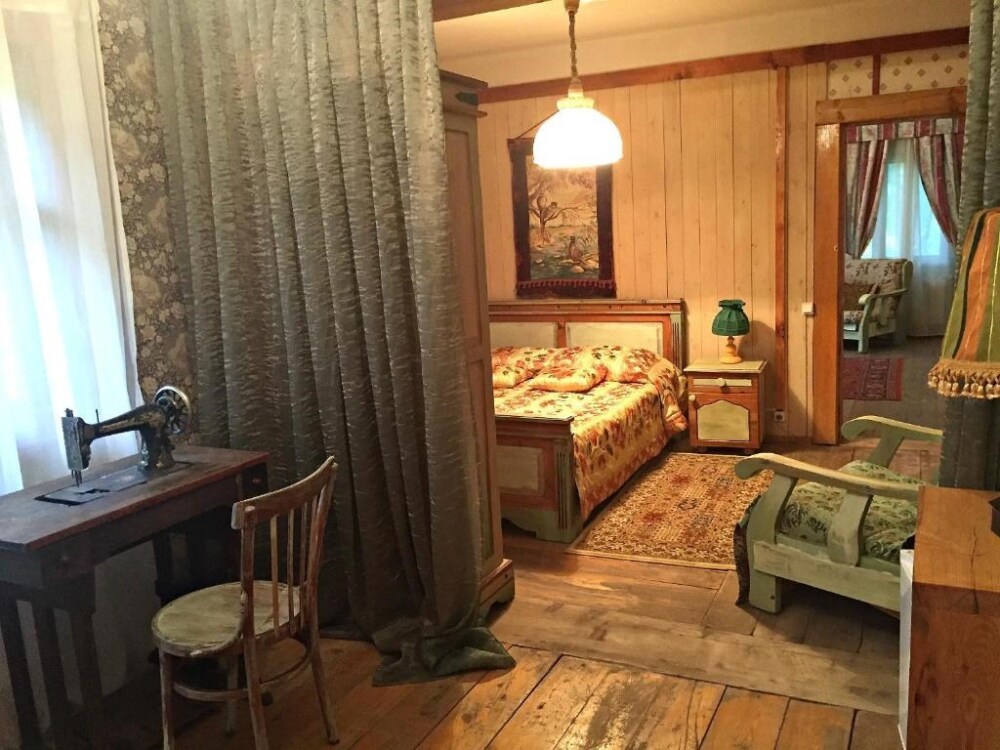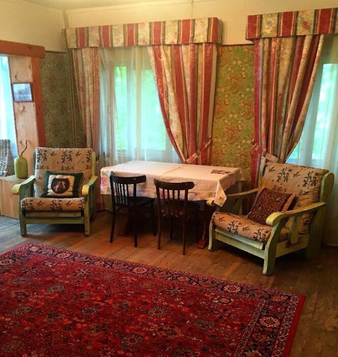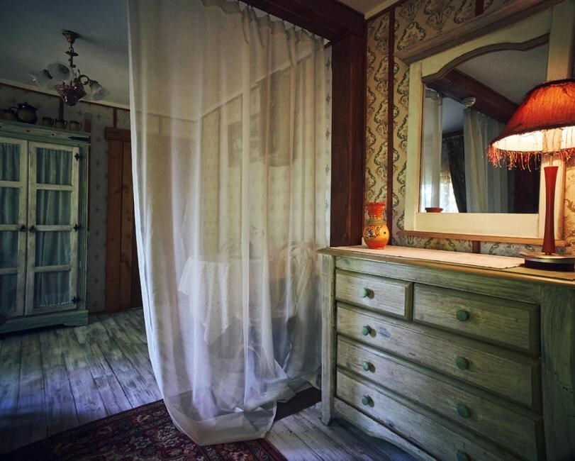 Двухкомнатный номер с индивидуальным дизайном и мебелью ручной работы в деревянном доме в стиле времен А.П.Чехова. В номере - двуспальная кровать, односпальная кровать, две тумбочки, два стула, комод, холодильник, телевизор, электрочайник. Ванная комната с ванной и туалетом.