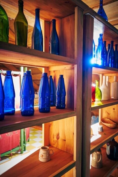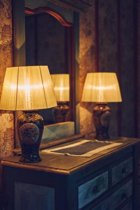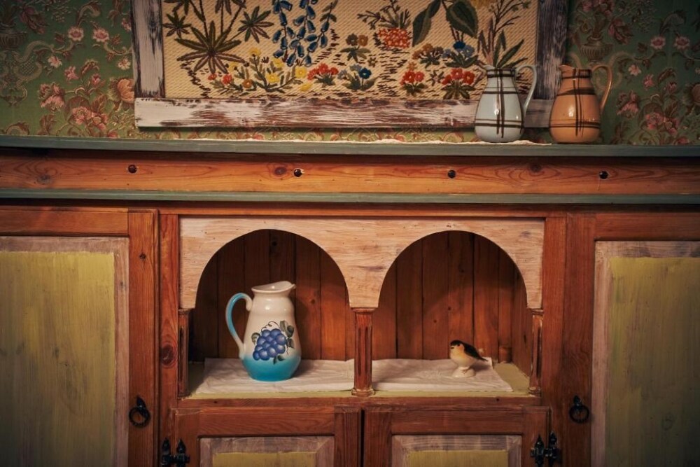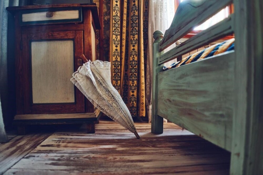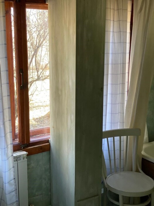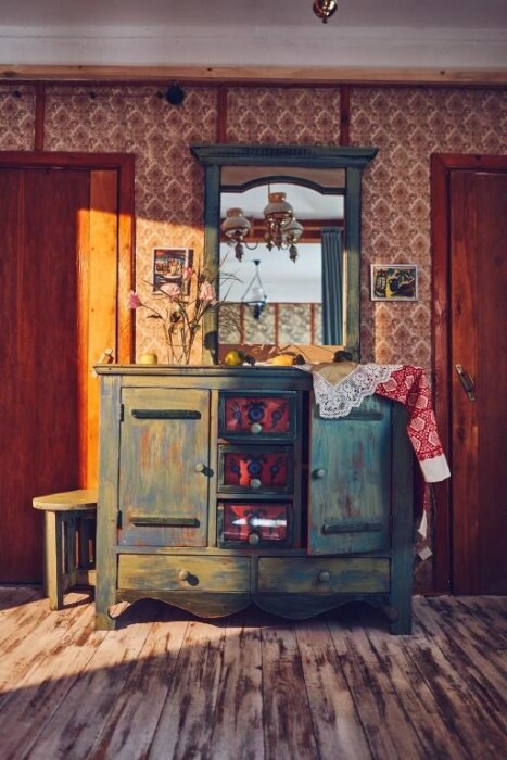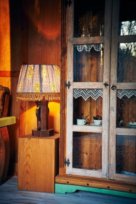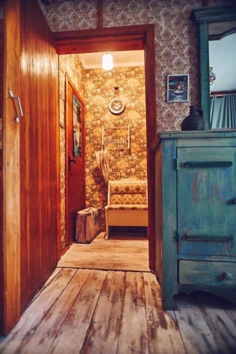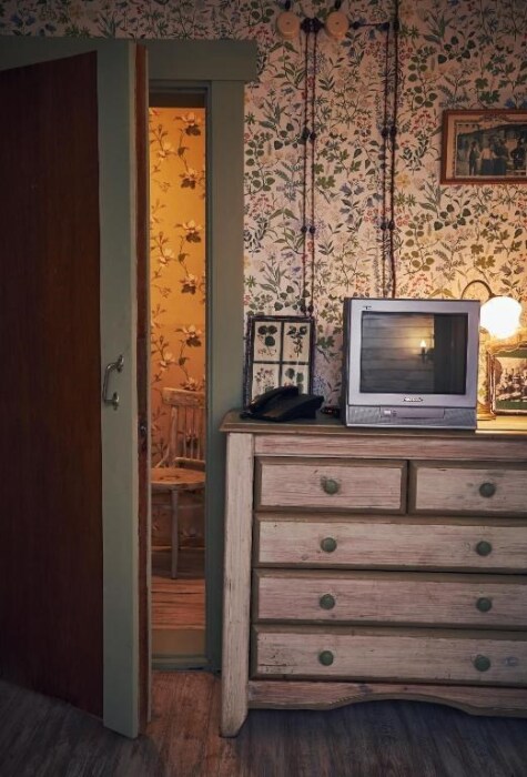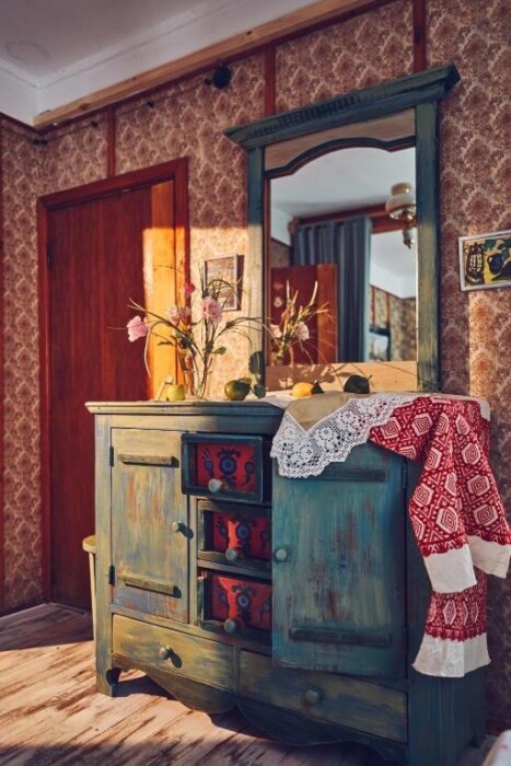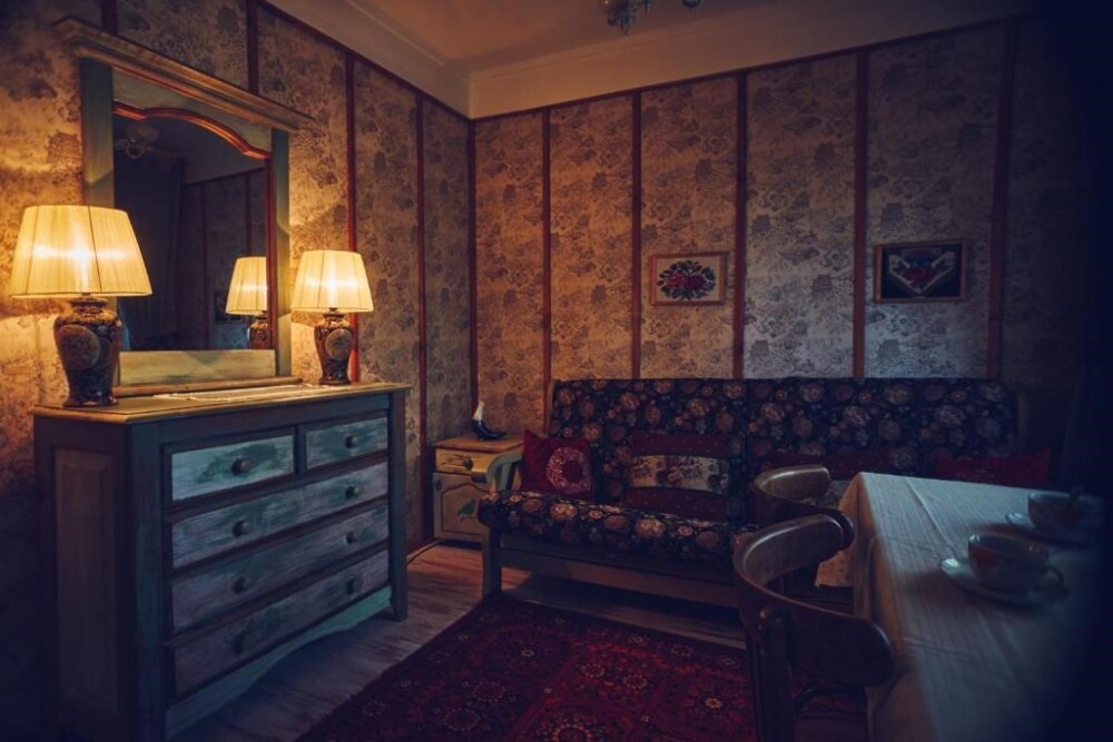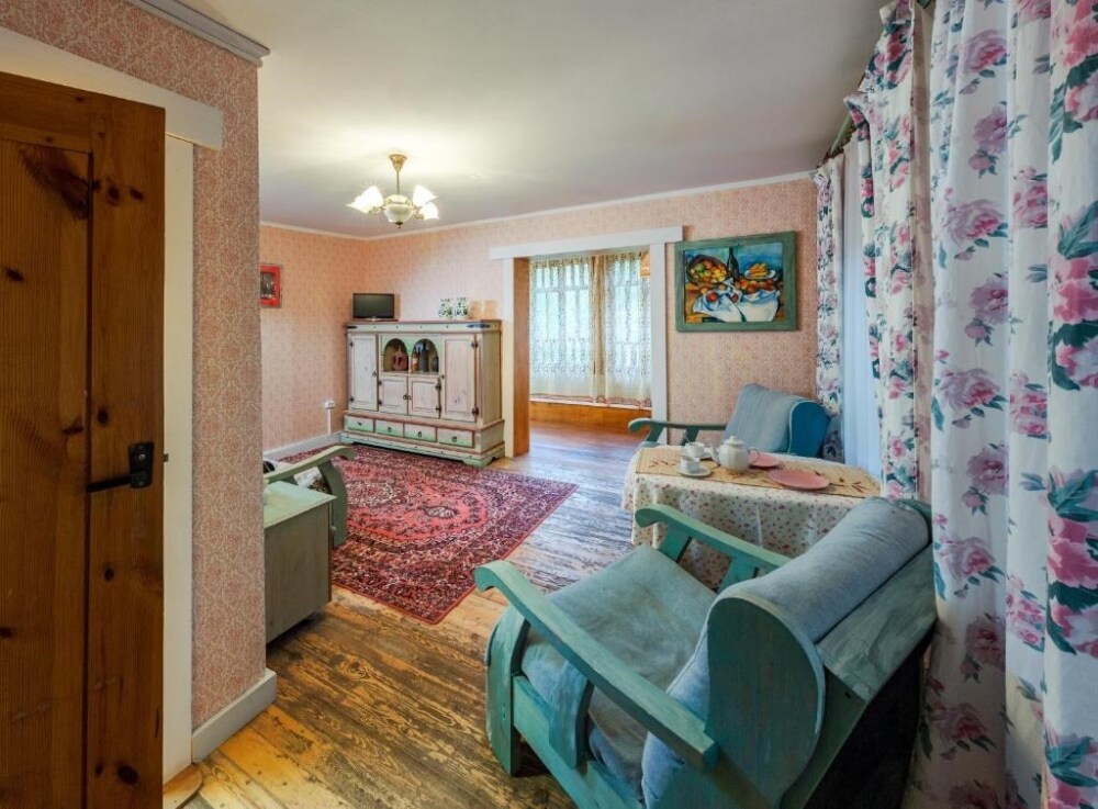 Двухкомнатный номер с индивидуальным дизайном и мебелью ручной работы в деревянном доме в стиле времен А.П.Чехова. В номере - двуспальная кровать, односпальная кровать, две тумбочки, два стула, комод, холодильник, телевизор, электрочайник. Ванная комната с ванной и туалетом.