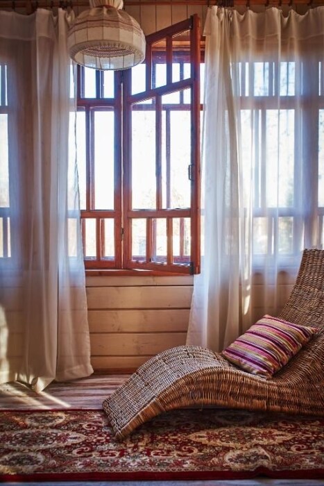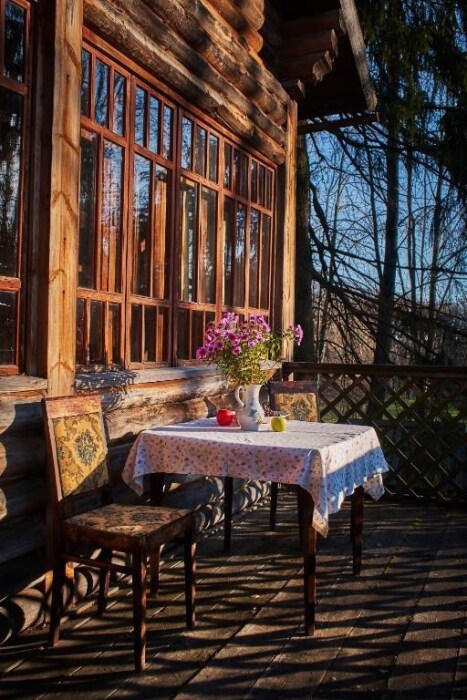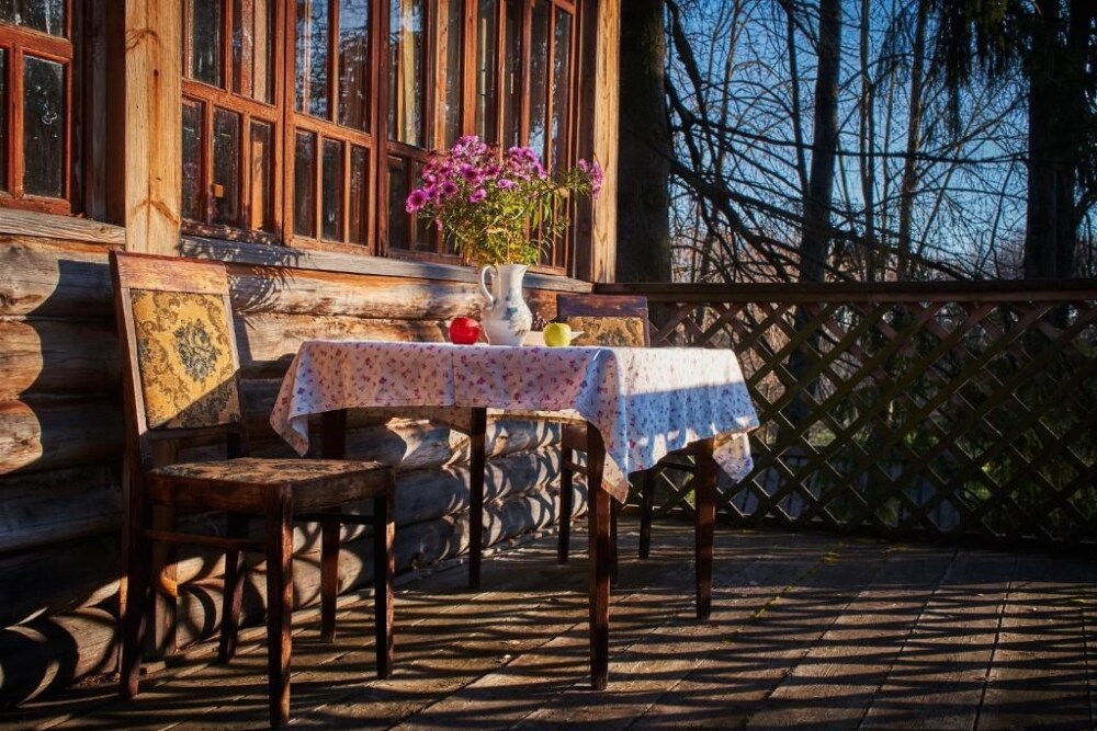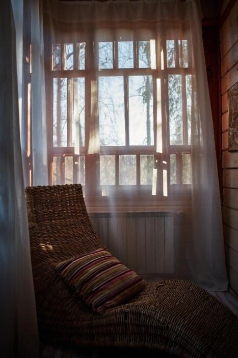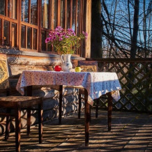 Двухкомнатный номер с верандой и отдельным входом, мебель ручной работы в деревянном доме в стиле времен А.П.Чехова. В номере - двуспальная кровать, две тумбочки, два стула, диван, два кресла, холодильник, телевизор, электрочайник, фен, тапочки, халаты. Ванная комната с душем и туалетом.
