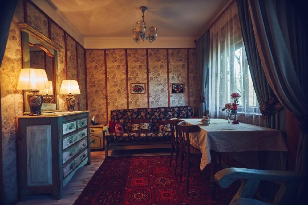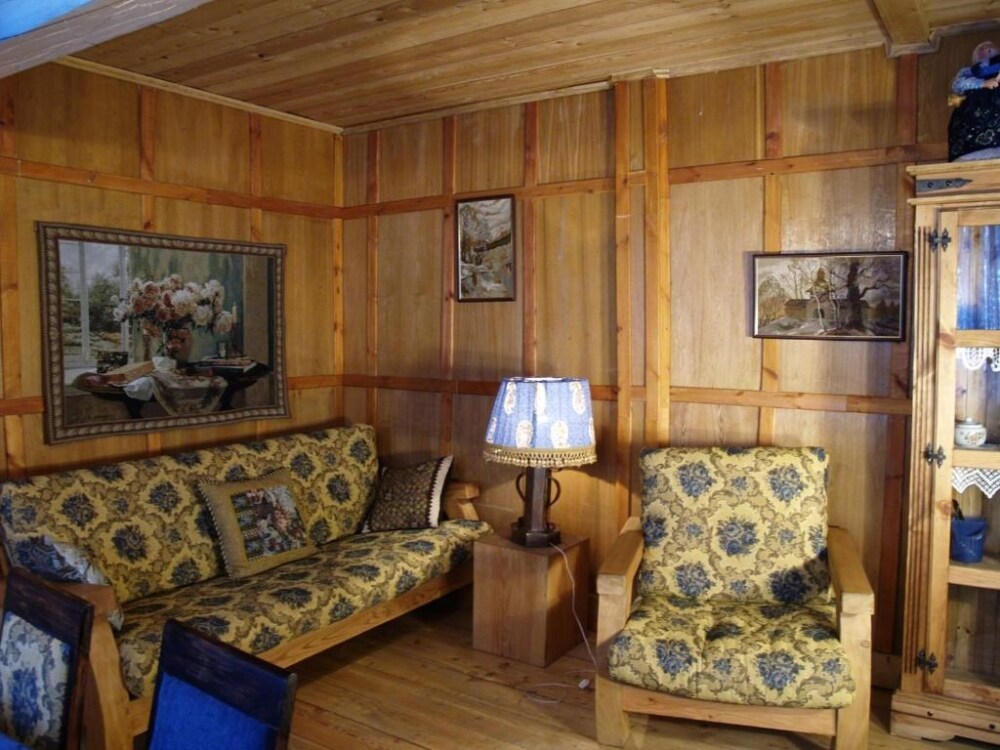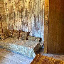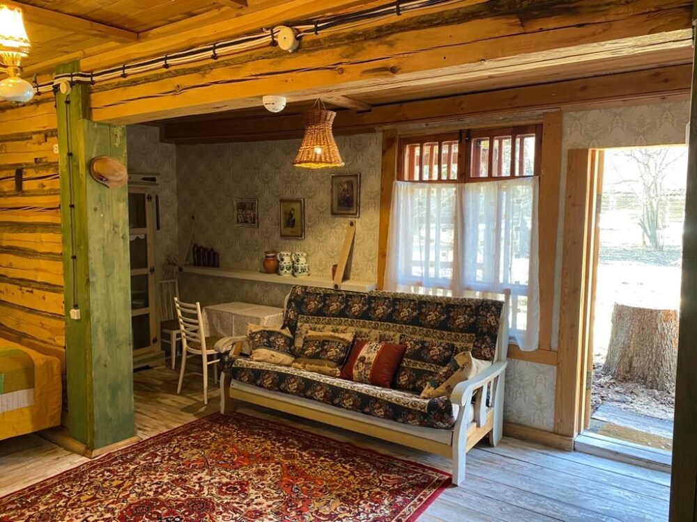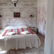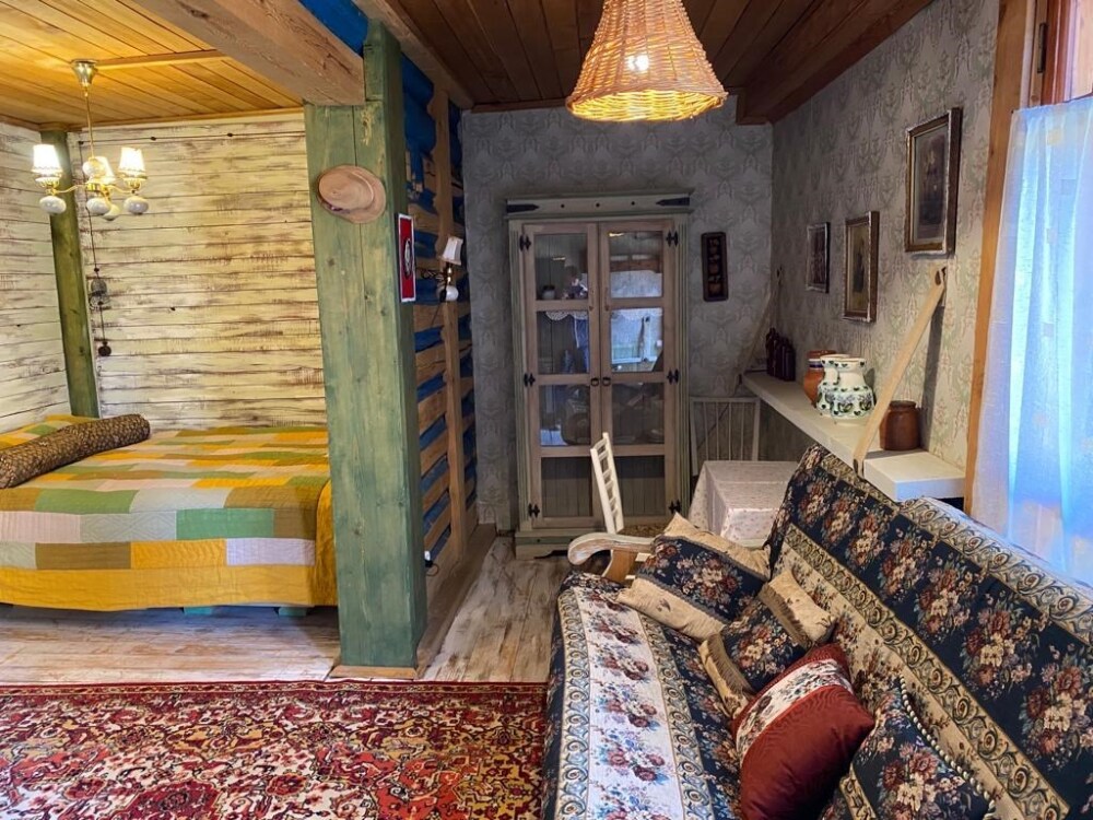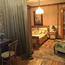 Двухкомнатный номер с индивидуальным дизайном и мебелью ручной работы в деревянном доме в стиле времен А.П.Чехова. В номере - двуспальная кровать, диван, две тумбочки, два стула, два кресла, холодильник, телевизор, электрочайник. Ванная комната с душем и туалетом.
