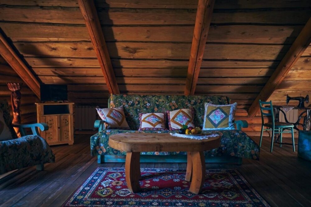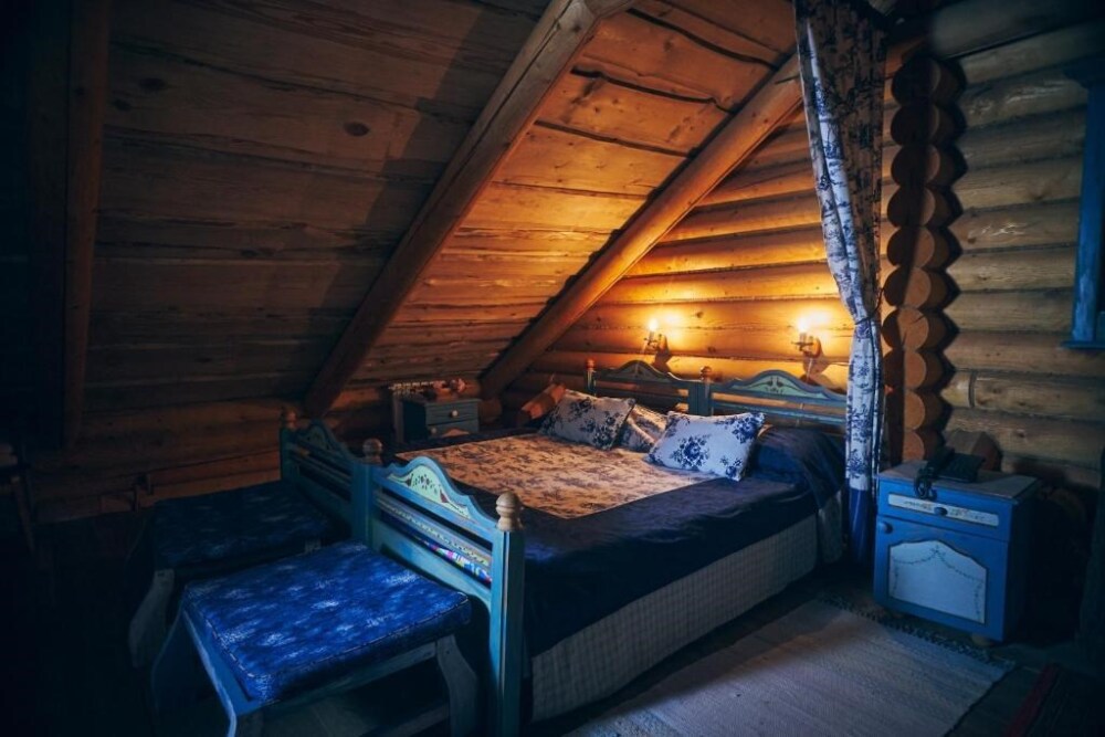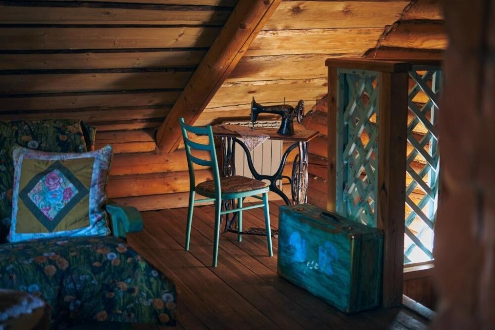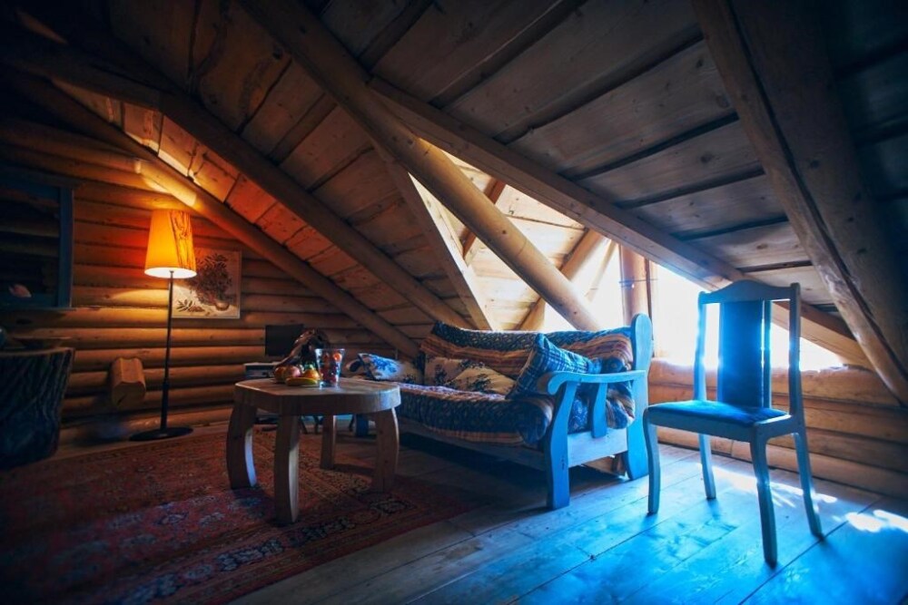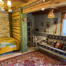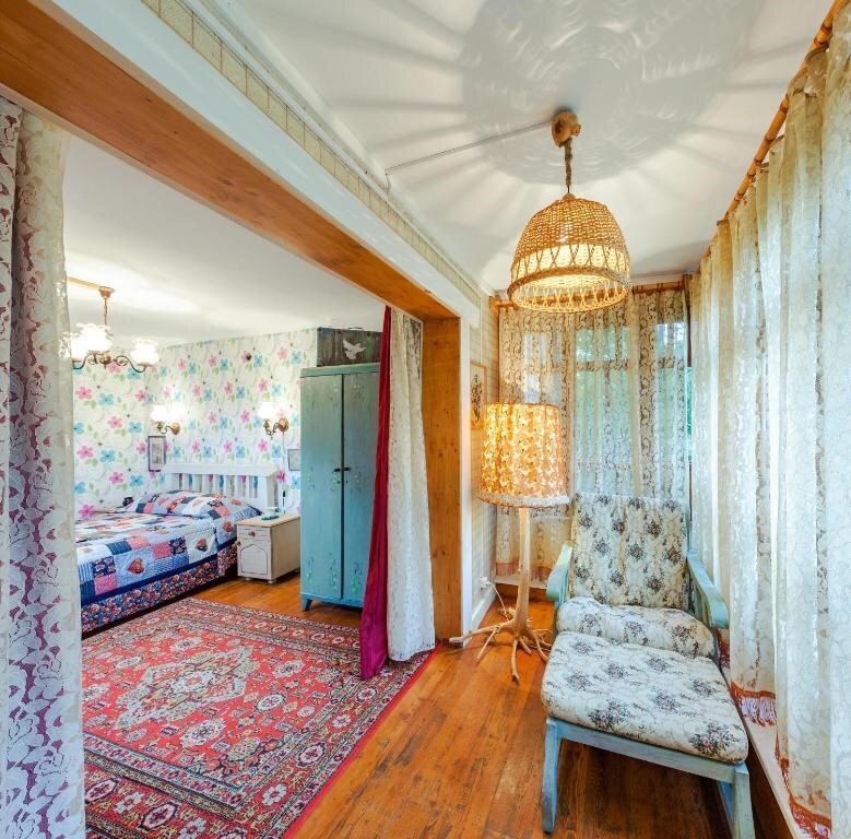 Двухуровневый номер с индивидуальным дизайном и мебелью ручной работы в деревянном доме в стиле времен А.П.Чехова. В номере - две раздельные кровати, два дивана, две тумбочки, четыре стула, два стола, комод, холодильник, телевизор, электрочайник, фен, тапочки. Ванная комната с душем, два санузла.