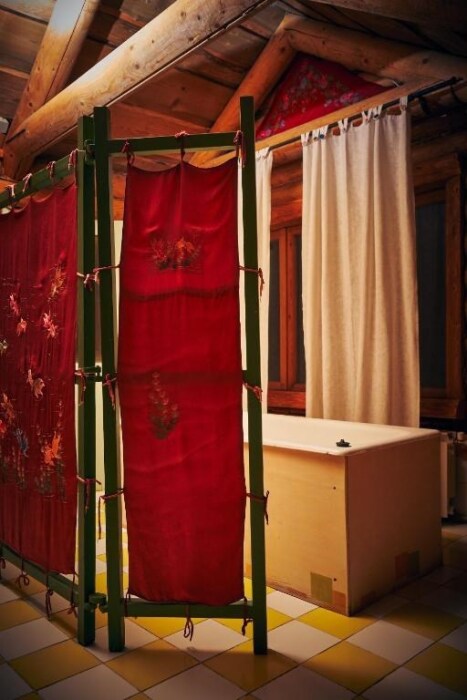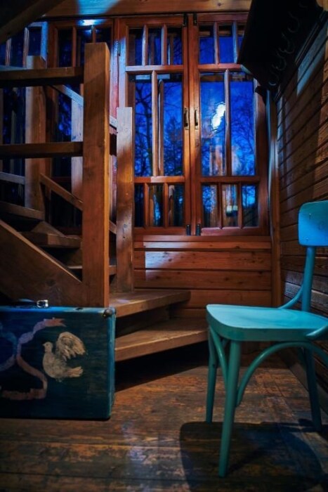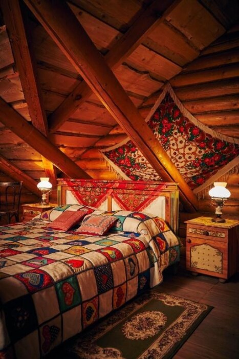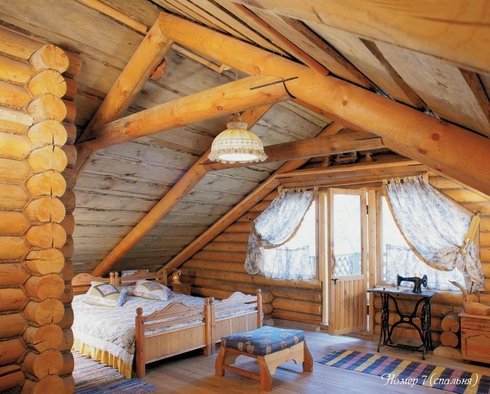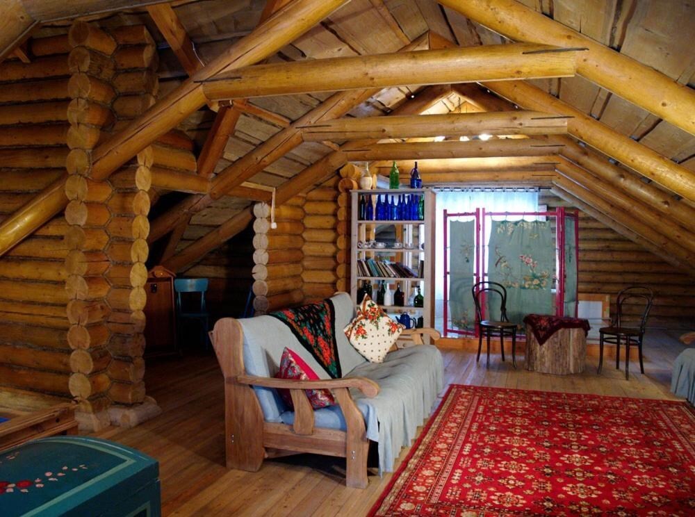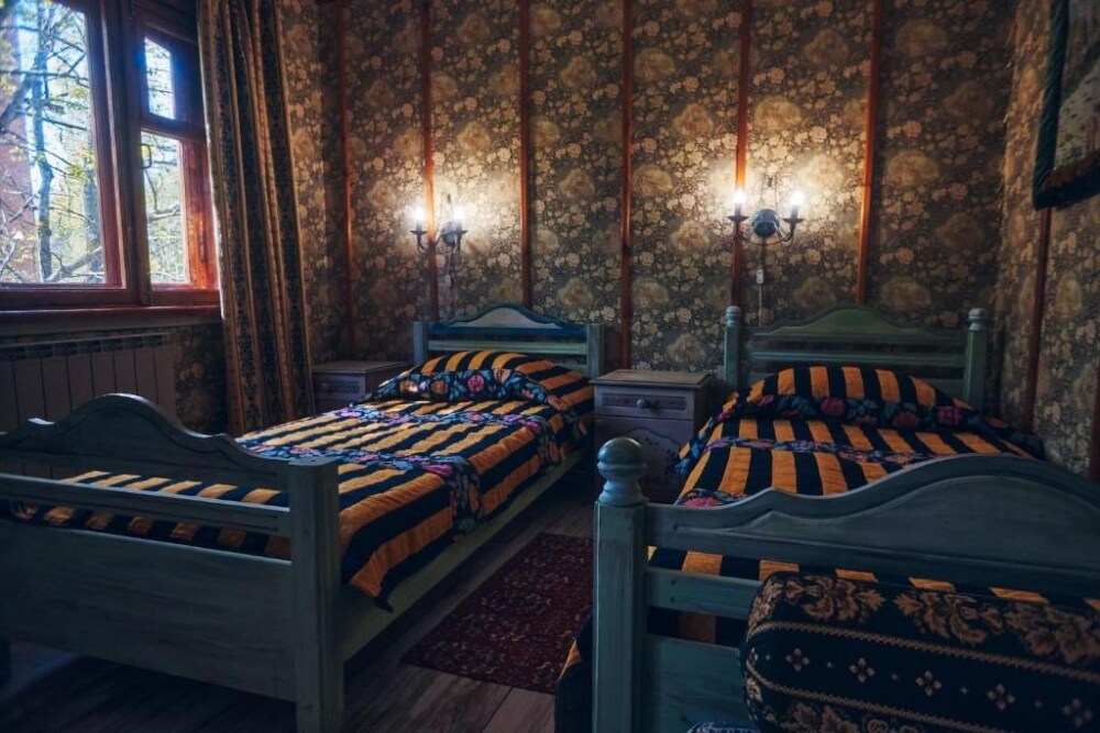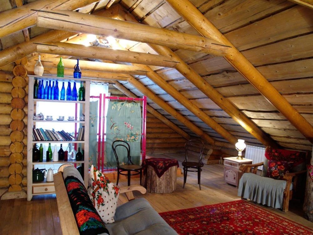Двухуровневый номер с индивидуальным дизайном и мебелью ручной работы в деревянном доме в стиле времен А.П.Чехова. В номере - две раздельные кровати, два дивана, две тумбочки, четыре стула, два стола, комод, холодильник, телевизор, электрочайник, фен, тапочки. Ванная комната с душем, два санузла.