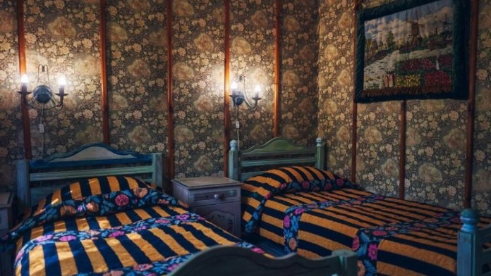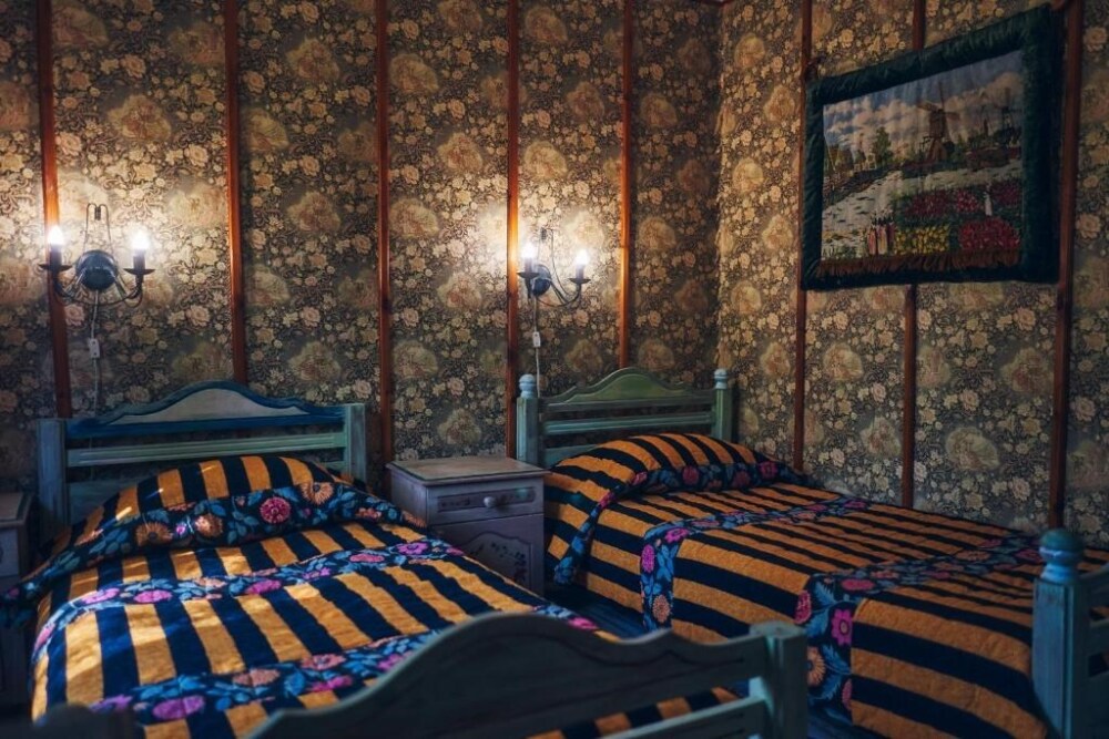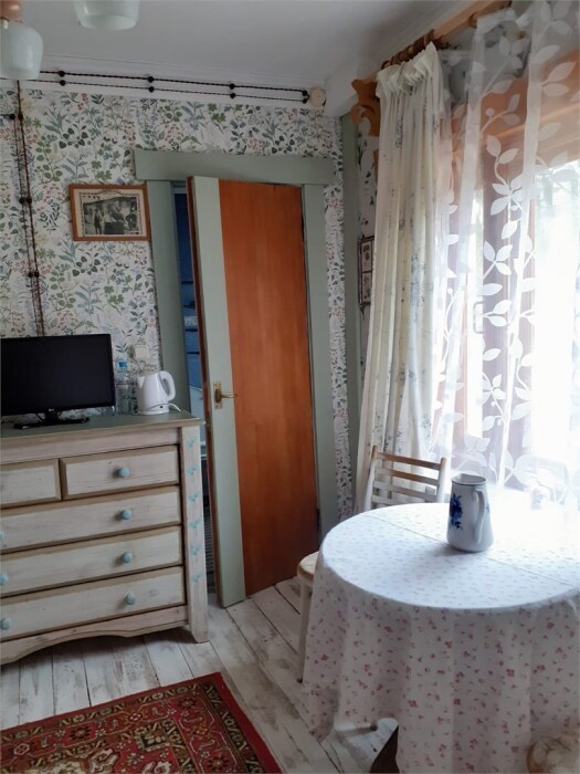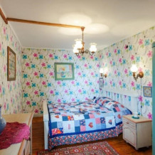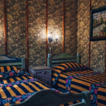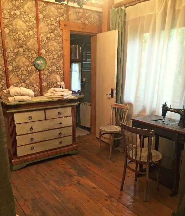 Однокомнатный номер с индивидуальным дизайном и мебелью ручной работы в деревянном доме в стиле времен А.П.Чехова. В номере - две раздельные кровати, две тумбочки, два стула, стол, комод, холодильник, телевизор, электрочайник, фен, тапочки. Ванная комната с душем и туалетом.