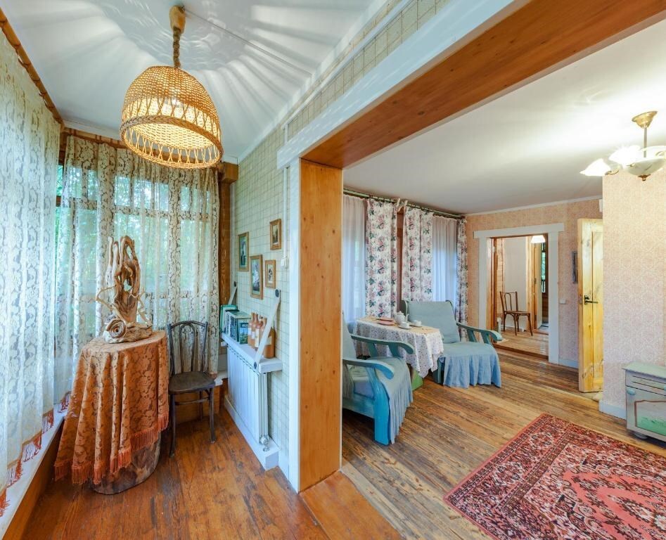 Трехкомнатный номер с индивидуальным дизайном и мебелью ручной работы в деревянном доме в стиле времен А.П.Чехова. В номере - двуспальная кровать, диван, две тумбочки, два стула, комод, холодильник, телевизор, электрочайник, фен, тапочки, халаты. Ванная комната с душем и туалетом.