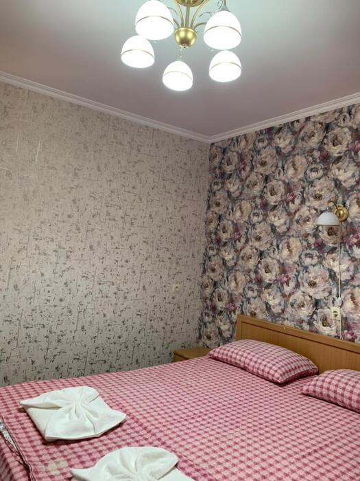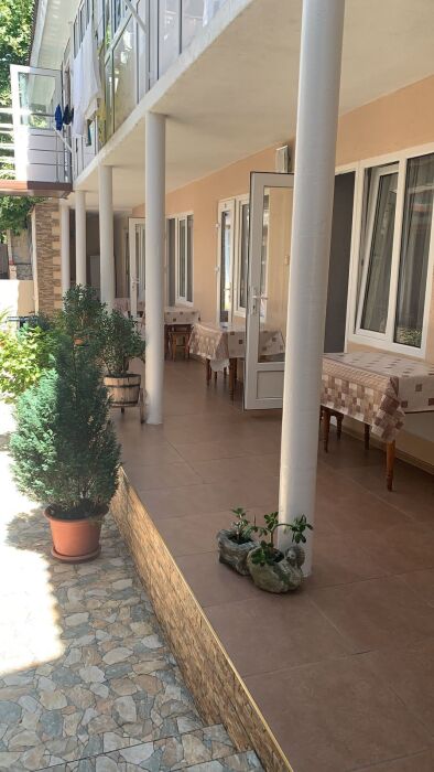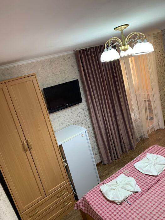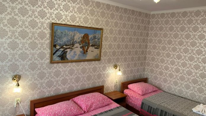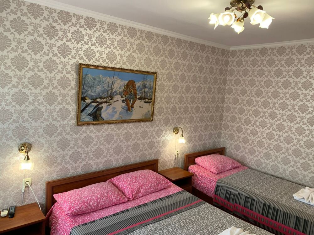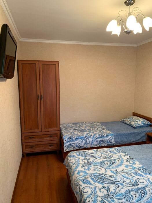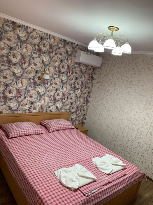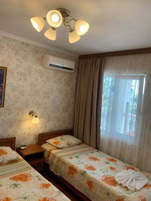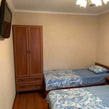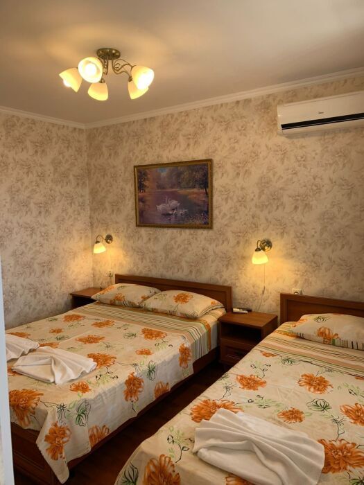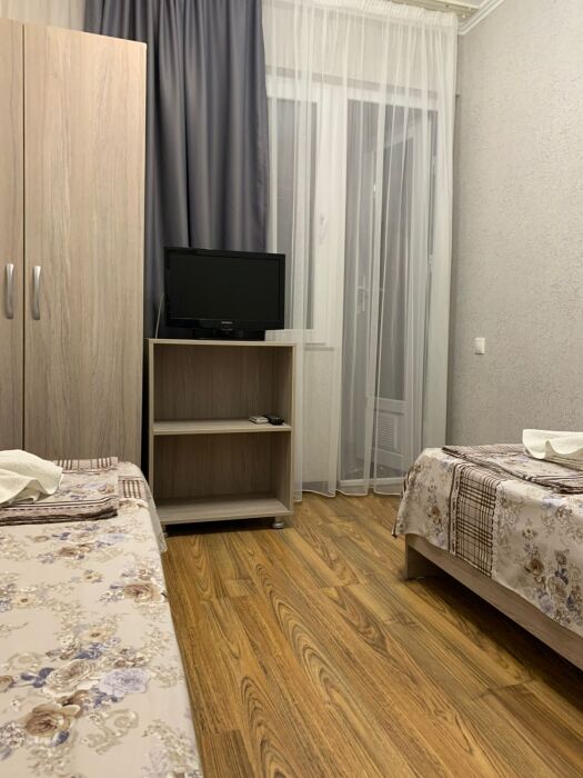 Номер в гостевом доме, одна двуспальная и одна односпальная кровати, шкаф, тумбочки, телевизор, холодильник, кондиционер. Душ и туалет общие.