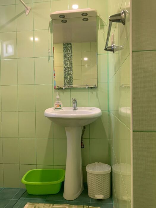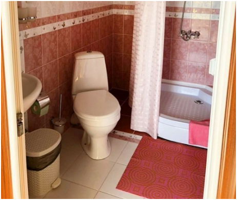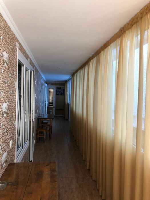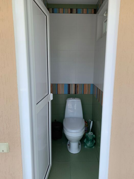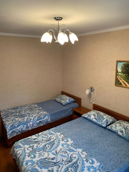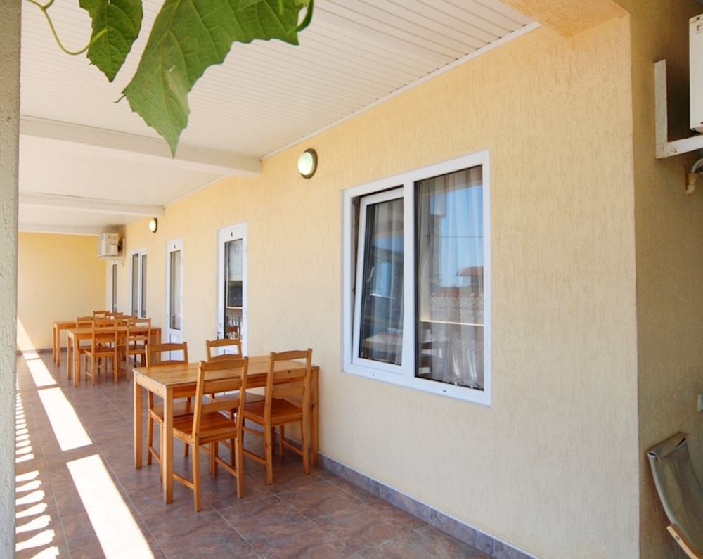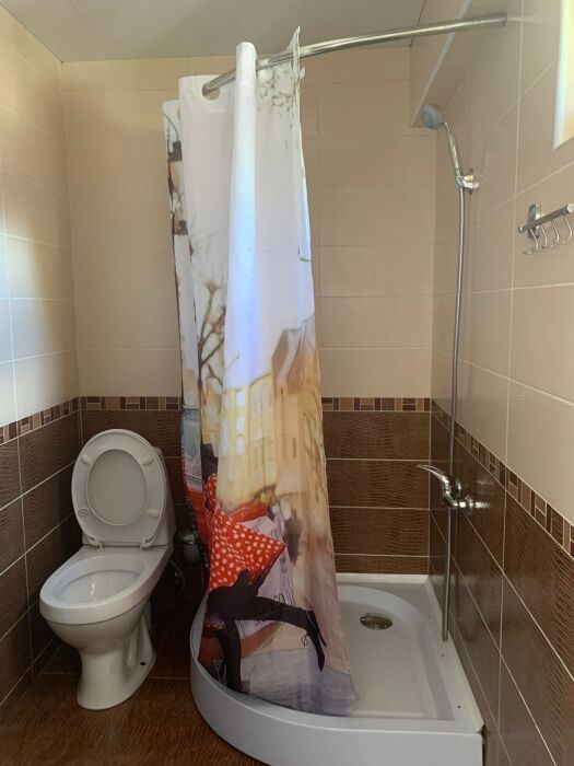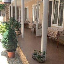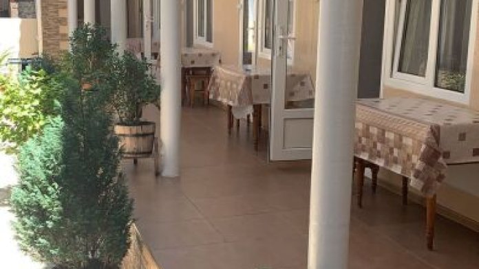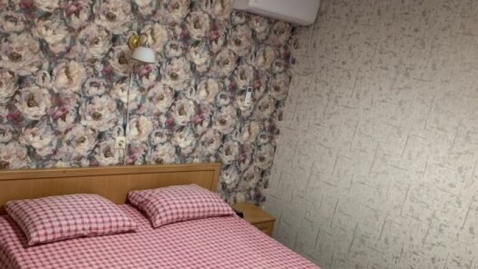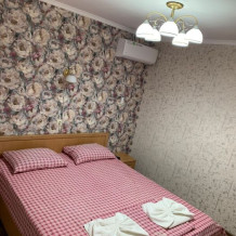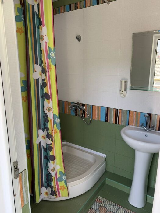 Номер в гостевом доме, одна двуспальная и одна односпальная кровати, шкаф, тумбочки, телевизор, холодильник, кондиционер. Душ и туалет общие.