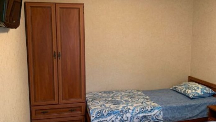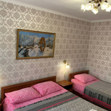 Трехместный номер в гостевом доме. Одна двуспальная и одна односпальная кровати, шкаф для одежды, тумбочки, телевизор, холодильник, кондиционер.
