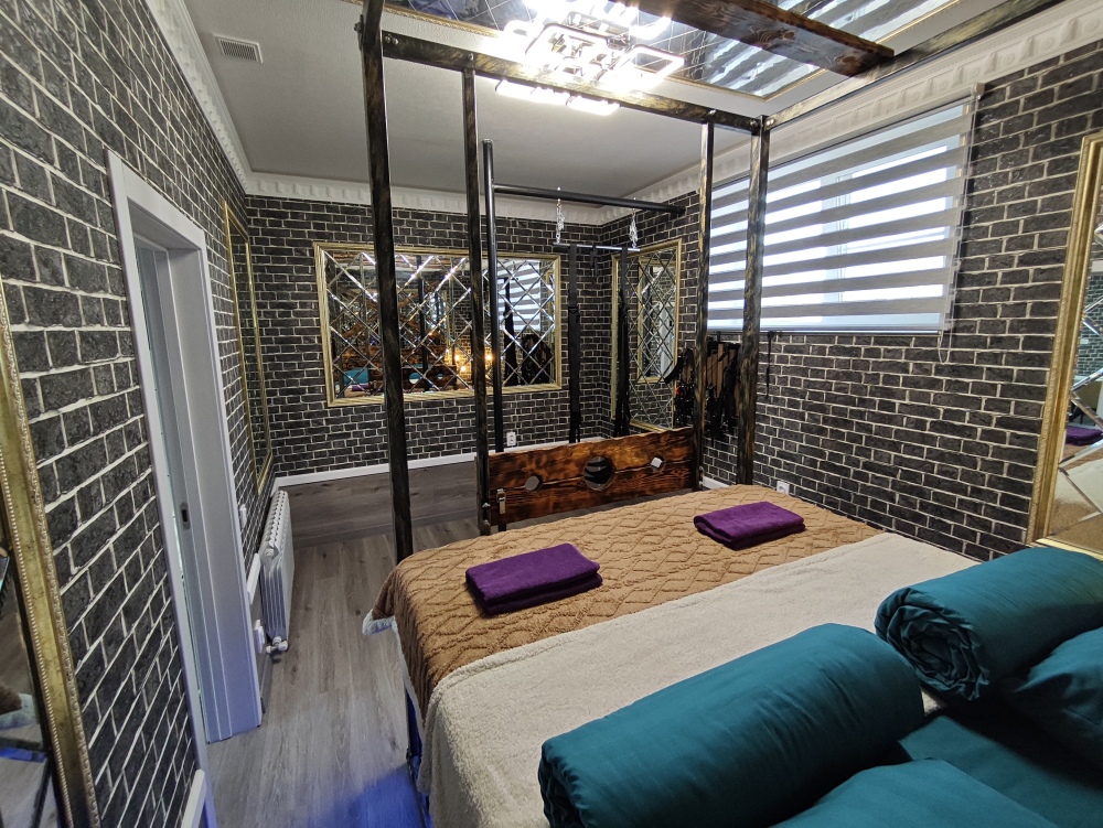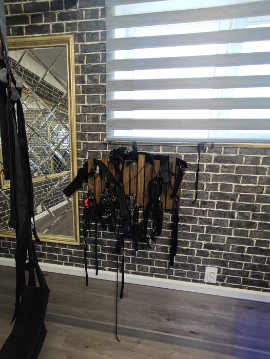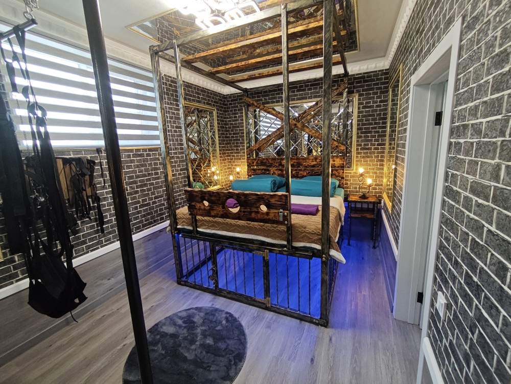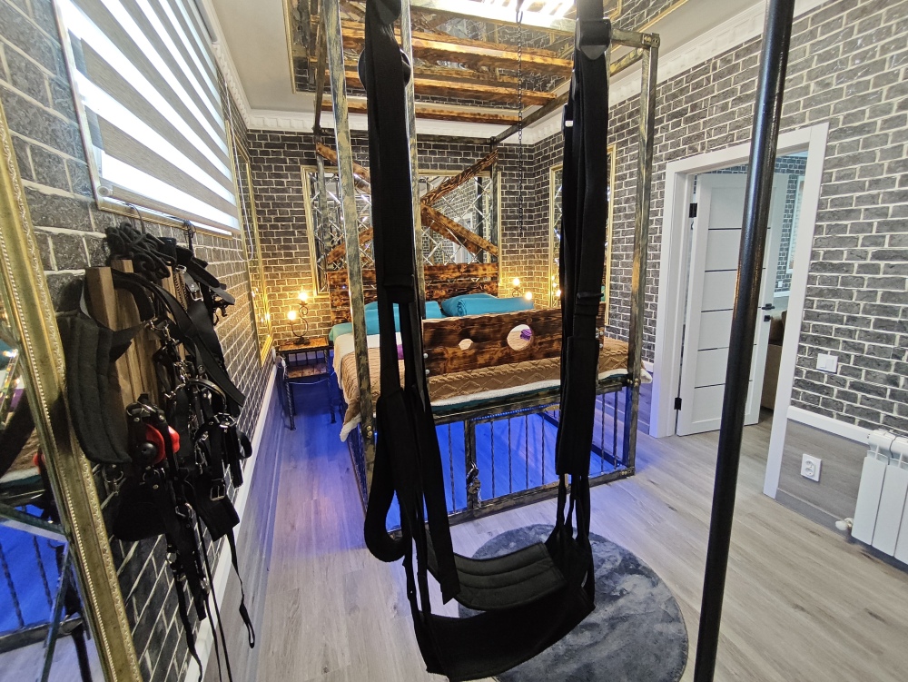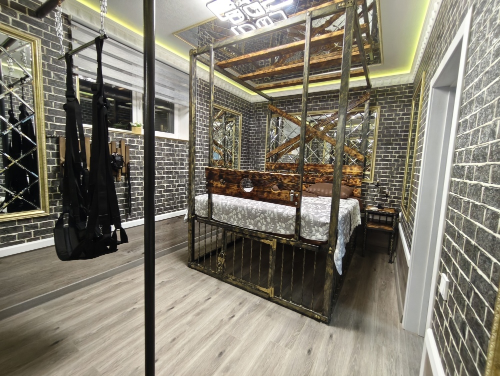 Воспользуйтесь предоставленной ХХХ-атрибутикой - плети, стеки, ошейники, цепи, веревки, эротические качели, шест, для воплощения ваших самых будоражащих фантазий.