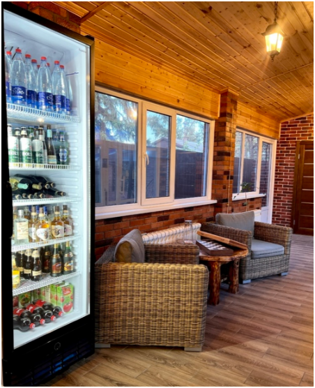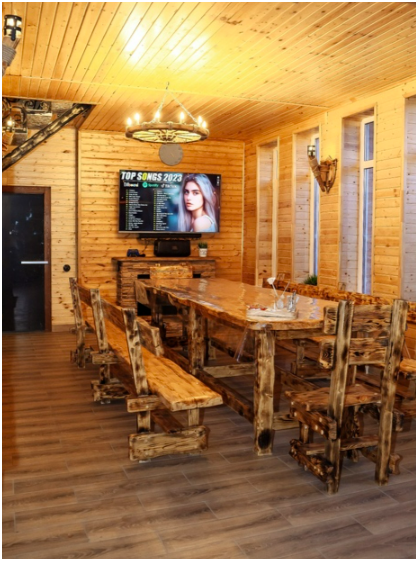 Общая комната отдыха с теплым полом, и 3-метровым столом, камином, зона кальяна, собственный бар, массажное кресло, караоке, игровая приставка, отдельные комнаты, кухня.