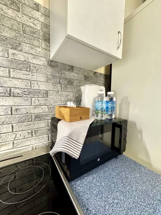- Плита, микроволновка, духовка, вытяжка, чайник, холодильник, мини-бар.