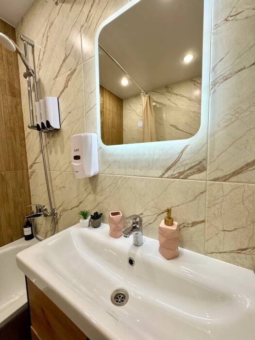 - Средства гигиены: шампунь, гель для душа, бальзам, жидкое мыло в дозаторах;