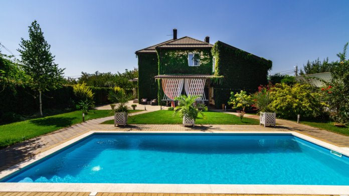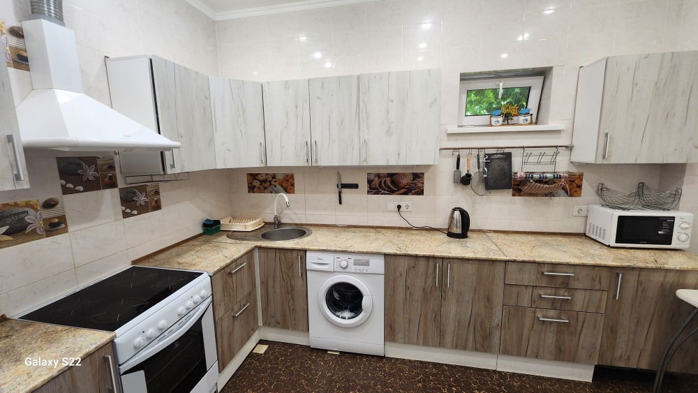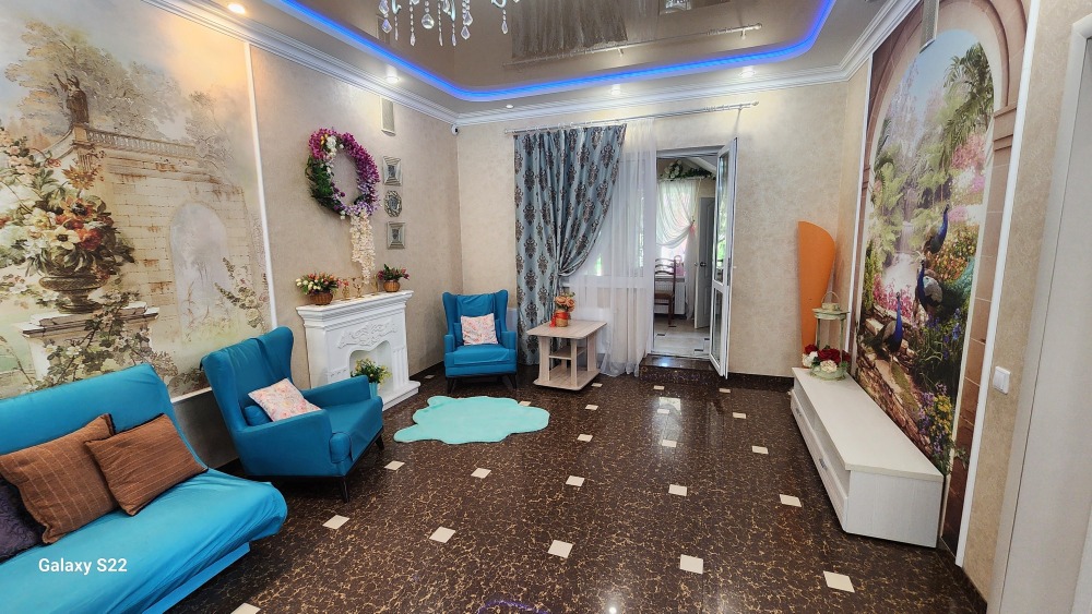 На благоустроенной территории 10 соток находится отдельно стоящее здание банного комплекса, теплый, открытый бассейн, зона барбекю, стационарный мангал ручной работы из царского старинного кирпича, казан, беседка с современной ротанговой мебелью, шезлонги для загара. Также на участке есть парковочные места на 6 авто. Участок с прекрасным ландшафтным дизайном, зеленый газон, множество цветов и растений.