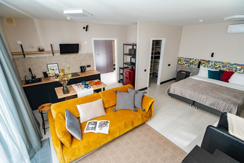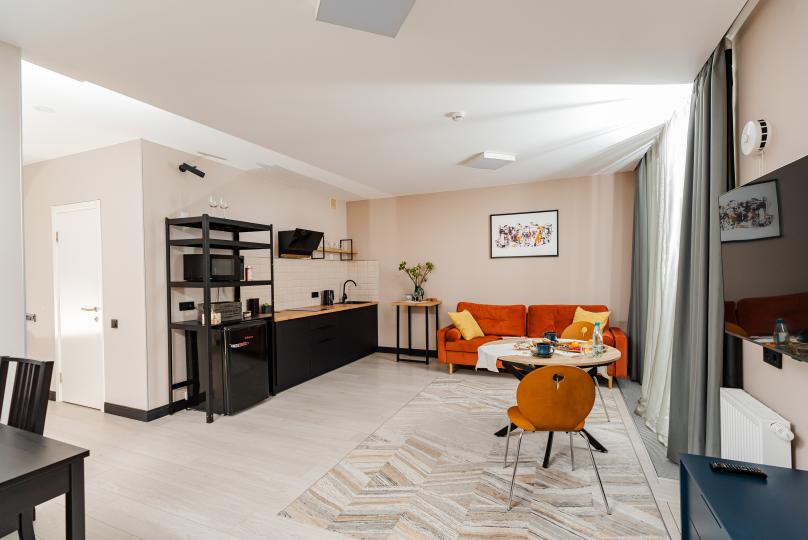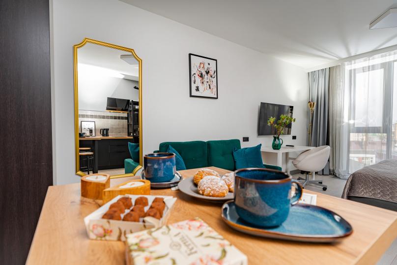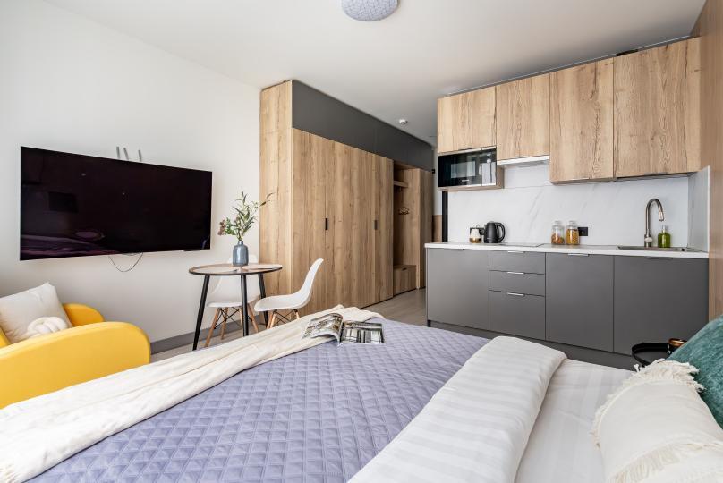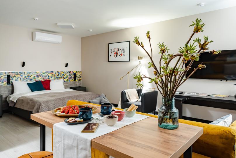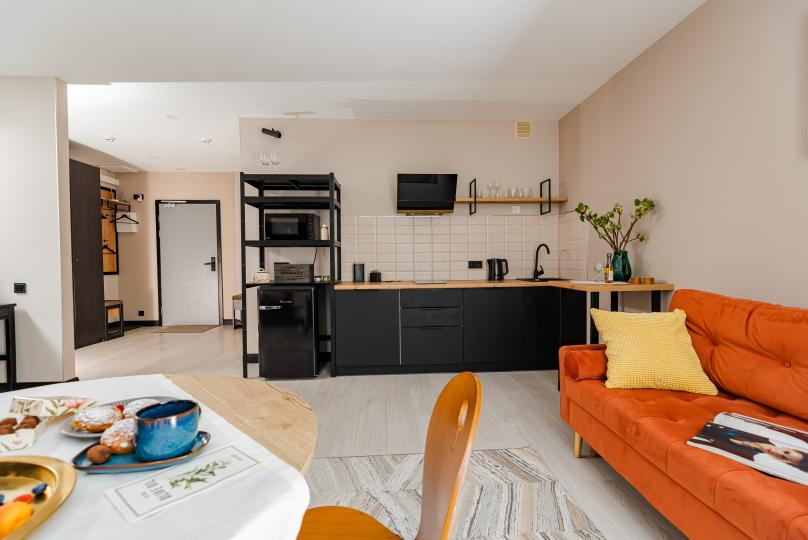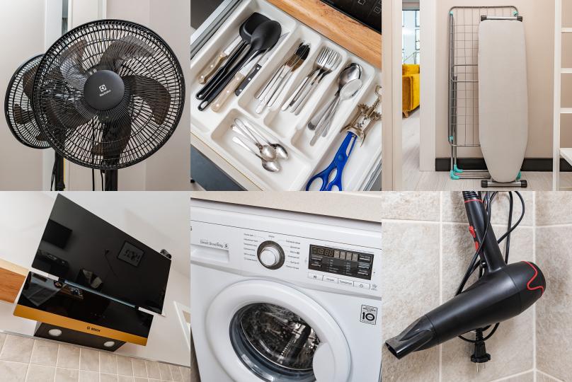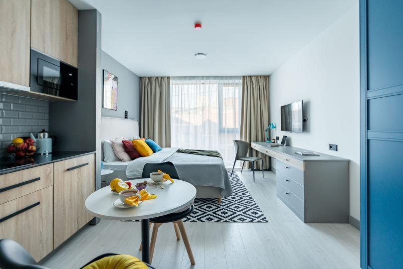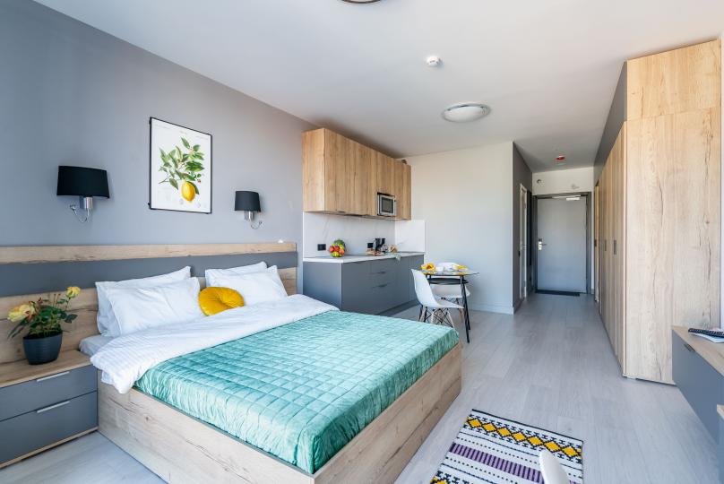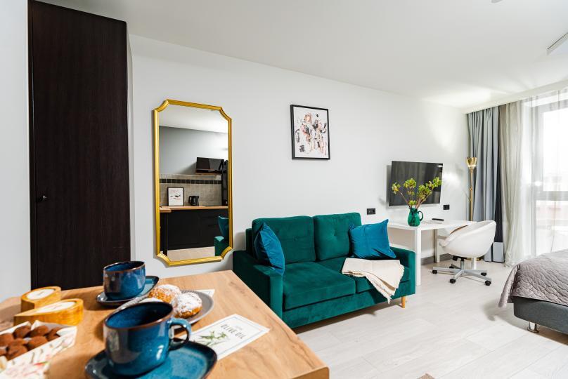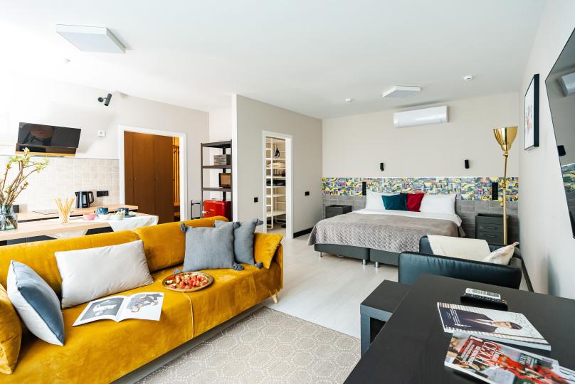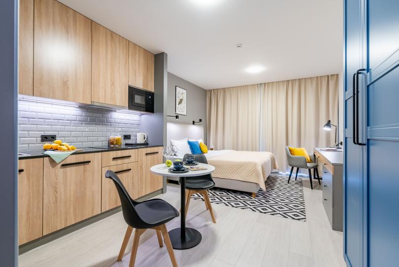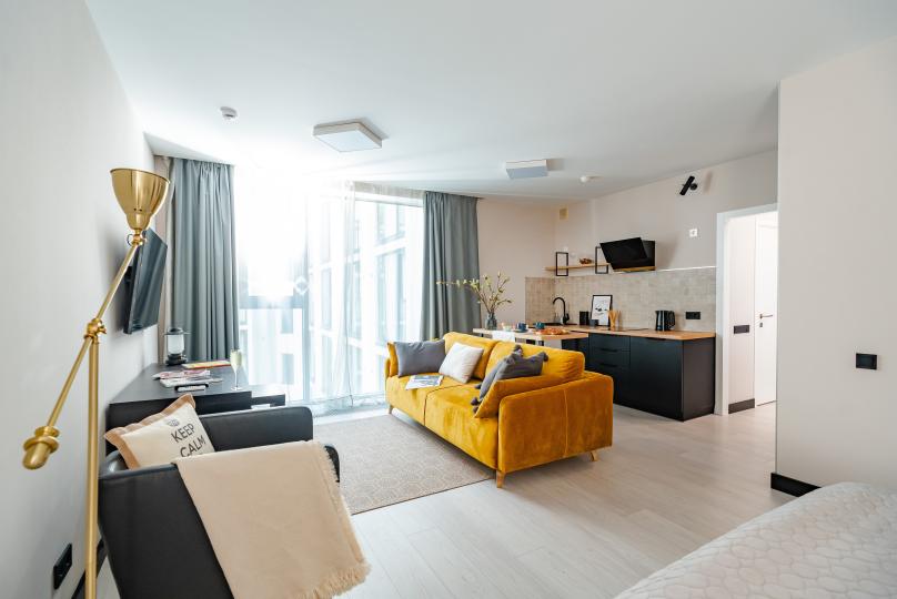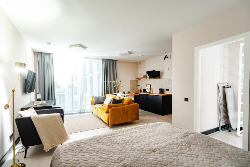 Все апартаменты оснащены удобными кроватями с гипоаллергенными подушками и постельным бельем, шкафами для хранения одежды, телевизорами с плоским экраном и спутниковыми каналами. В апартаментах есть собственная ванная комната и мини-кухня со всей необходимой посудой и техникой, включая плиту, холодильник, электрический чайник, микроволновую печь. Также гости могут воспользоваться феном, утюгом и гладильной доской. Гостям предоставляются комплект постельного белья и полотенец, тапочки, гигиенические принадлежности.