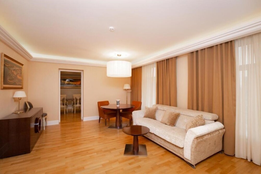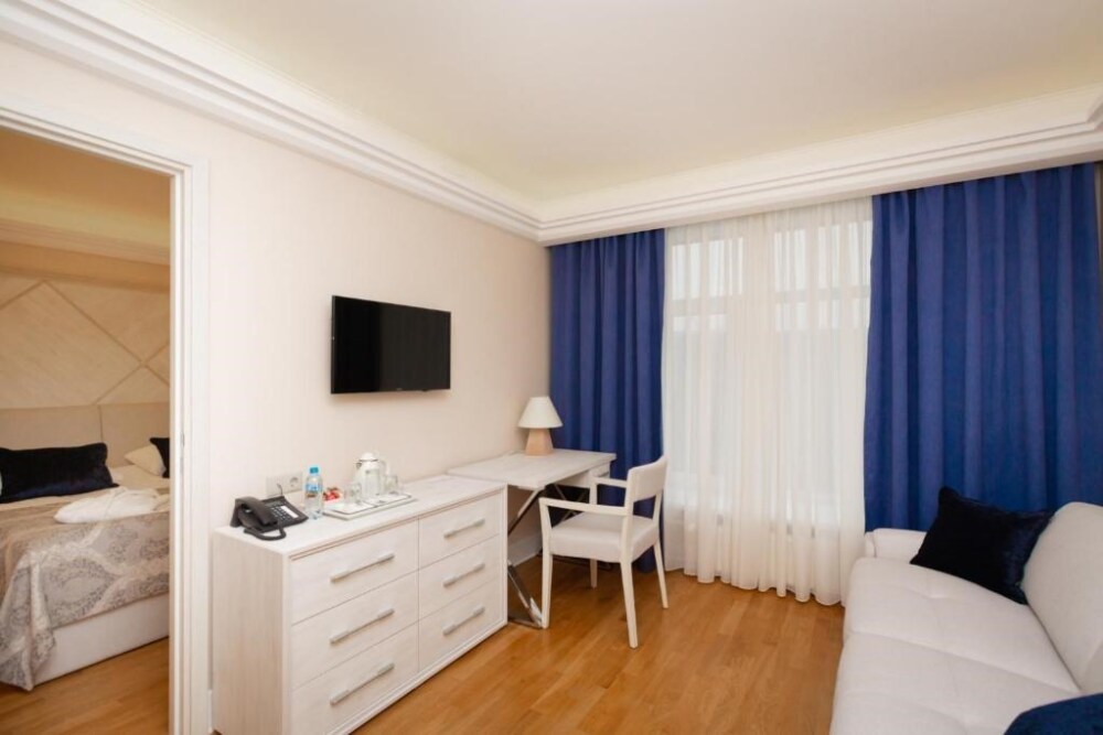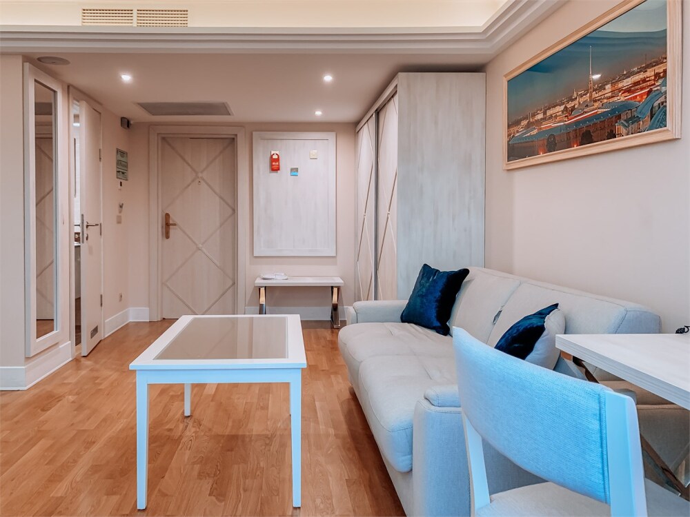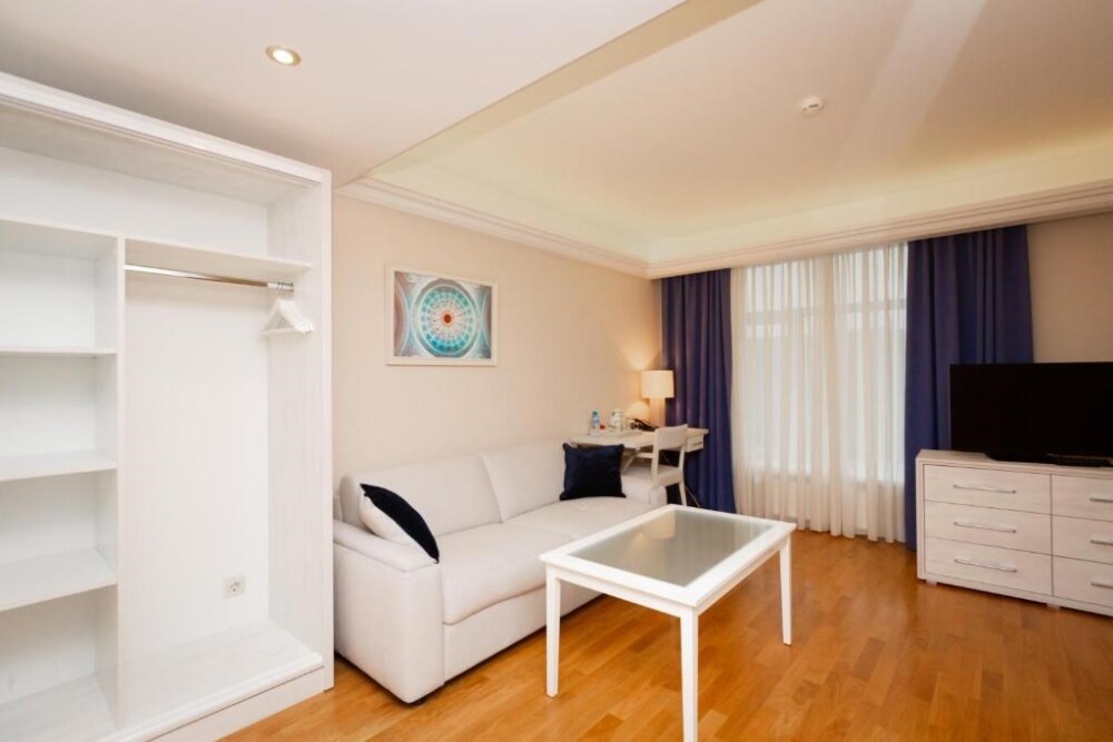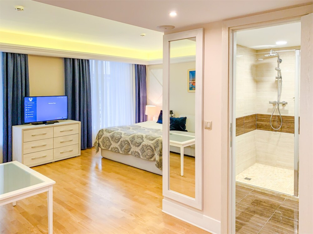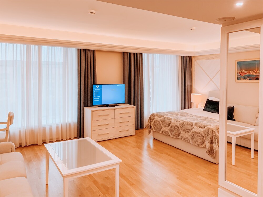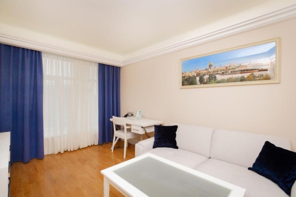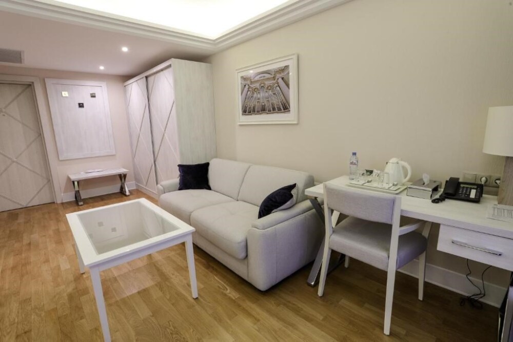 Просторный номер с отдельной гостиной зоной площадью 34 кв. м. идеально подходит для семейного размещения.