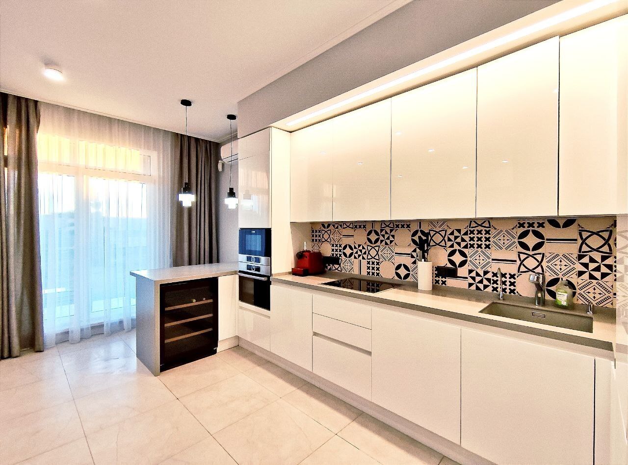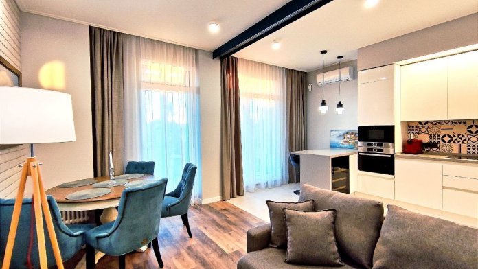 Кухня-гостиная с выходом на террасу: садовая мебель и шезлонги ждут Вас на свежем воздухе. Наслаждайтесь кофе под лучами сочинского солнца.