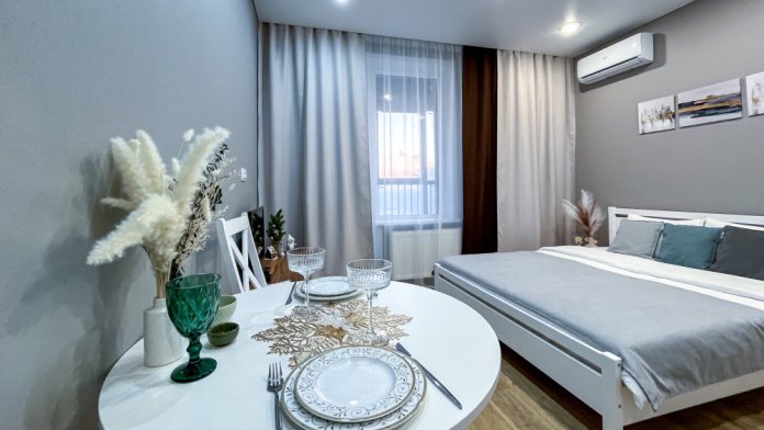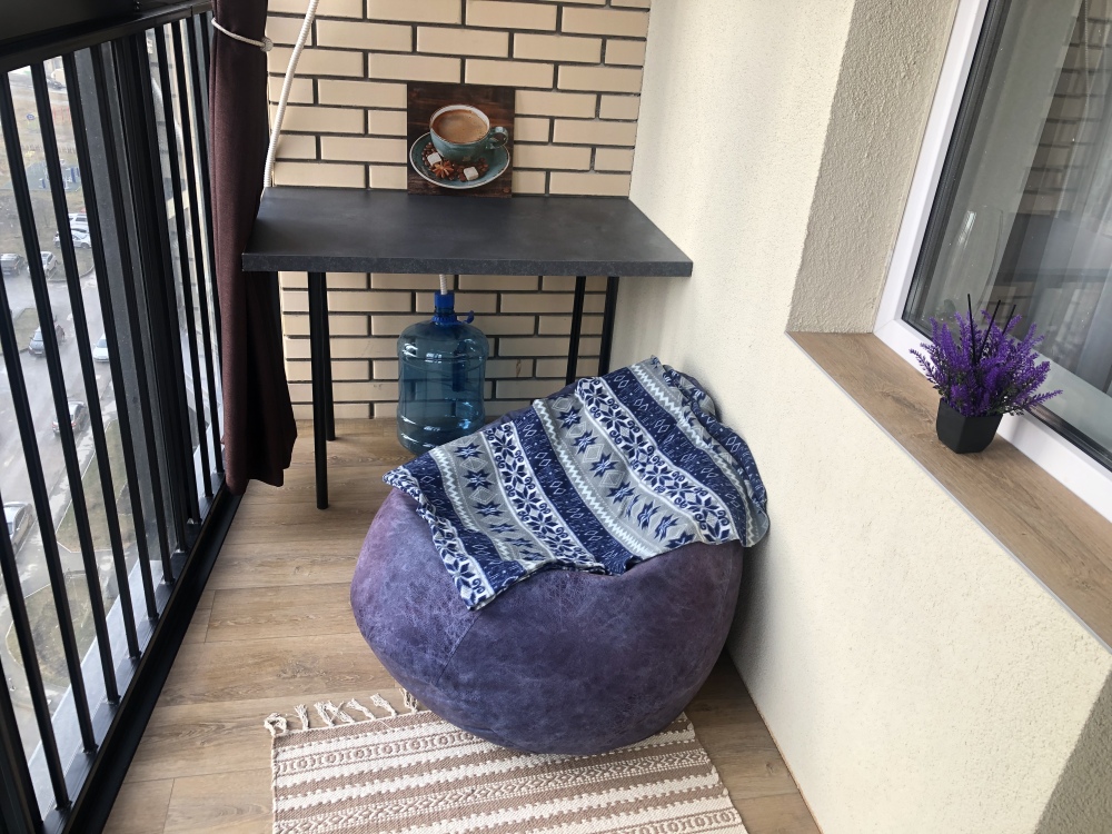 Гостиная: кондиционер, современная мебель, телевизор, двуспальная кровать с ортопедическим матрасом 160х200, декоративный свет, утюг, гладильная доска, шкаф, скоростной Wi-Fi, лоджия.