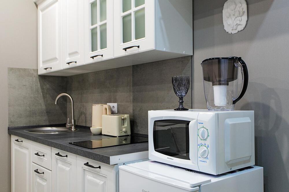 Оборудованная кухня: варочная панель, холодильник, микроволновая печь, электрический чайник, сервировочная посуда, посуда для приготовления, бокалы для шампанского, крепких напитков.
