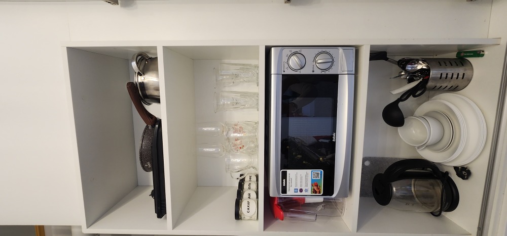 - Кастрюля, сковорода, тарелки, кружки, бокалы, стаканы, ножи, вилки, ложки, штопор и другие поварешки