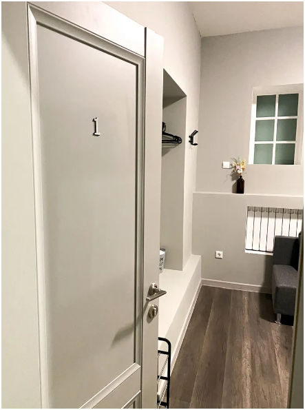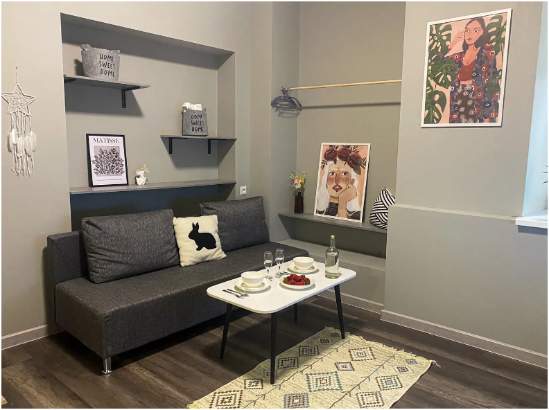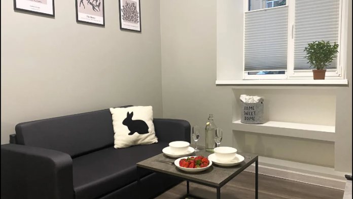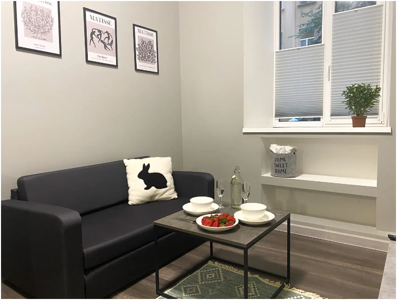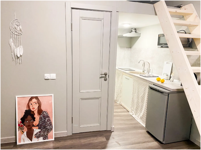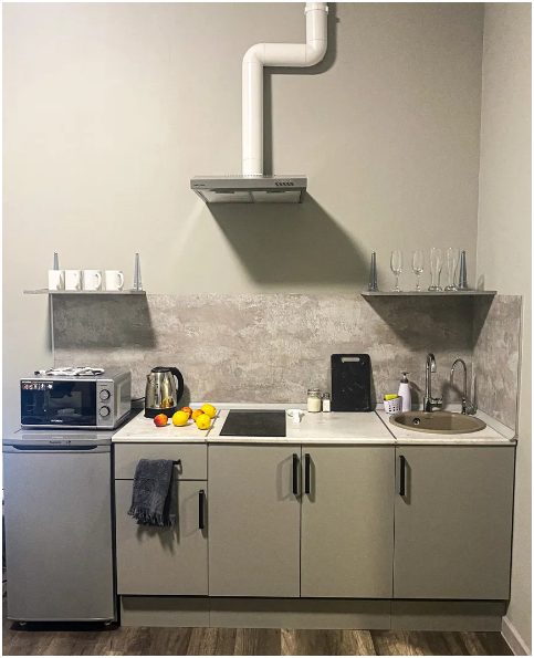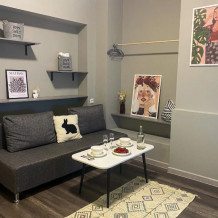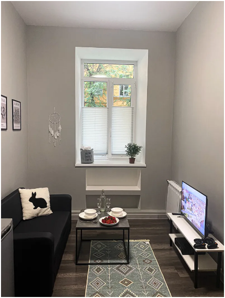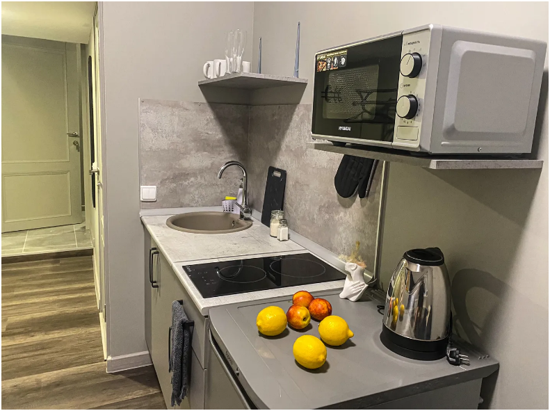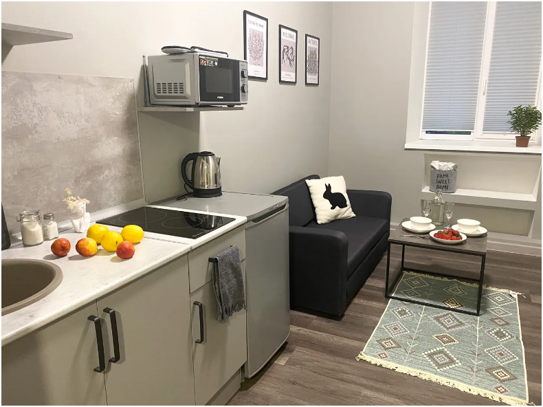 Квартира расположена на 1 этаже, оборудована всем необходимым: холодильник, электрическая плита, микроволновая печь, чайник, фен, стиральная машина, утюг, питьевая вода. Окна нет.