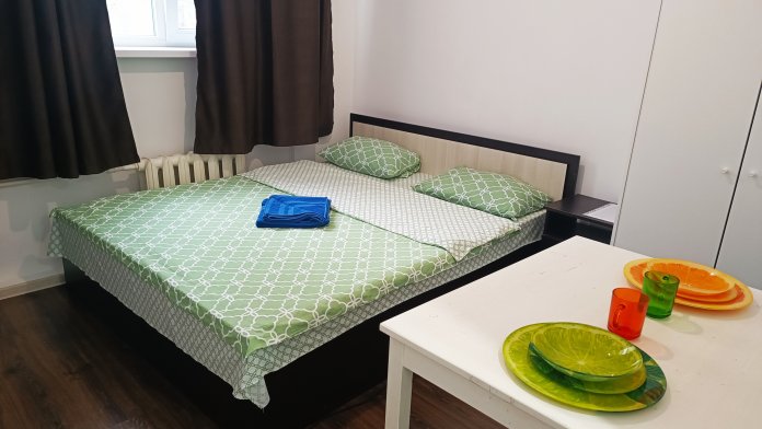 В комнате двуспальный раскладной диван, обеденный стол со стульями, встроенная кухня с мебелью, техникой, посудой и столовыми приборами. Интернет Wi-Fi, ЖК ТВ, глаженное постельное белье и полотенца. Санузел с душевой кабиной и стиральной машиной.