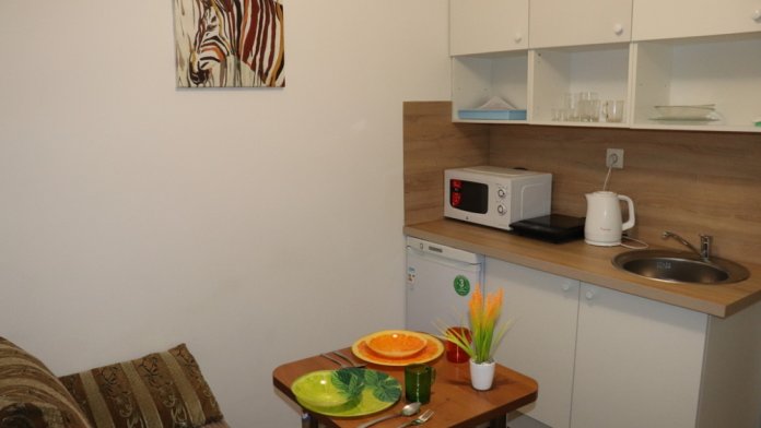 В комнате двуспальный раскладной диван, обеденный стол со стульями, встроенная кухня с мебелью, техникой, посудой и столовыми приборами. Интернет Wi-Fi, ЖК ТВ, глаженное постельное белье и полотенца. Санузел с душевой кабиной и стиральной машиной.