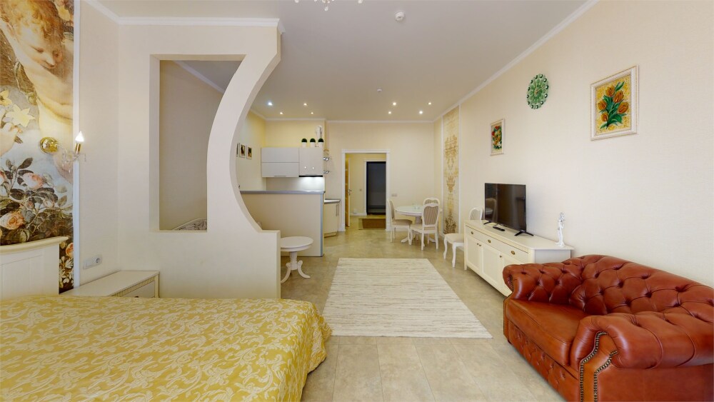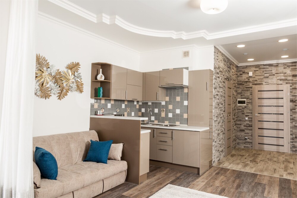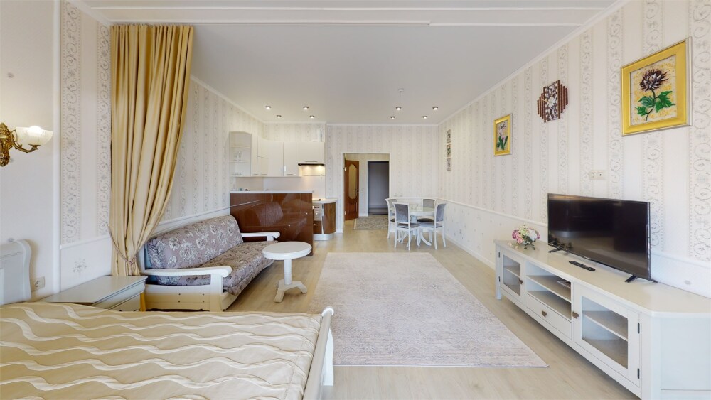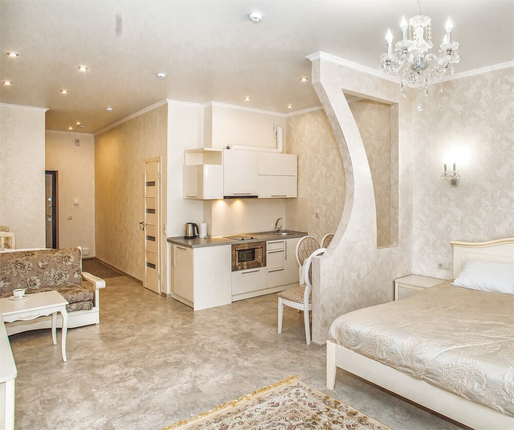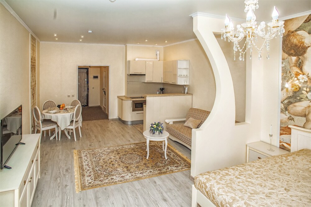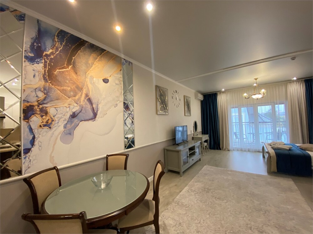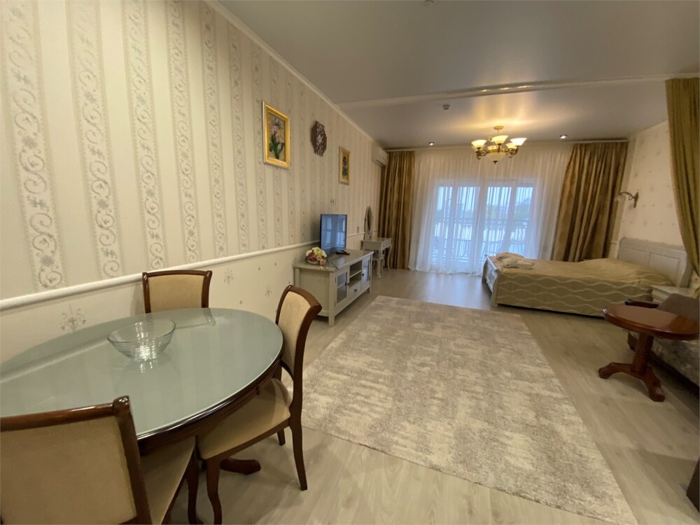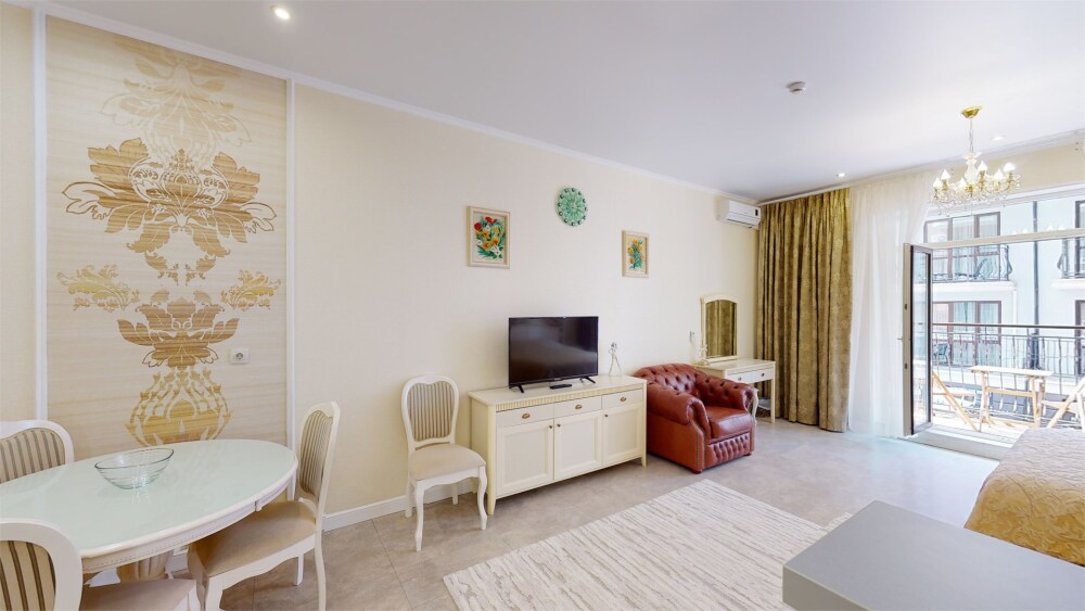 Апартаменты- студия с балконом оснащены кондиционером, телевизором с плоским экраном и кабельными каналами. Бесплатный Wi-Fi В апартаментах обустроены гостиная и обеденная зона. Двуспальная кровать с ортопедическим матрасом и диван -кровать. В числе удобств мини-кухня с микроволновой печью, холодильником и чайником. В распоряжении гостей собственная ванная комната с тапочками и феном. Гостям предоставляются полотенца и постельное белье. Для доступа к верхним этажам работает лифт.