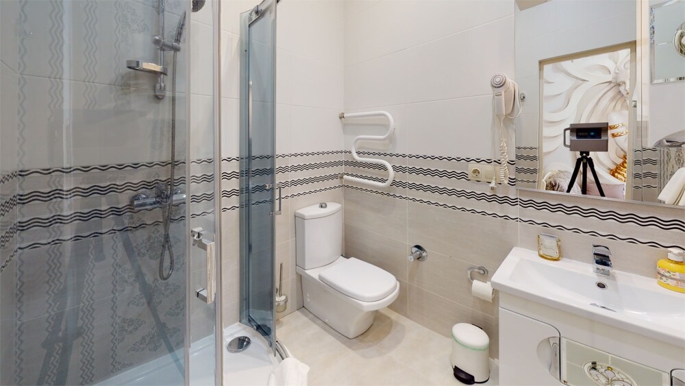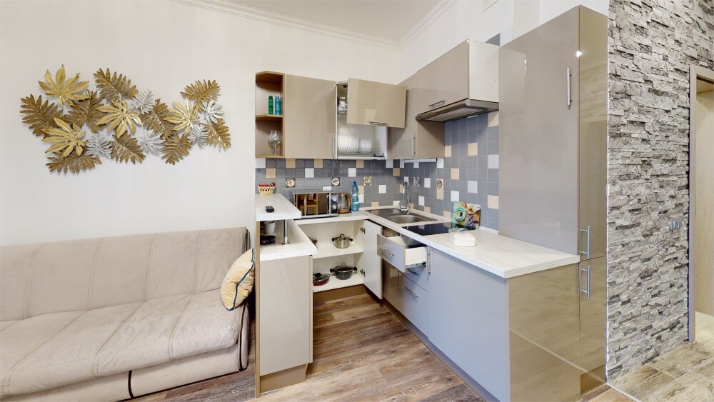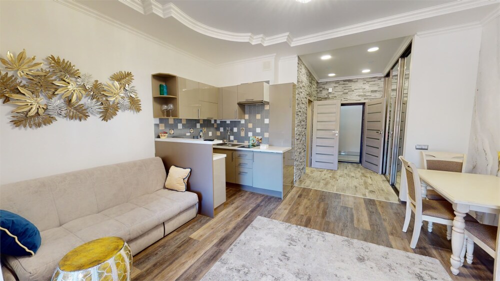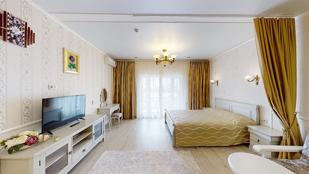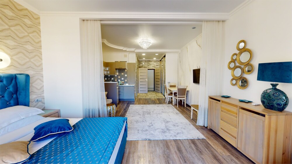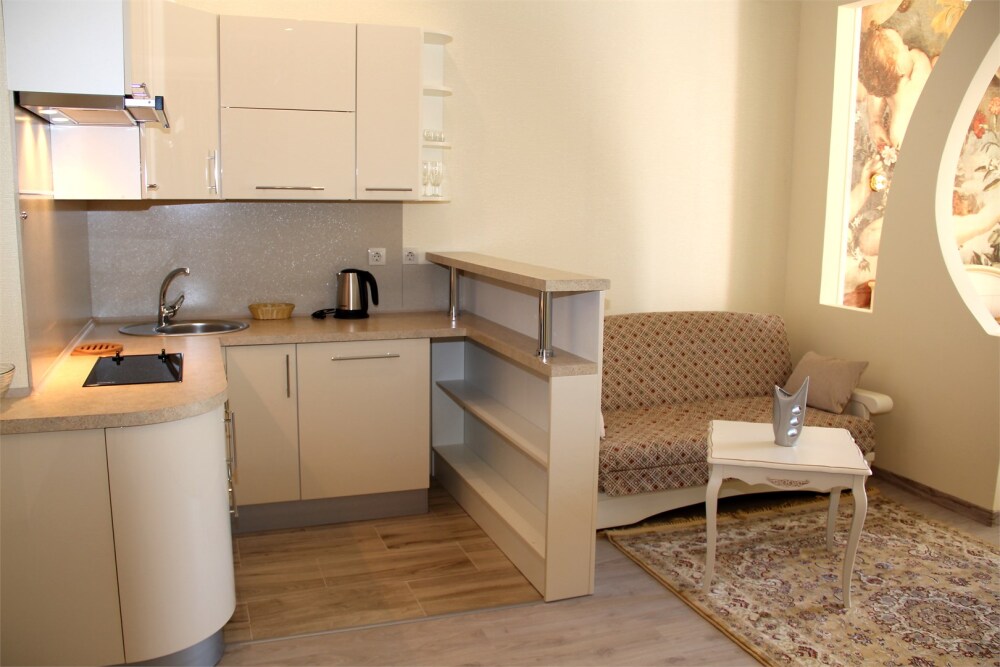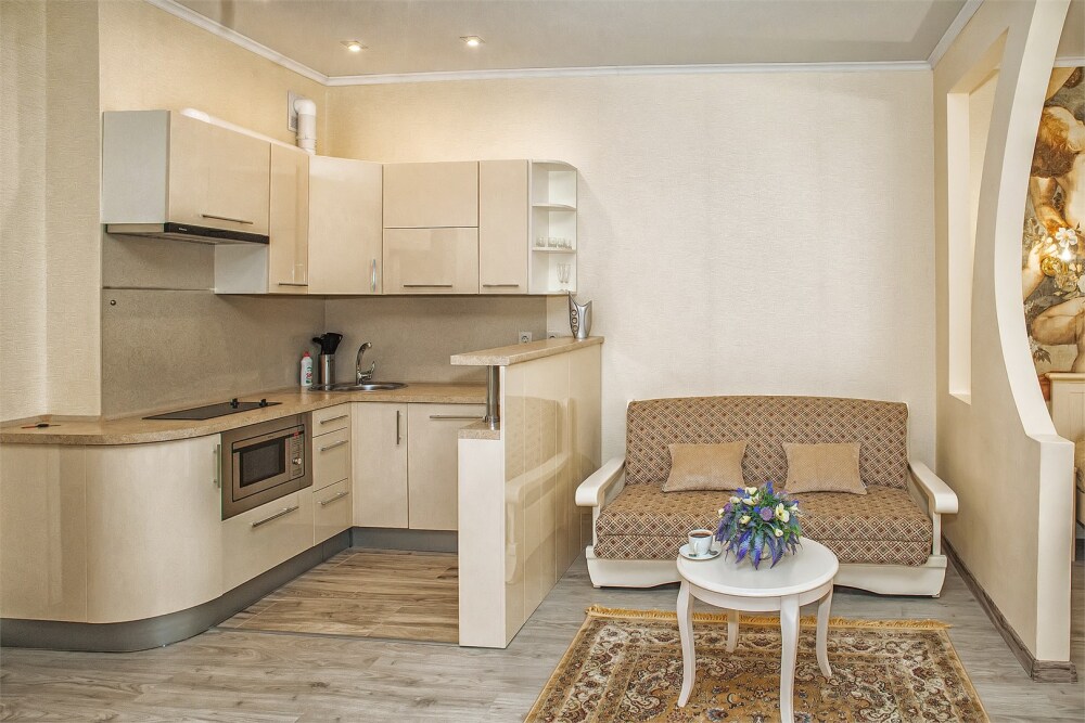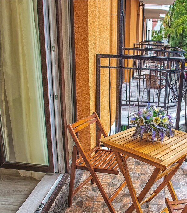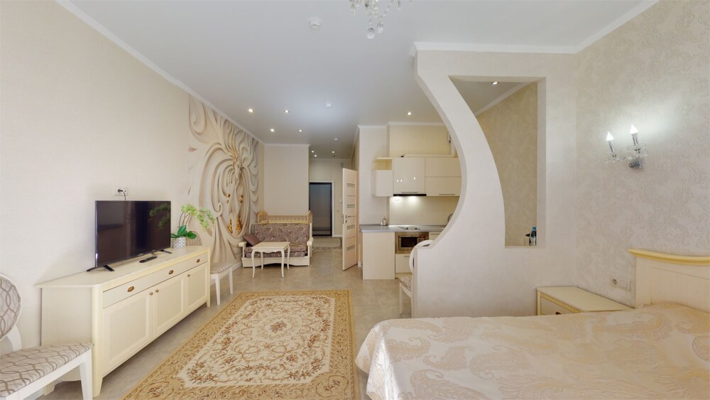 Апартаменты- студия с балконом оснащены кондиционером, телевизором с плоским экраном и кабельными каналами. Бесплатный Wi-Fi В апартаментах обустроены гостиная и обеденная зона. Двуспальная кровать с ортопедическим матрасом и диван -кровать. В числе удобств мини-кухня с микроволновой печью, холодильником и чайником. В распоряжении гостей собственная ванная комната с тапочками и феном. Гостям предоставляются полотенца и постельное белье. Для доступа к верхним этажам работает лифт.