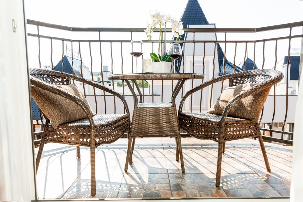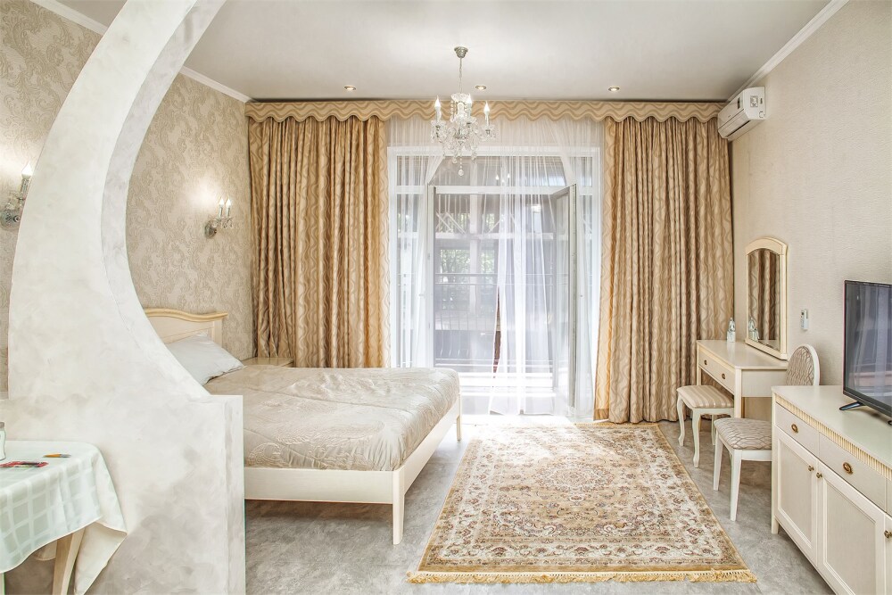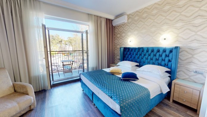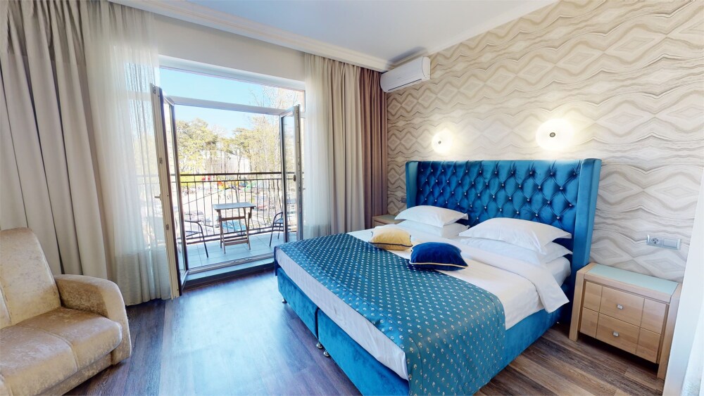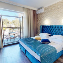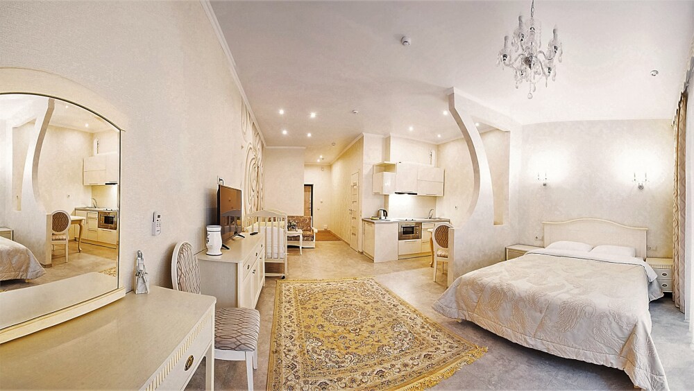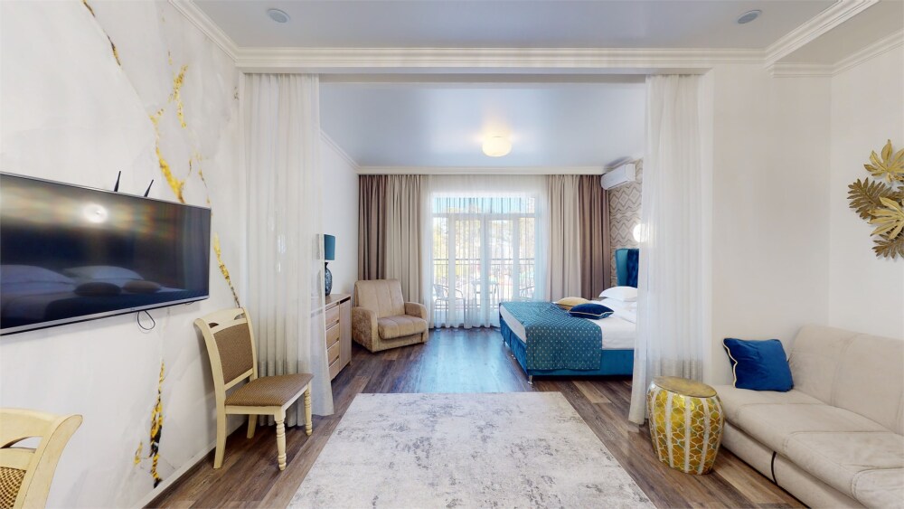 Апартаменты с балконом Делюкс оформлены в светлых тонах, оснащены кондиционером, телевизором с плоским экраном и кабельными каналами. Бесплатный Wi-Fi В апартаментах обустроены гостиная и обеденная зона. Большая двуспальная кровать с ортопедическим матрасом , диван -кровать и раскладное кресло удобное для сна. В числе удобств мини-кухня с микроволновой печью, холодильником и чайником.