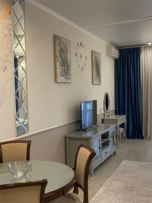 Для приема гостей и проведения досуга — обеденный стол со стульями, журнальный столик, телевизор;