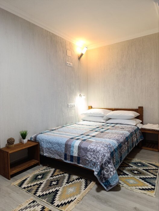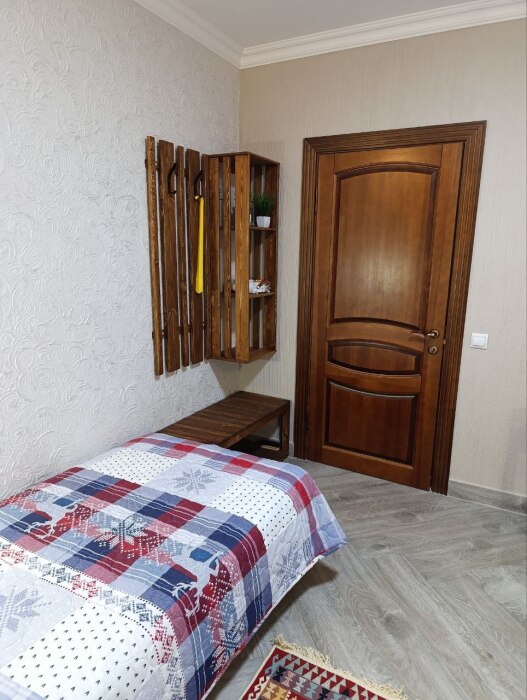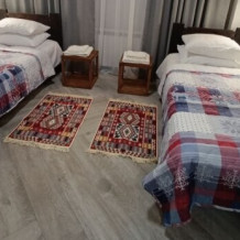 Номер 2 трехместный (семейный), 1 двуспальная 140х200 см., 1 односпальная 90х200 см. деревяные кровати с ортопедическими матрасами, гипоаллергенные подушки, шерстяные одеяла, сушилка для обуви, сенсорное мусорное ведро, фен для волос, бактерицидный рециркулятор для обеззараживания воздуха, возможно дополнительное спальное место, прихожая, отдельный санузел, общая кухня-столовая 22,9 м2. (цокольный этаж)