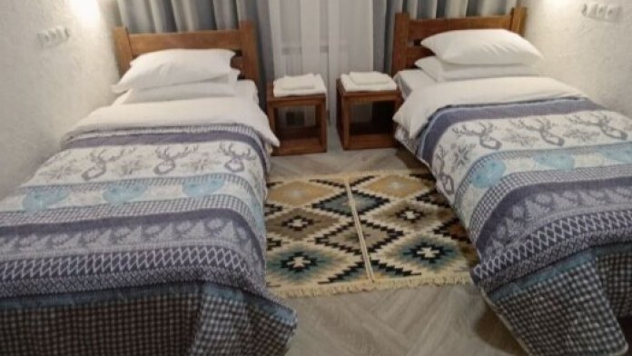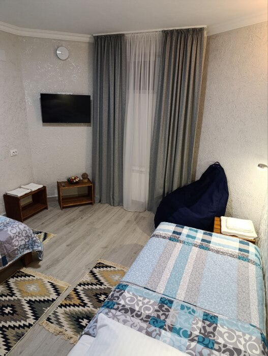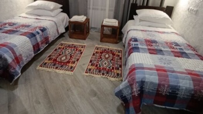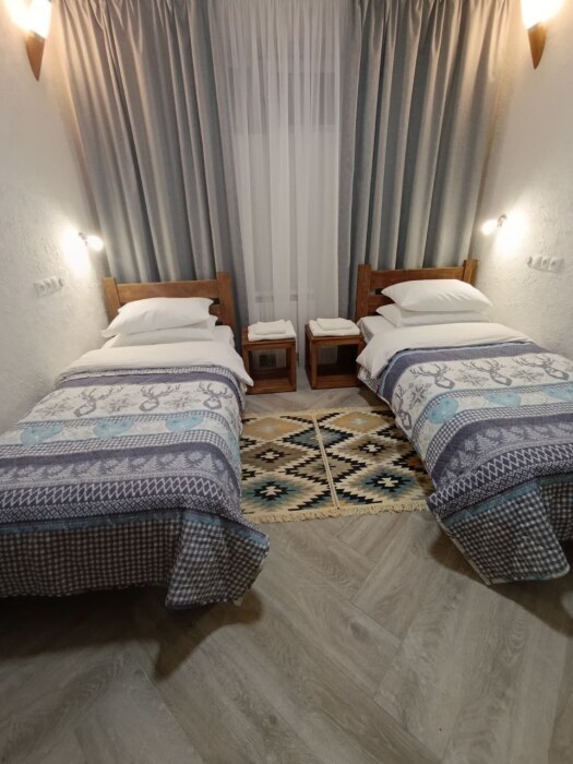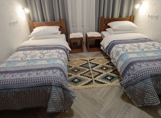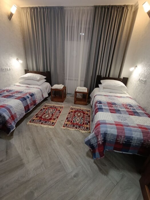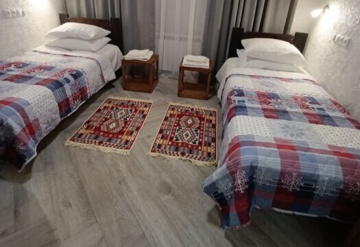 Номер 3 двухместный, 2 односпальные деревяные кровати с ортопедическими матрасами 90х200 см., гипоаллергенные подушки, шерстяные одеяла, сушилка для обуви, сенсорное мусорное ведро, фен для волос, бактерицидный рециркулятор для обеззараживания воздуха, прихожая, санузел в блоке, общая кухня-столовая 22,9 м2. (цокольный этаж)