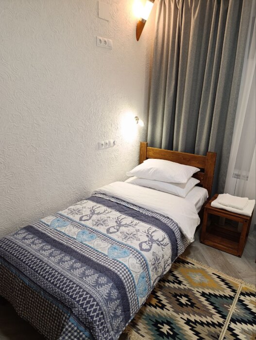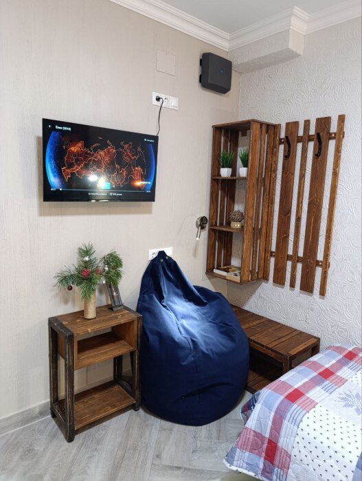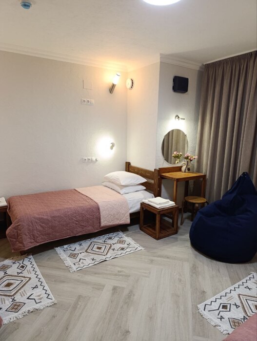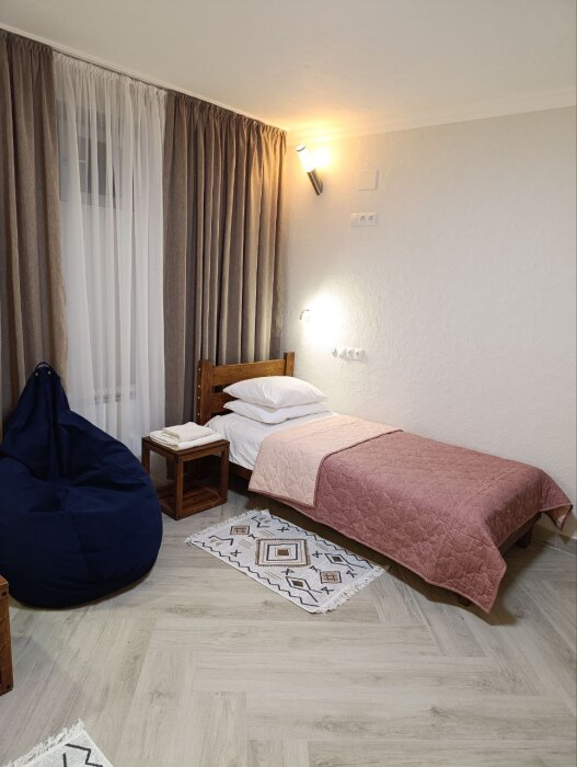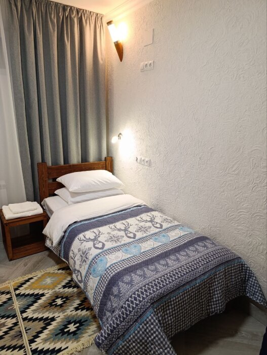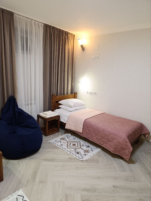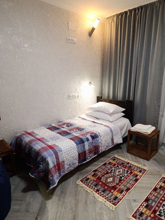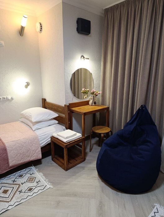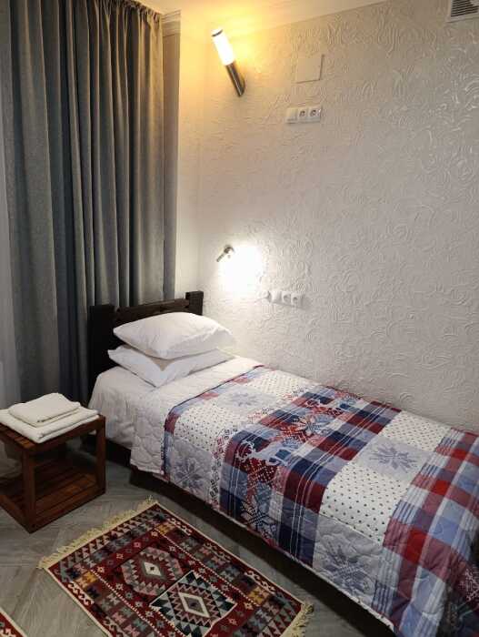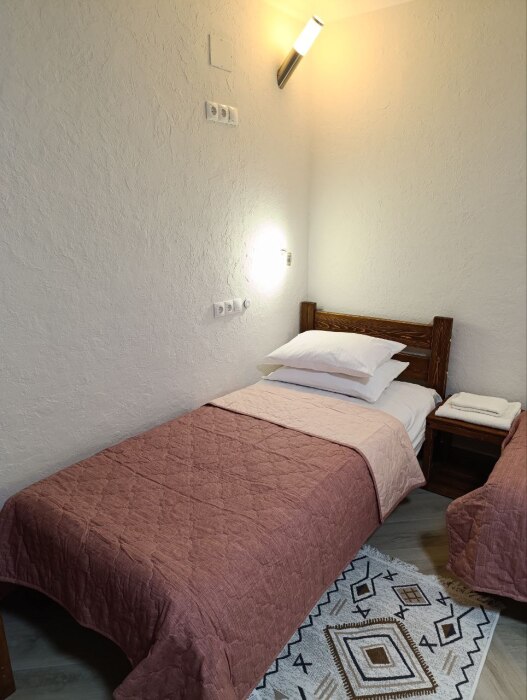Номер 4 трехместный, 3 односпальные деревяные кровати с ортопедическими матрасами 90х200 см., гипоаллергенные подушки, шерстяные одеяла, сушилка для обуви, сенсорное мусорное ведро, фен для волос, бактерицидный рециркулятор для обеззараживания воздуха, прихожая, санузел в блоке, общая кухня-столовая 22,9 м2. (цокольный этаж)