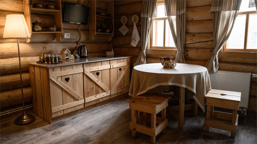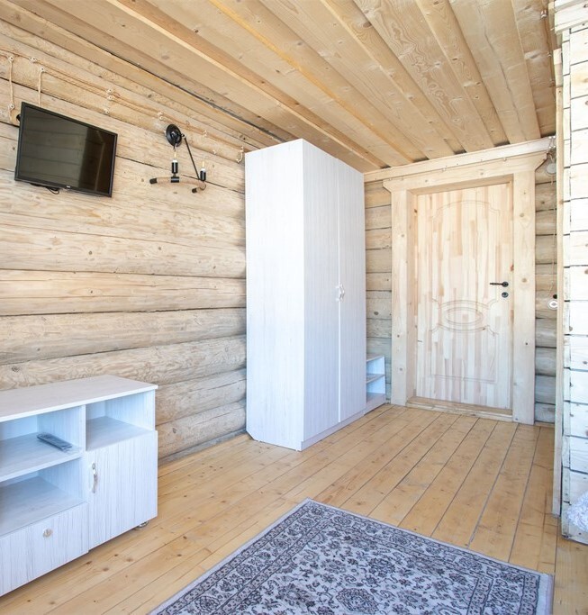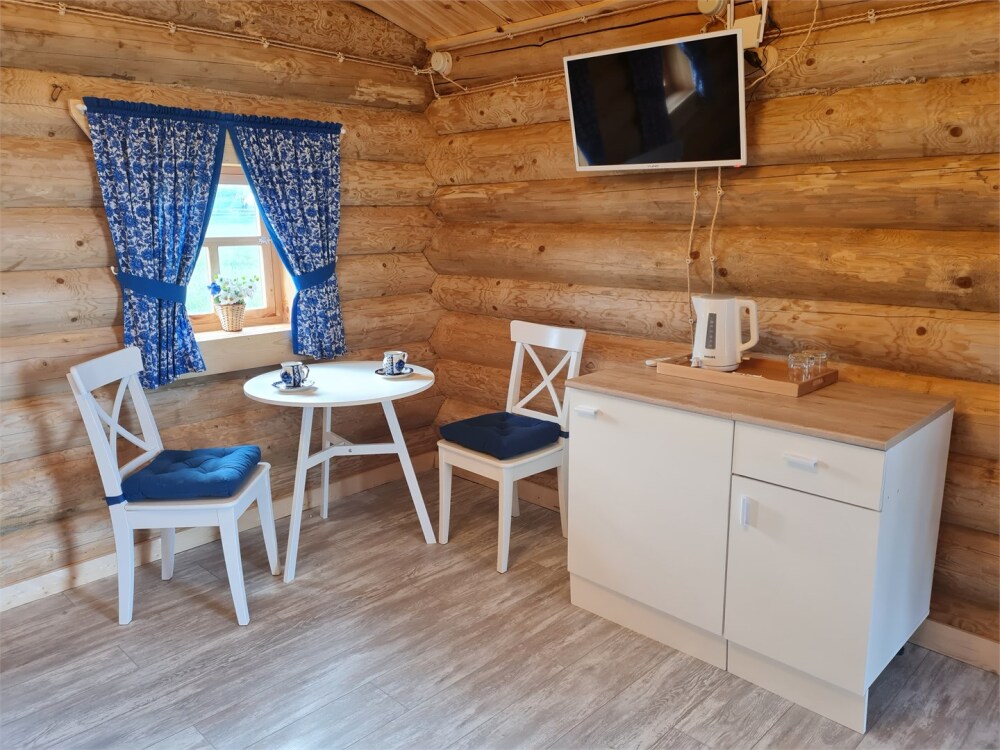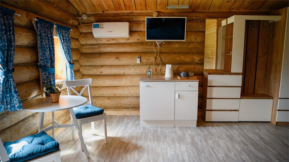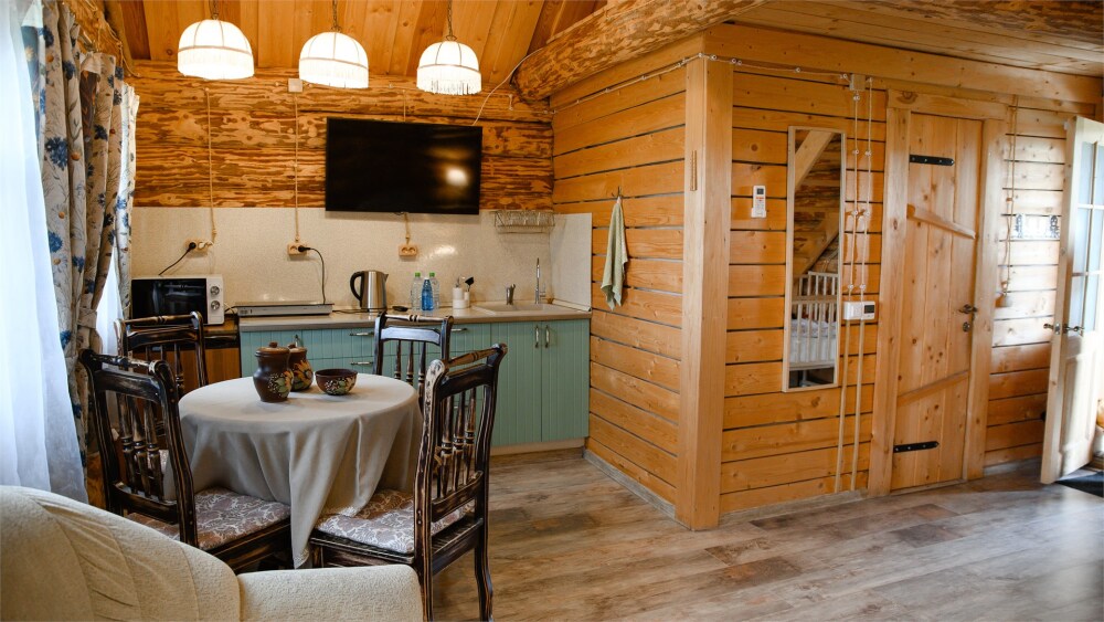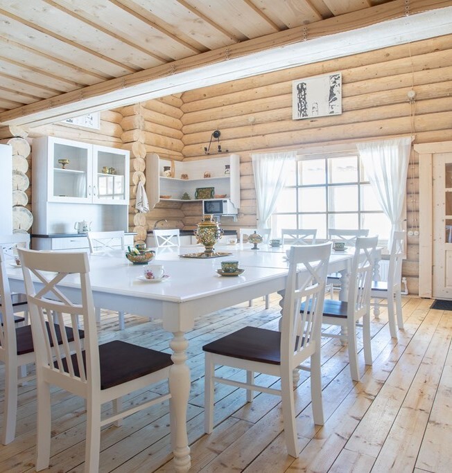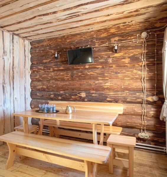 Отдельно стоящий дом из бревна с теплыми полами, санузлом, дизайнерский интерьер в стиле русских традиций, мангальная зона, стол, лавочки возле горницы.