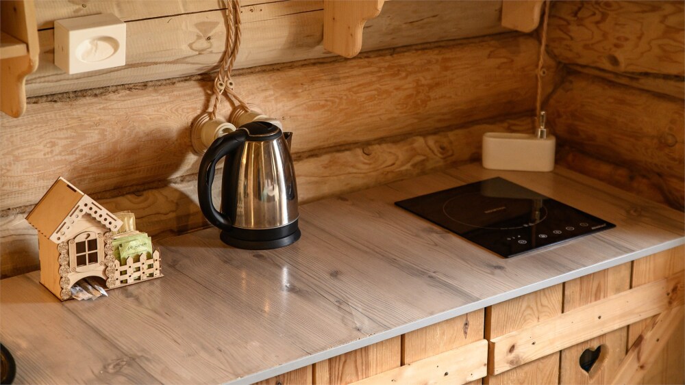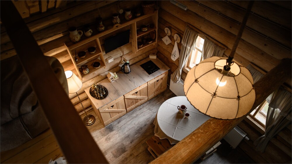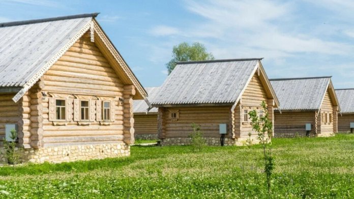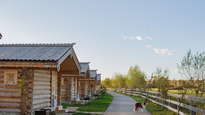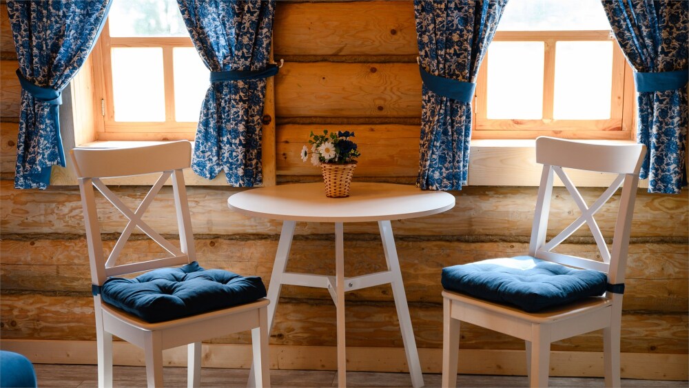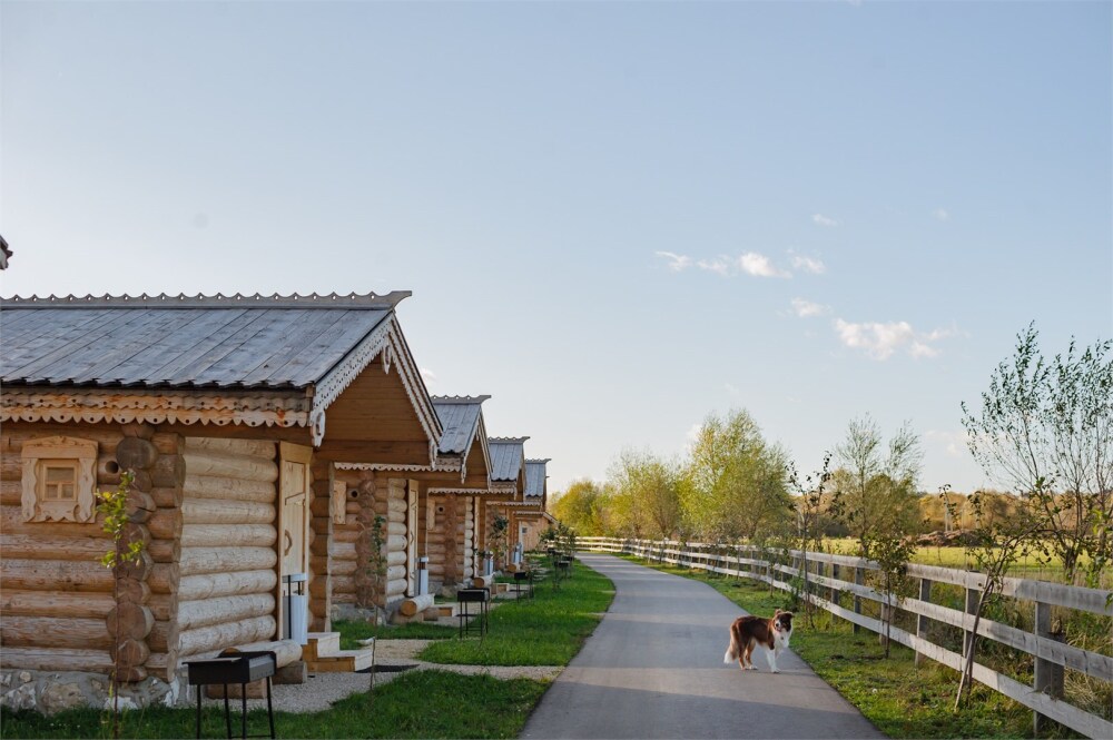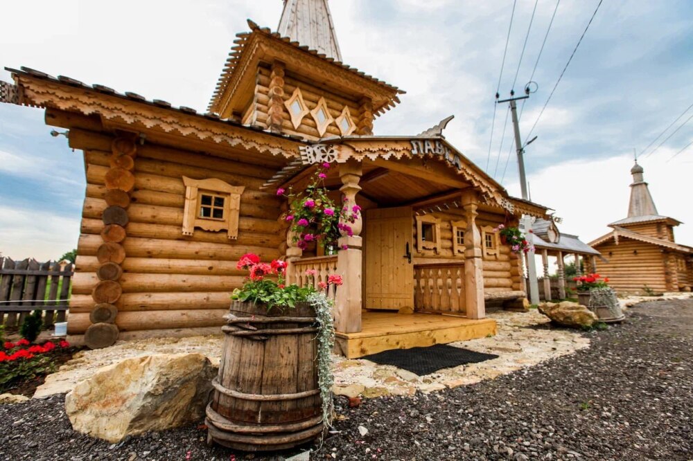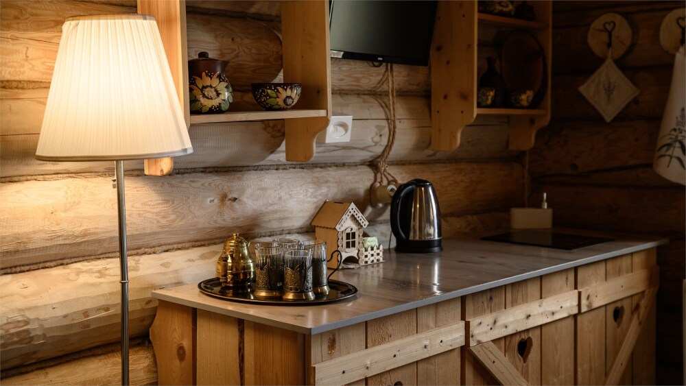 Отдельно стоящий дом из бревна с теплыми полами, санузлом, дизайнерский интерьер в стиле русских традиций, мангальная зона, стол, лавочки возле горницы.
