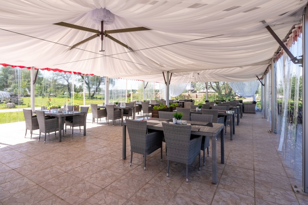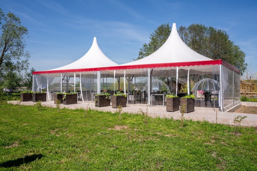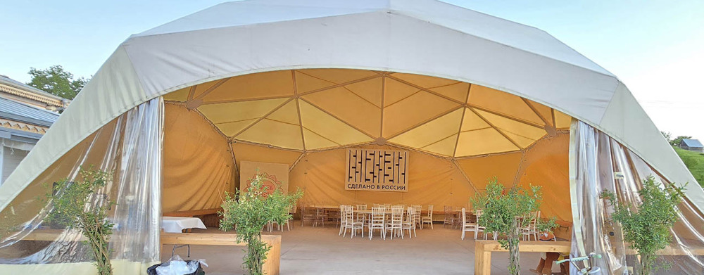 На территории располагается шатер «Царский», отлично подходящий для среднего количества гостей и шумных празднеств. Проведите незабываемое мероприятие для своих близких и друзей с видом на реку Юшунка, а затем разместите их для отдыха в наших комфортных деревянных избах с аутентичной атмосферой. Вместительный шатер для мероприятий на берегу Графского пруда и прекрасным видом на Крестьянскую усадьбу идеально подходит для проведения самых важных событий в вашей жизни - свадьбы, юбилеи, дни рождения, так и для корпоративных вечеринок и конференций.